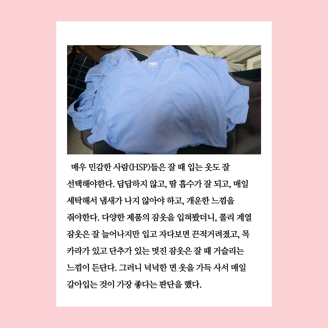 HSP(매우 민감한 사람)는 옷, 음식, 냄새, 촉감 등에서 예민하게 반응한다. 남편은 특히 냄새와 촉감에 민감하고, 사람을 보는 ‘촉’이 매우 좋다. 사실 나 역시 초예민에 가까워서 남편의 민감함을 잘 이해한다. 그래서 함께 살기 시작한 뒤에 규칙을 세웠다. 수건은 한 번만 사용하기, 잠옷은 매일 갈아입기, 화장실에 다녀오면 속옷을 바로 갈아입기. 그러다 보니 어느 순간 세탁 바구니가 매일 가득 찬다. 그럼에도 매일 남편이 보송보송한 옷을 입고 편안히 잠드는 걸 보면 기분이 참 좋다. 나도 잠옷을 하루에도 여러 번 갈아입는 사람이라, 그 보송함이 주는 행복을 잘 안다.