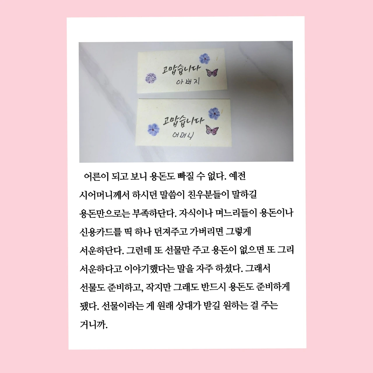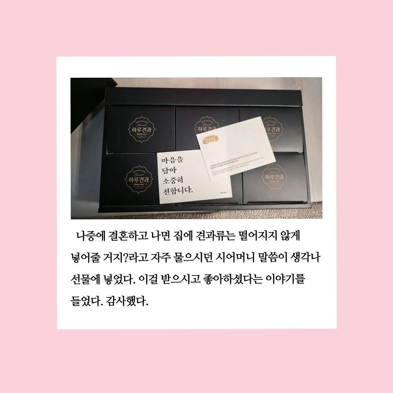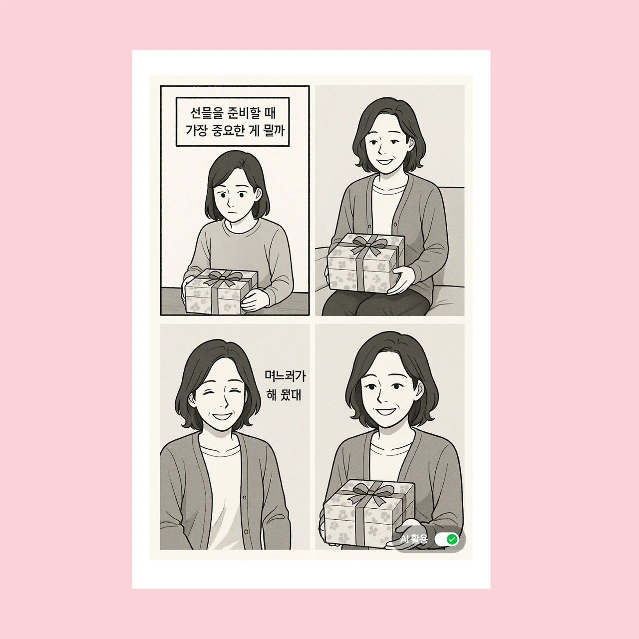 선물은 단순히 물건을 주고받는 행위가 아니라, 관계 안에서 서로의 존재를 확인하는 언어다. 그 안에는 사랑뿐 아니라, ‘인정받고 싶은 마음’과 ‘관계를 유지하고 싶은 욕구’가 함께 들어 있다. 나는 오랫동안 ‘좋은 며느리’이고 싶었기 때문에 무리할 때가 많았다. 어머니의 취향을 기억하고, 원하는 것을 미리 준비하는 것이 복받는 며느리라고 믿었기 때문이다. 그 믿음이 때로 나를 지치게 했지만, 이제는 그것이 사랑의 한 방식이었다는 것을 안다.