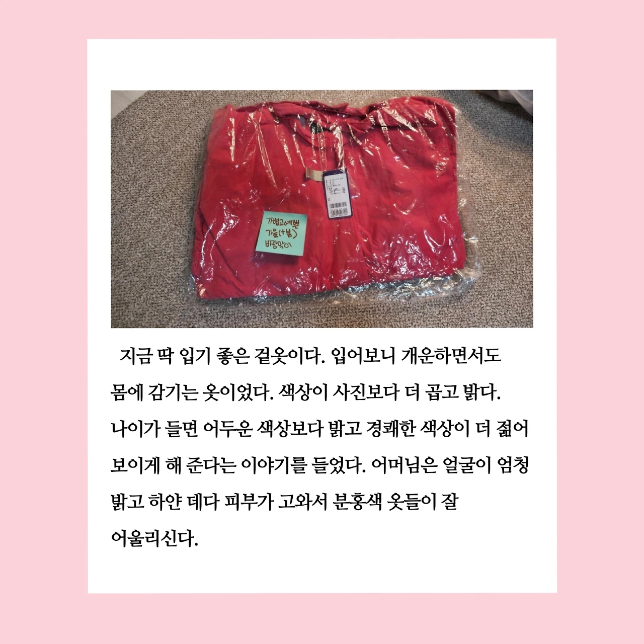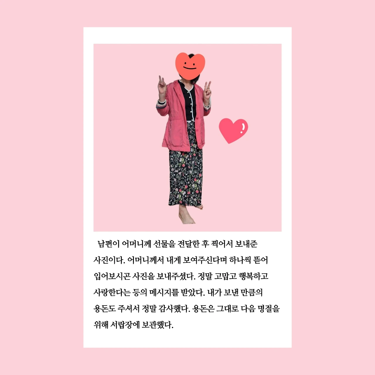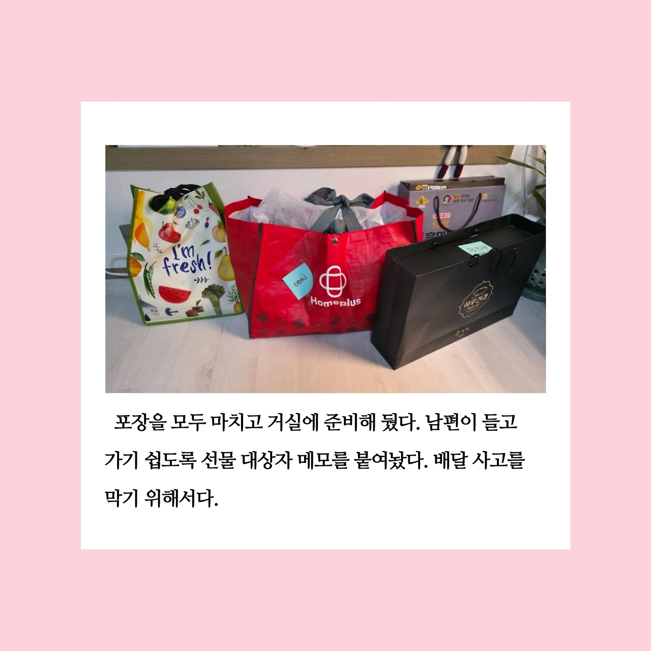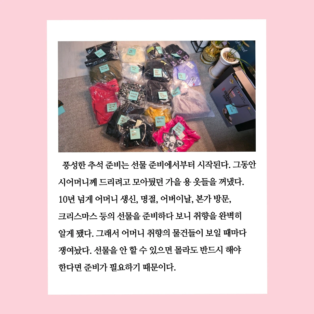 이번 명절도 이전에 준비했던 것처럼 준비했다. 항상 미리 다음 일정을 준비하기 때문에 이번처럼 무리 없이 준비할 수 있다. 한 사람과 오랫동안 연을 잇다 보면 상대의 취향과 원하는 것을 많이 알게 되니 편안하다. 선물을 받으신 어머니의 사진 속에서 행복한 표정으로 선물을 보시는 걸 보고 나도 기분이 좋아졌다. ‘선물하는 맛이 이런 거지, 선물이 이런 거지.’ 라는 생각이 들었다.