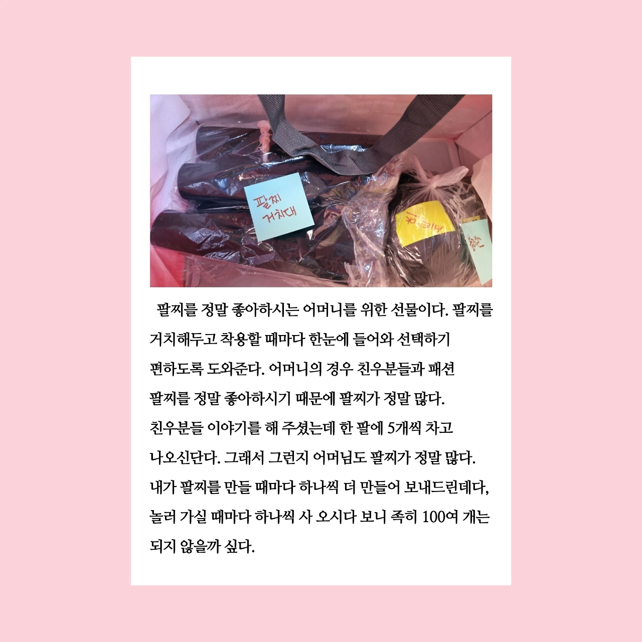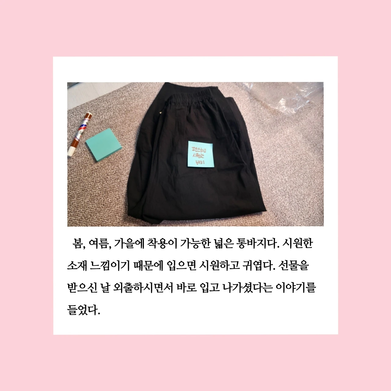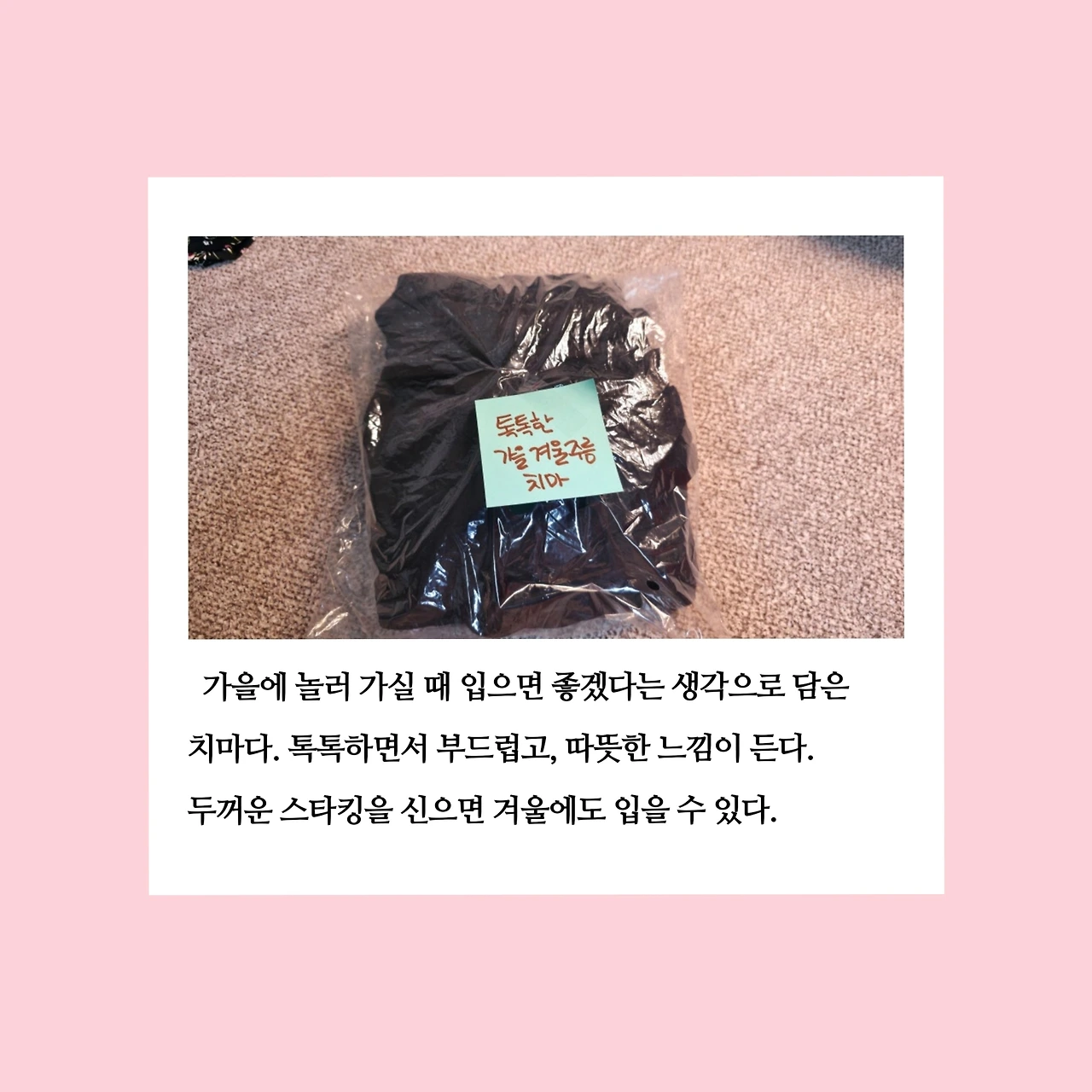 이번 명절도 이전에 준비했던 것처럼 준비했다. 항상 미리 다음 일정을 준비하기 때문에 이번처럼 무리 없이 준비할 수 있다. 한 사람과 오랫동안 연을 잇다 보면 상대의 취향과 원하는 것을 많이 알게 되니 편안하다. 선물을 받으신 어머니의 사진 속에서 행복한 표정으로 선물을 보시는 걸 보고 나도 기분이 좋아졌다. ‘선물하는 맛이 이런 거지, 선물이 이런 거지.’ 라는 생각이 들었다.