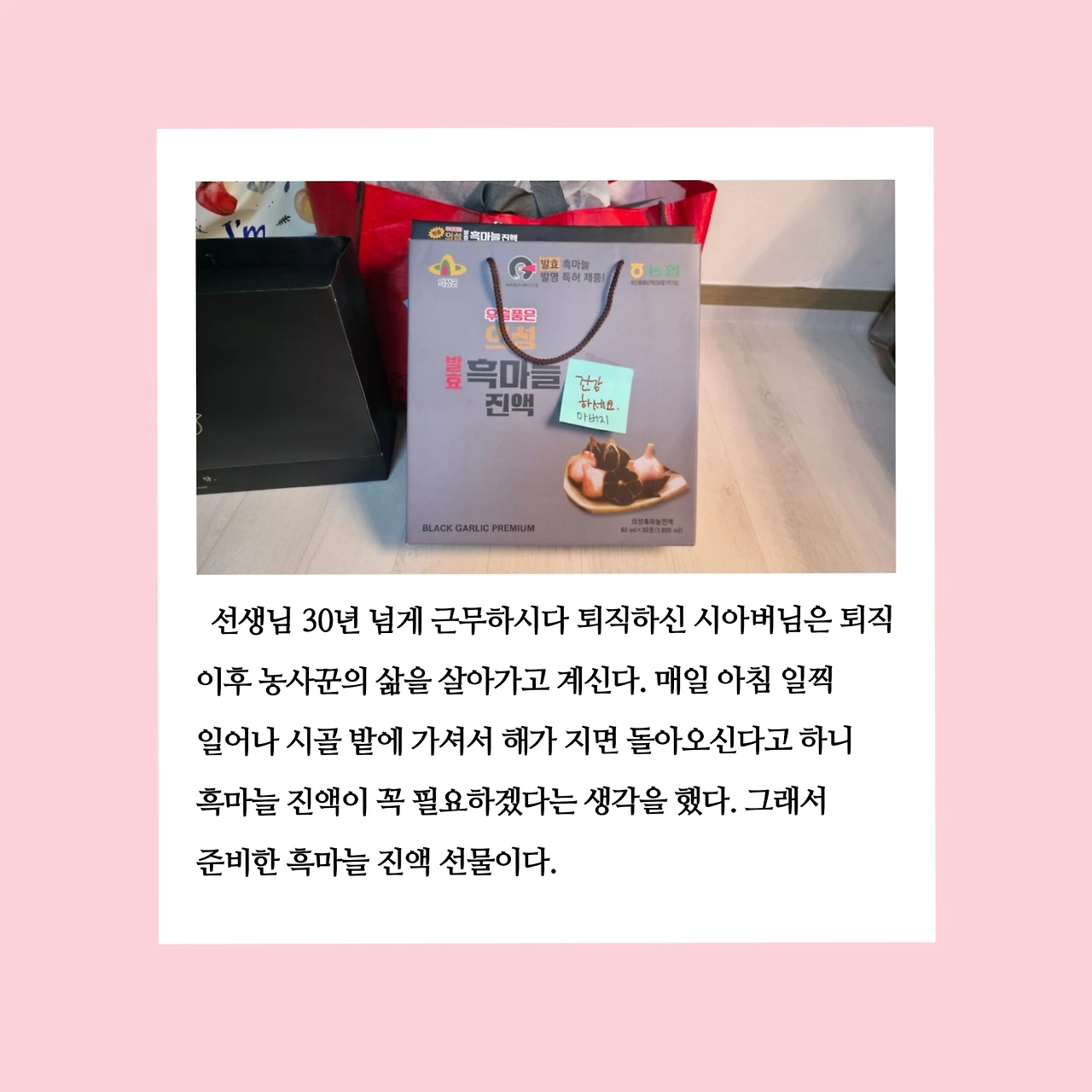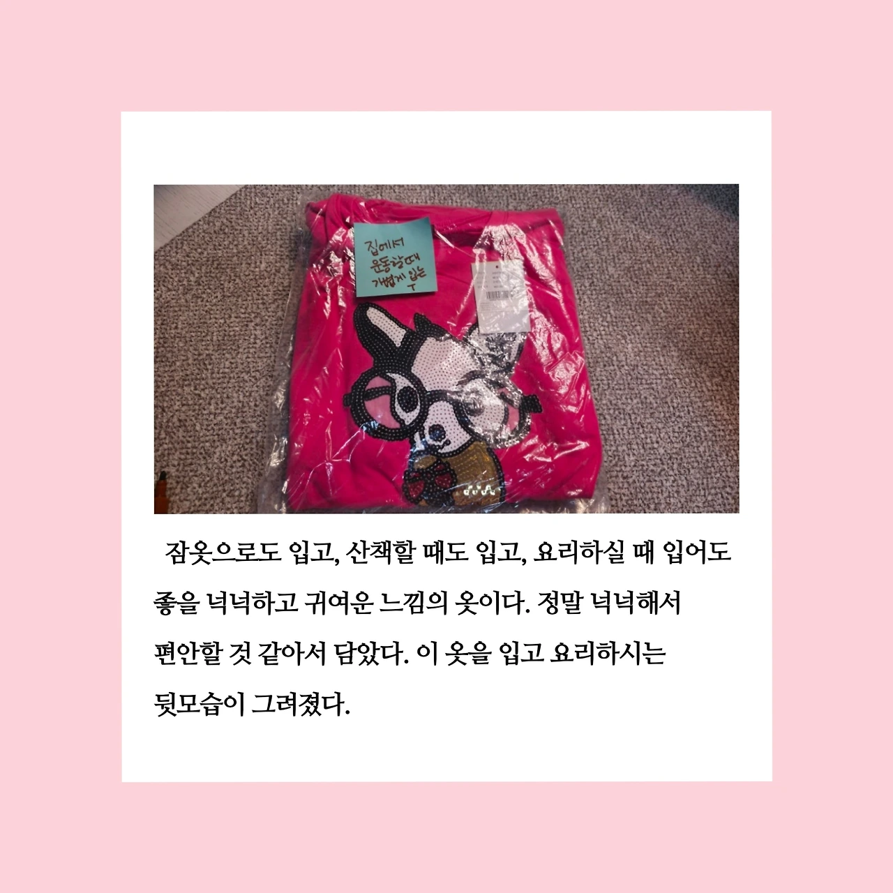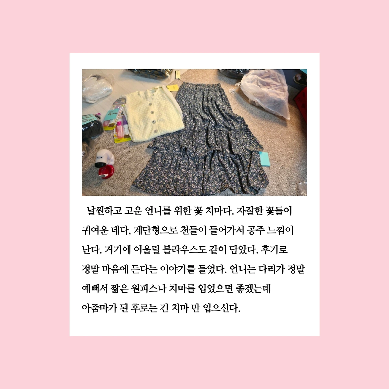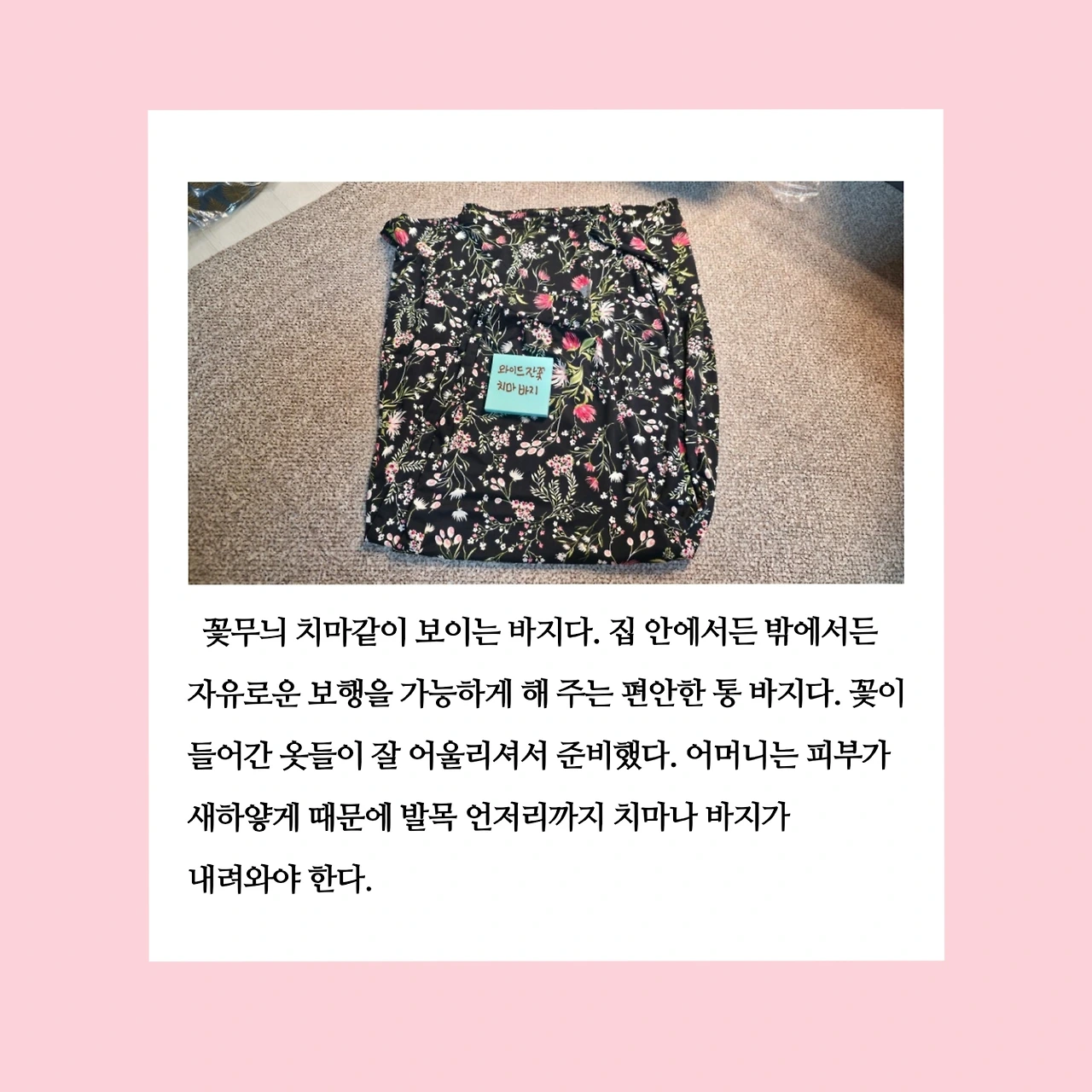 이번 명절도 이전에 준비했던 것처럼 준비했다. 항상 미리 다음 일정을 준비하기 때문에 이번처럼 무리 없이 준비할 수 있다. 한 사람과 오랫동안 연을 잇다 보면 상대의 취향과 원하는 것을 많이 알게 되니 편안하다. 선물을 받으신 어머니의 사진 속에서 행복한 표정으로 선물을 보시는 걸 보고 나도 기분이 좋아졌다. ‘선물하는 맛이 이런 거지, 선물이 이런 거지.’ 라는 생각이 들었다.