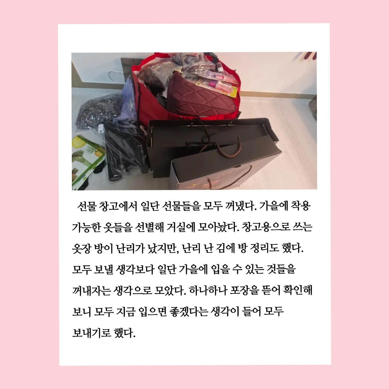 10년 넘게 어머니의 선물을 준비하면서 어머니의 취향을 정확히 알게 됐다. 그래서 선물을 준비하는 것이 더 이상 버겁지 않다. 이제는 어머니께서도 내게 선물을 주시니 고맙기 그지없다. 선물을 준비하면서 발견된 귀인을 위한 물건들도 이참에 포장해서 보내기도 했다. 따로 꺼내두고 언제쯤 보낼 수 있나 했더니 신기한 인연으로 연락이 닿았다. 그래서 필요 여부를 물은 후 선물 포장을 했다. 덕분에 장롱에 공간이 많이 생겨서 기분 좋다.