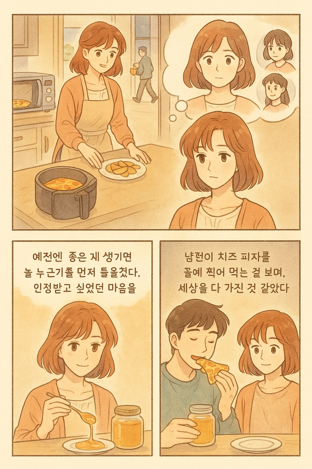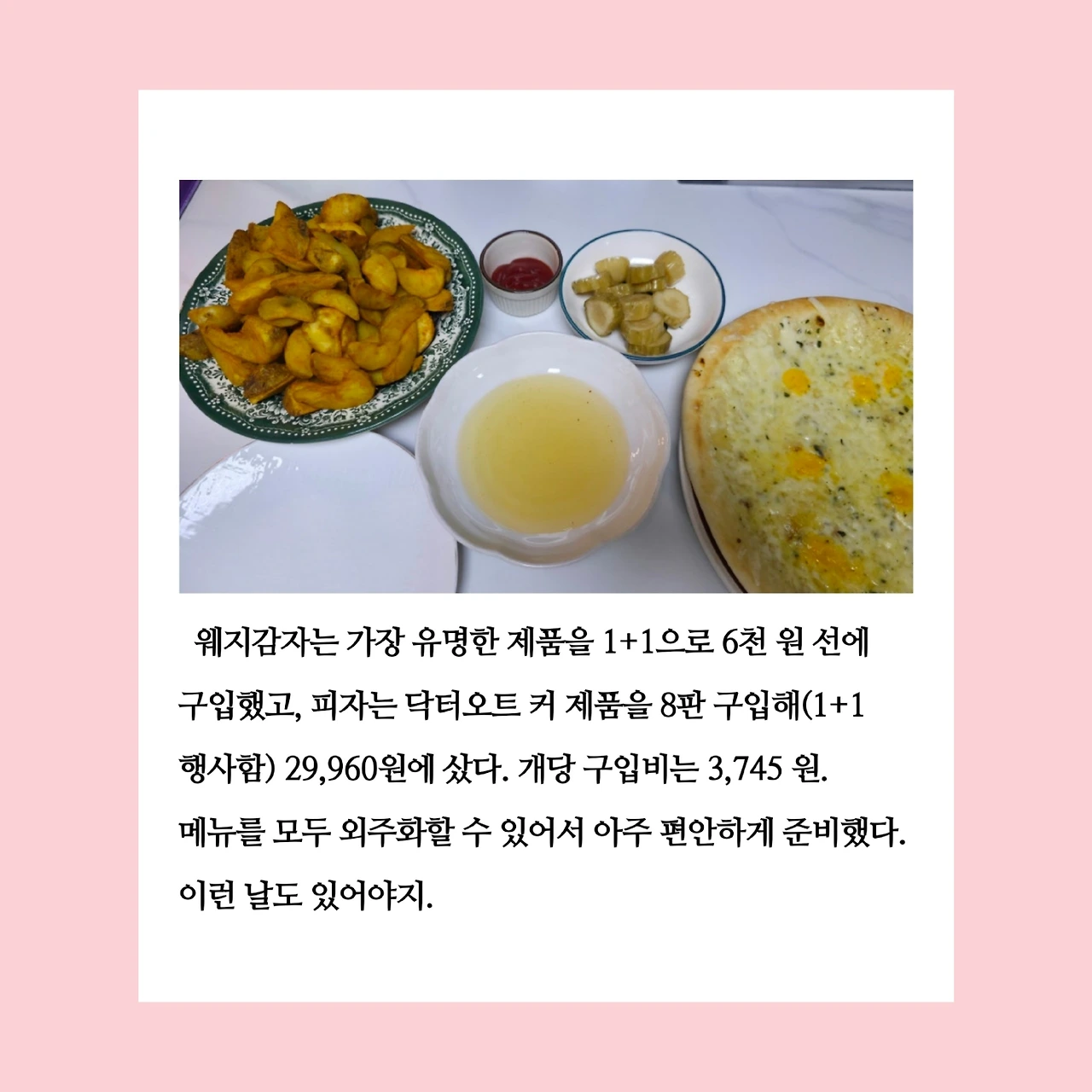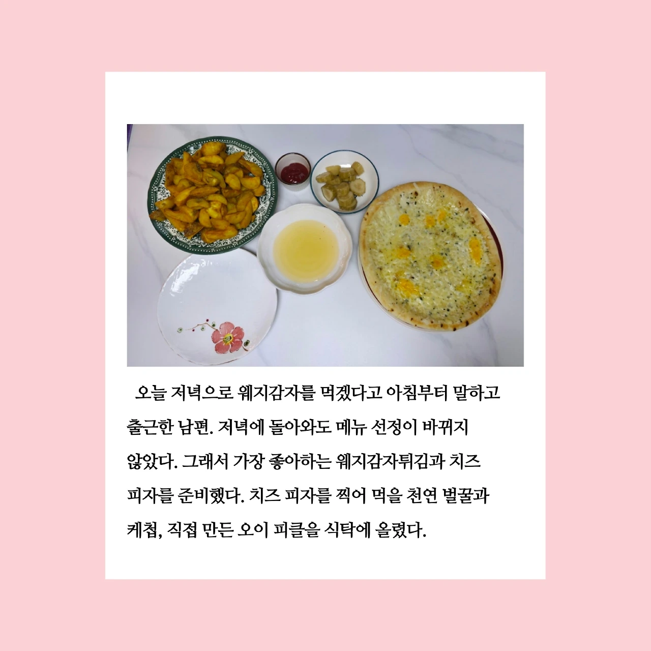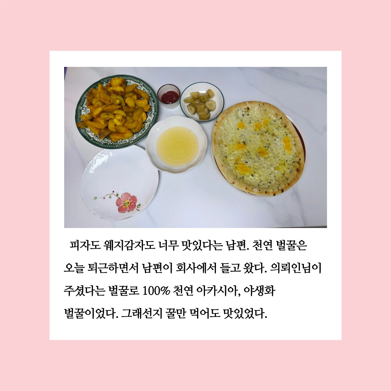 오늘 저녁 식사는 외주화 했다. 아침부터 “웨지감자튀김이 먹고 싶다.”라고 말한 남편이 퇴근 후에도 그 마음을 바꾸지 않았다. 집으로 들어온 남편의 손에는 의뢰인 님이 주셨다는 귤 한 박스와 꿀 한 병이 들려 있었다. 꿀을 보는 순간, 문득 치즈 피자가 떠올랐다. 꿀에 찍어 먹으면 맛있겠다는 생각을 했고, 그대로 실행에 옮겼다. 피자는 전자레인지에, 감자는 에어프라이어에 돌렸다. 외주화 덕분에 손쉽게 저녁상이 차려졌다.