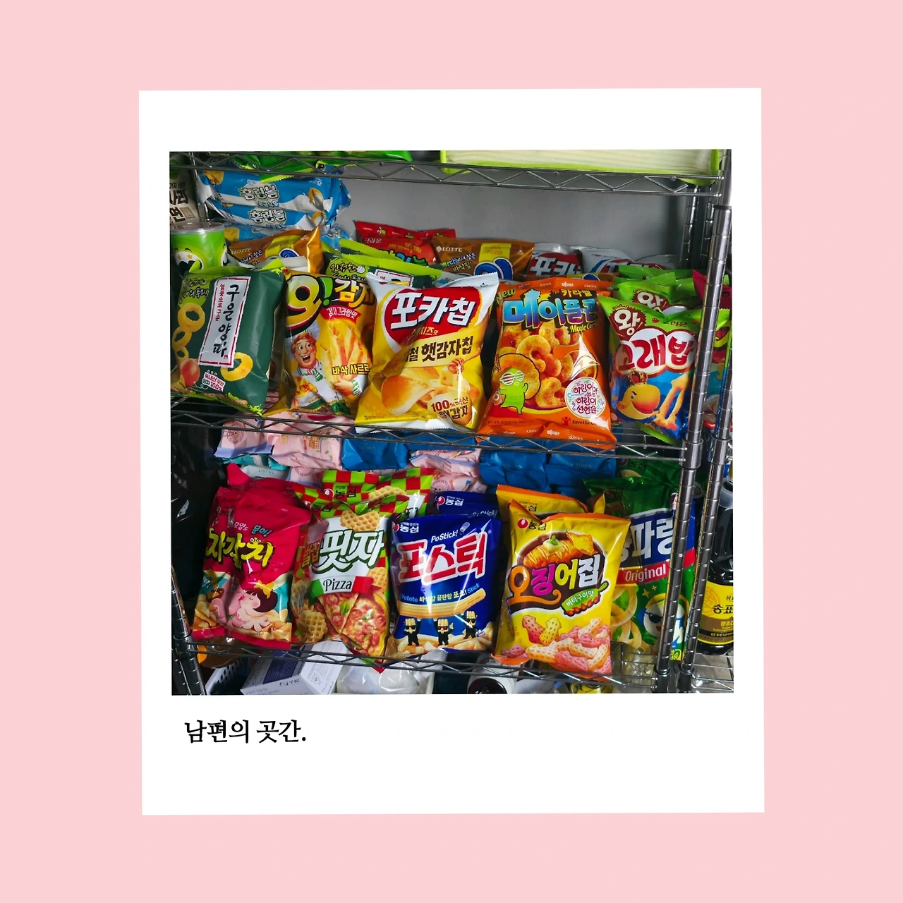과자를 잔뜩 쌓아놓고도 밥을 잘 먹어서 그런지 정작 과자는 먹지 않고 있다. 결핍되면 더 먹고 싶어 진다는 말처럼, 창고에 과자와 음료를 가득 채워놓으니 오히려 잘 먹지 않게 된다. 남편 말로는 보기만 해도 배가 부르단다. 사실 저녁 식사가 맛있다며 밥 두 공기를 싹싹 비워내는 덕분에 남편 배에는 과자가 들어갈 공간이 없다. 그래서 남편은 과자를 먹을 수 있는 주말을 기다린다. 이런 남편의 모습이 귀여워서 또 한 번 웃게 된다.
