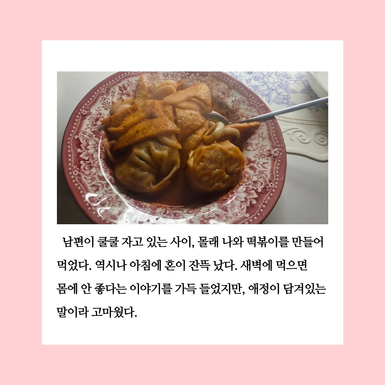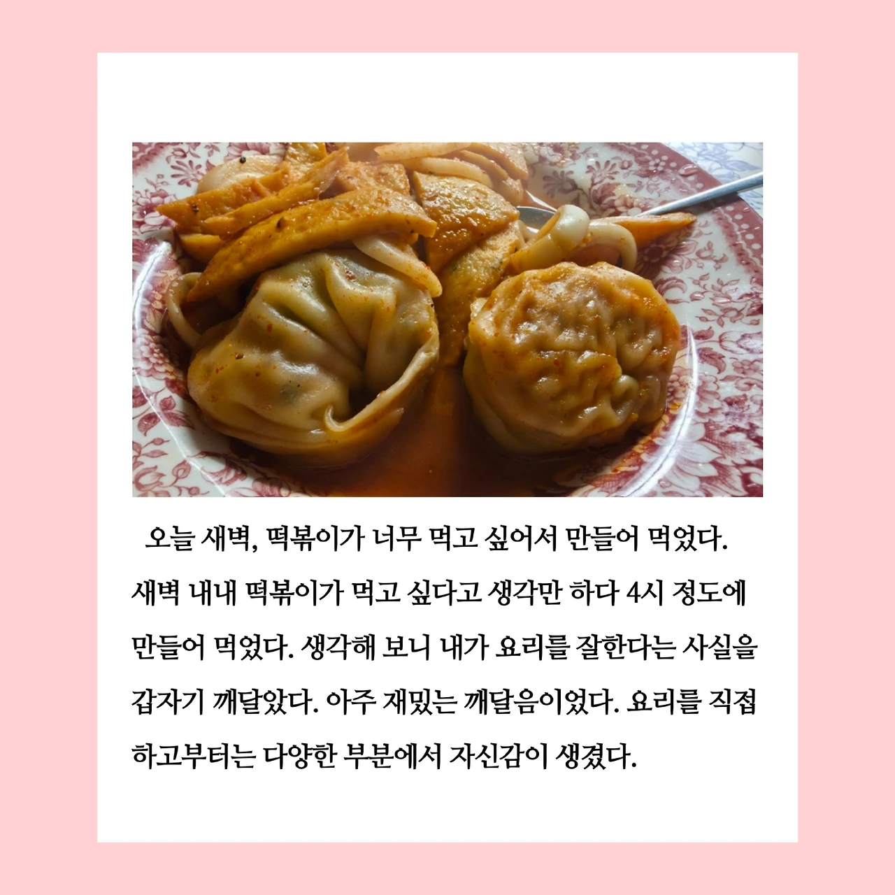 요리를 할 수 있고, 요리에 흥미가 있다는 게 요즘 따라 더 감사하게 느껴진다. 외식을 줄이고 집에서 해 먹으면 좋은 점이 많다. 직접 재료를 고르고(기왕 먹는 거 좋은 걸로), 원하는 맛으로 정성스럽게 만들 수 있다. 집에서 만들어 먹으면 돈도 아끼고, 몸도 편안해지고, 무엇보다 남편을 사랑으로 돌볼 수 있어 좋다. 종종 남편이 내게 “배고프면 제일 먼저 너랑 집이 떠올라.”라고 말한다. 이 말을 들을 때마다 마음이 참 따뜻해진다.