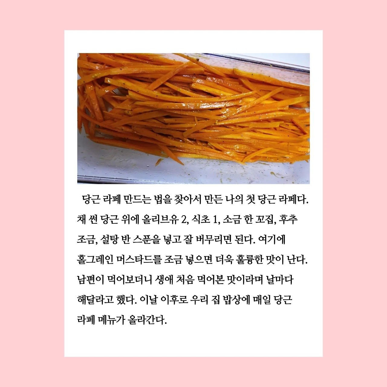 최근에 당근이 할인해서 가득 구입했다. 그래서 요즘 당근을 매일 먹고 있다. 당근을 매일 먹어서 그런지 눈이 더 맑아진 것 같은 기분이 든다. 당근이 많아져서 당근으로 할 수 있는 요리를 찾아보다 당근라페라는 걸 알게 됐다. 그래서 최근에 당근 라페를 처음 만들어봤다. 당근 라페의 재료들이 내가 좋아하는 재료들이라 더 좋았다. 당근라페의 가장 좋은 점은 엑스트라버진 올리브유와 천연 식초를 아주 자연스럽게 남편에게 먹일 수 있다는 것이다. 사실 남편이 당근을 가장 싫어하는 식재료라고 해서 그동안 일부러 구입조차 하지 않았었다. 그런데 며칠 전 처음 식탁에 올린 당근 라페를 맛보고는 이렇게 말했다.