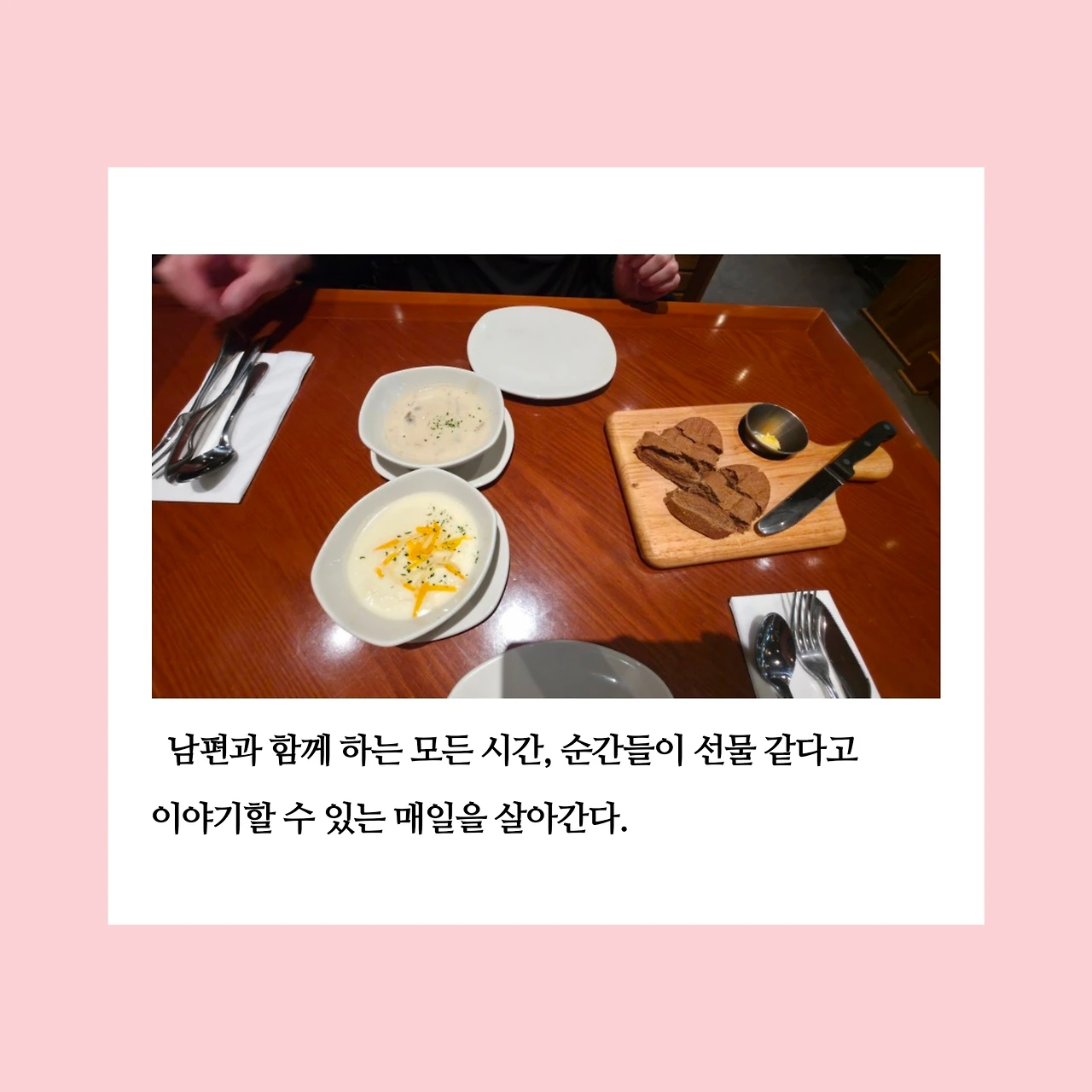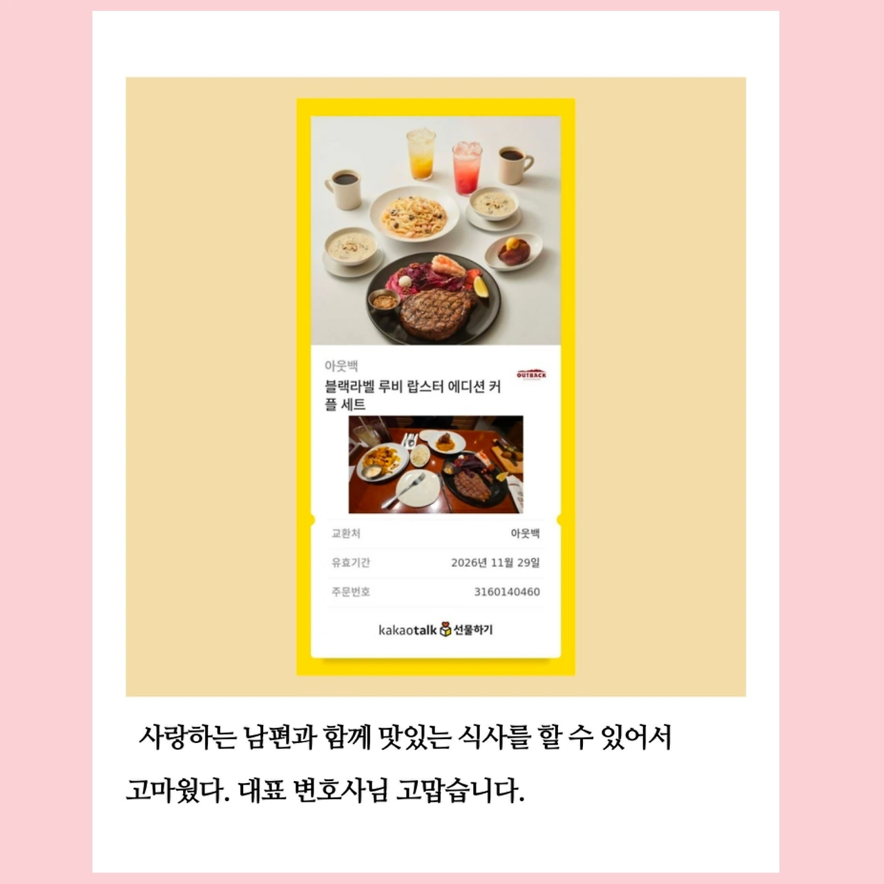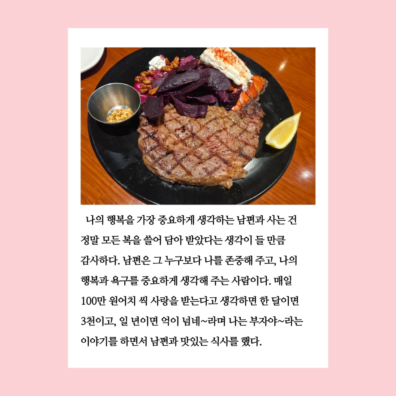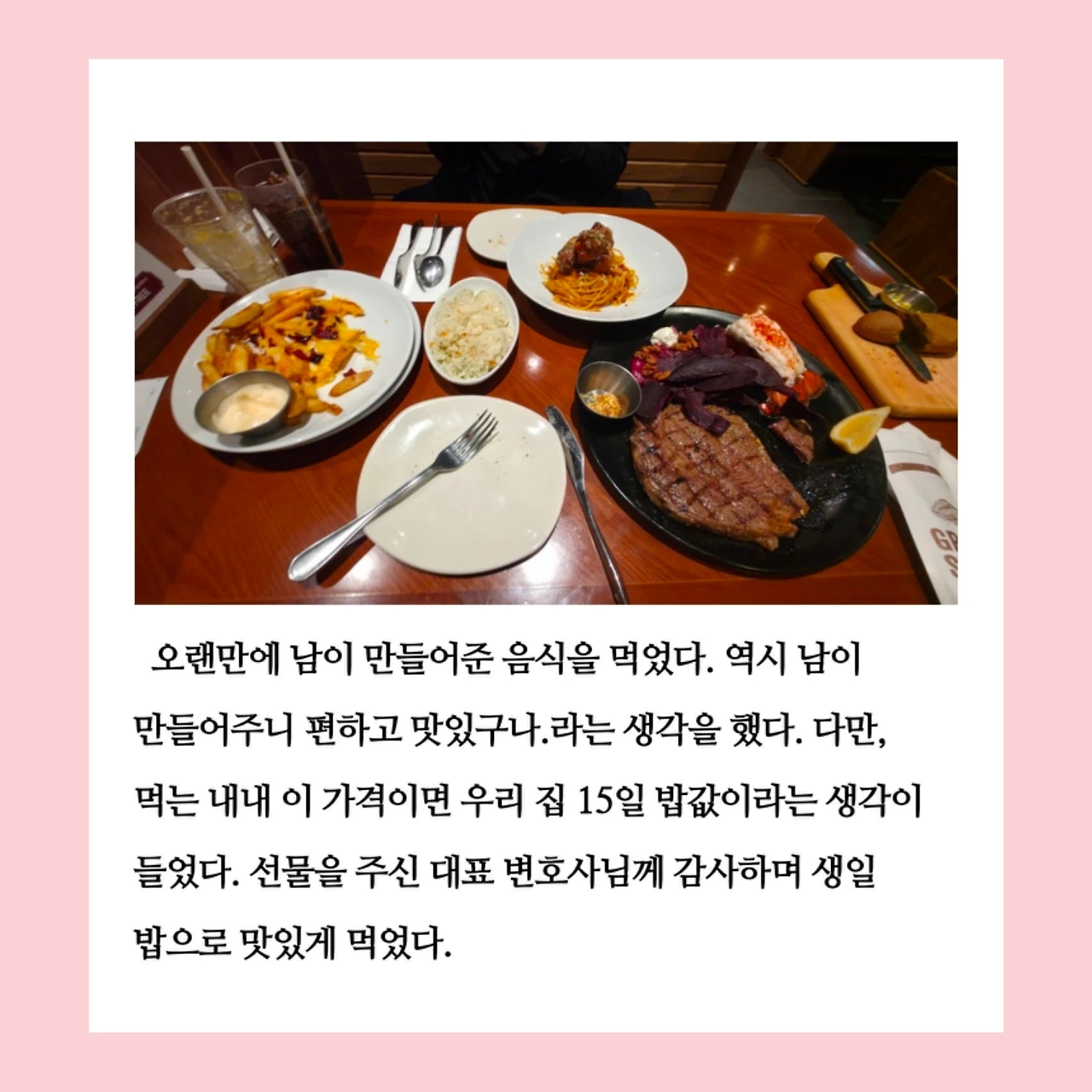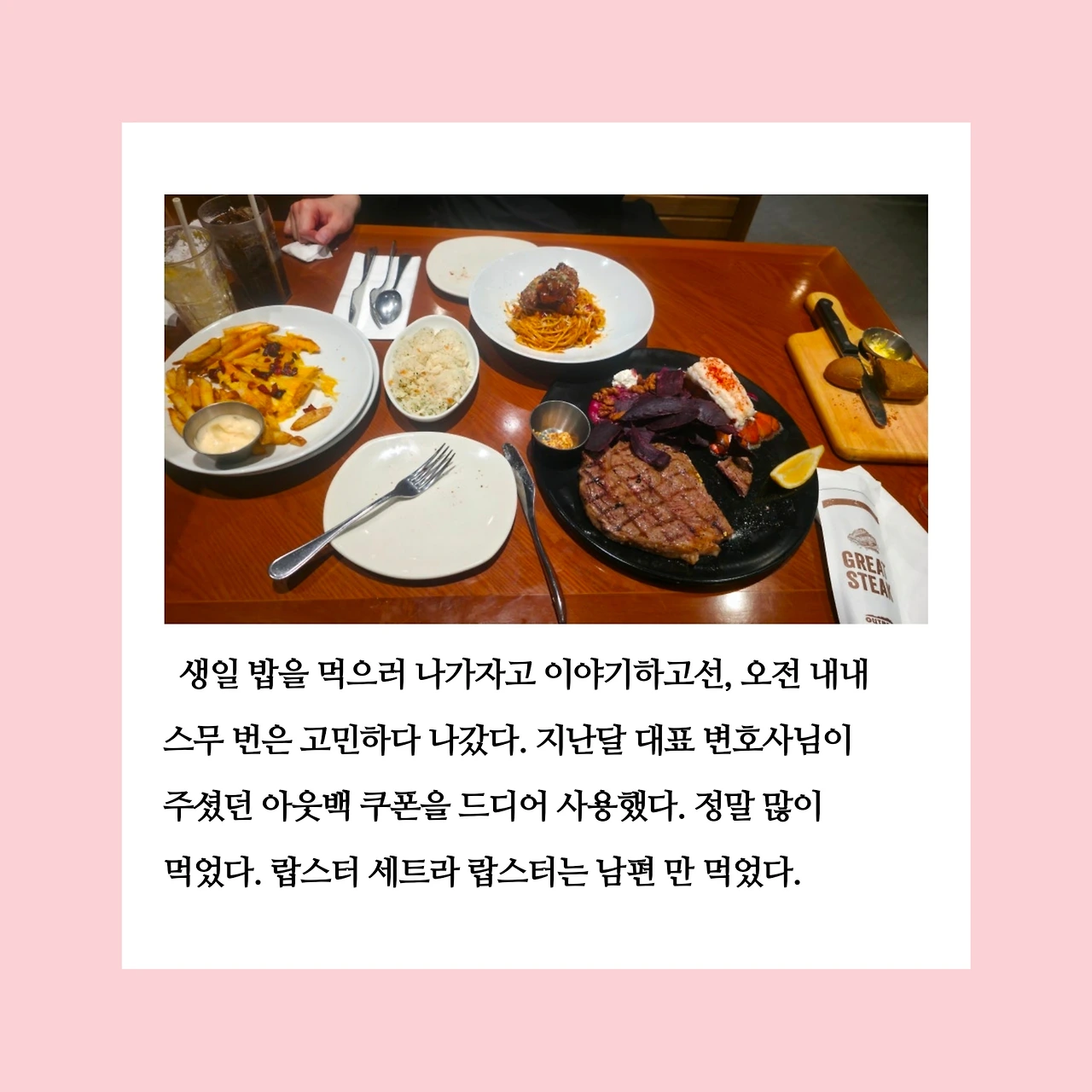 생일이 평일이라 생일 당일은 집에서 혼자 보냈기 때문에 남편은 꼭 함께 맛있는 걸 먹고 싶었단다. 쿠폰을 받고 나보다 더 잘 사용할 수 있을 것 같은 어머님이나 시누이 언니에게 줄까도 했었다. 그러나 그렇게 하면 내 선택이 남편의 경험을 빼앗는 일이 될 것 같아 그만두었다. 그 선택 덕분에 남편이 행복하게 먹는 모습을 보니 정말 잘했다는 생각이 들었다. 오늘의 나는 모든 선택에 있어 최우선으로 남편의 입장과 행복을 고려한 후 결정하고 있다. 남편을 생각한 선택이었을 뿐인데, 그 행복이 내게도 고스란히 돌아온다는 것이 참 감사하다.