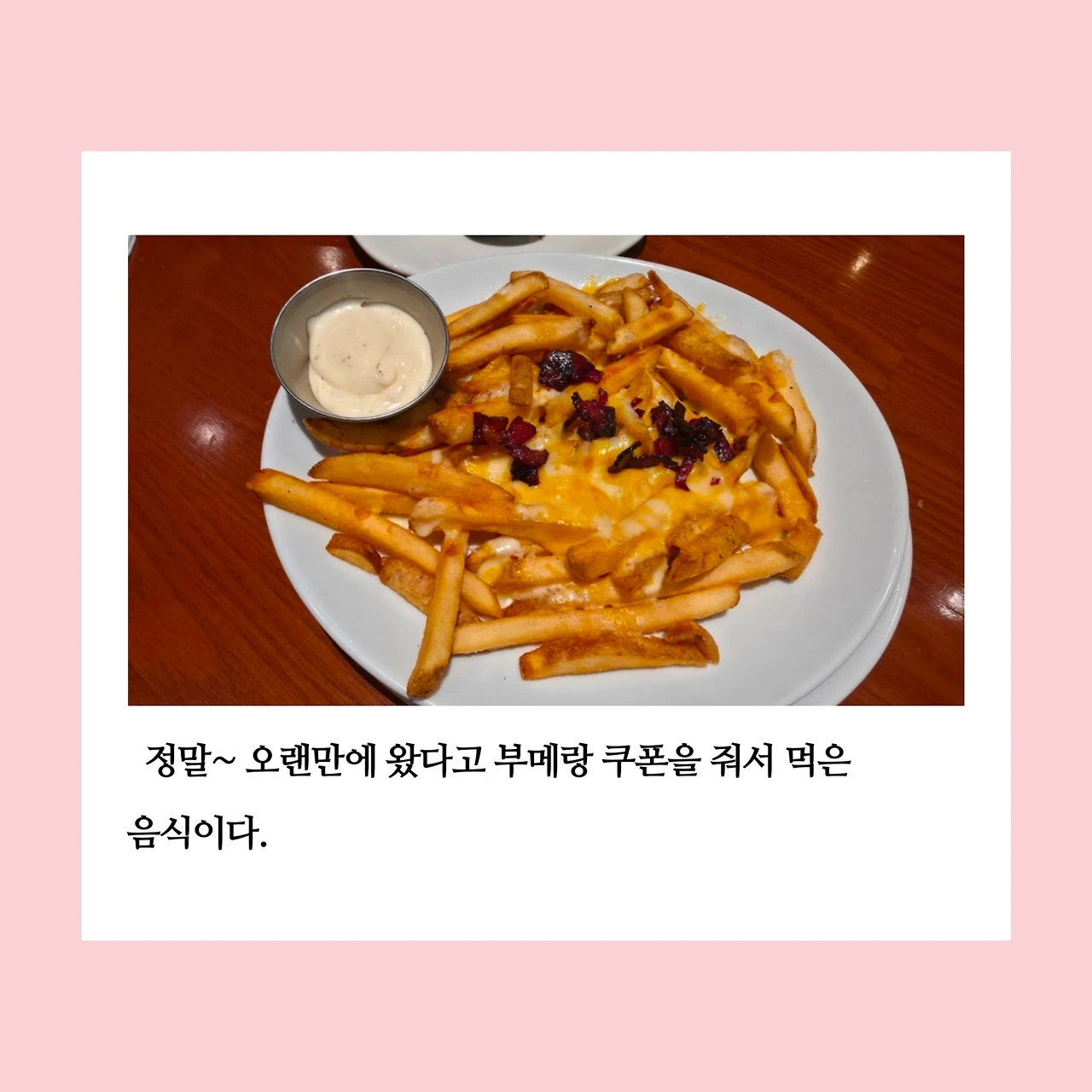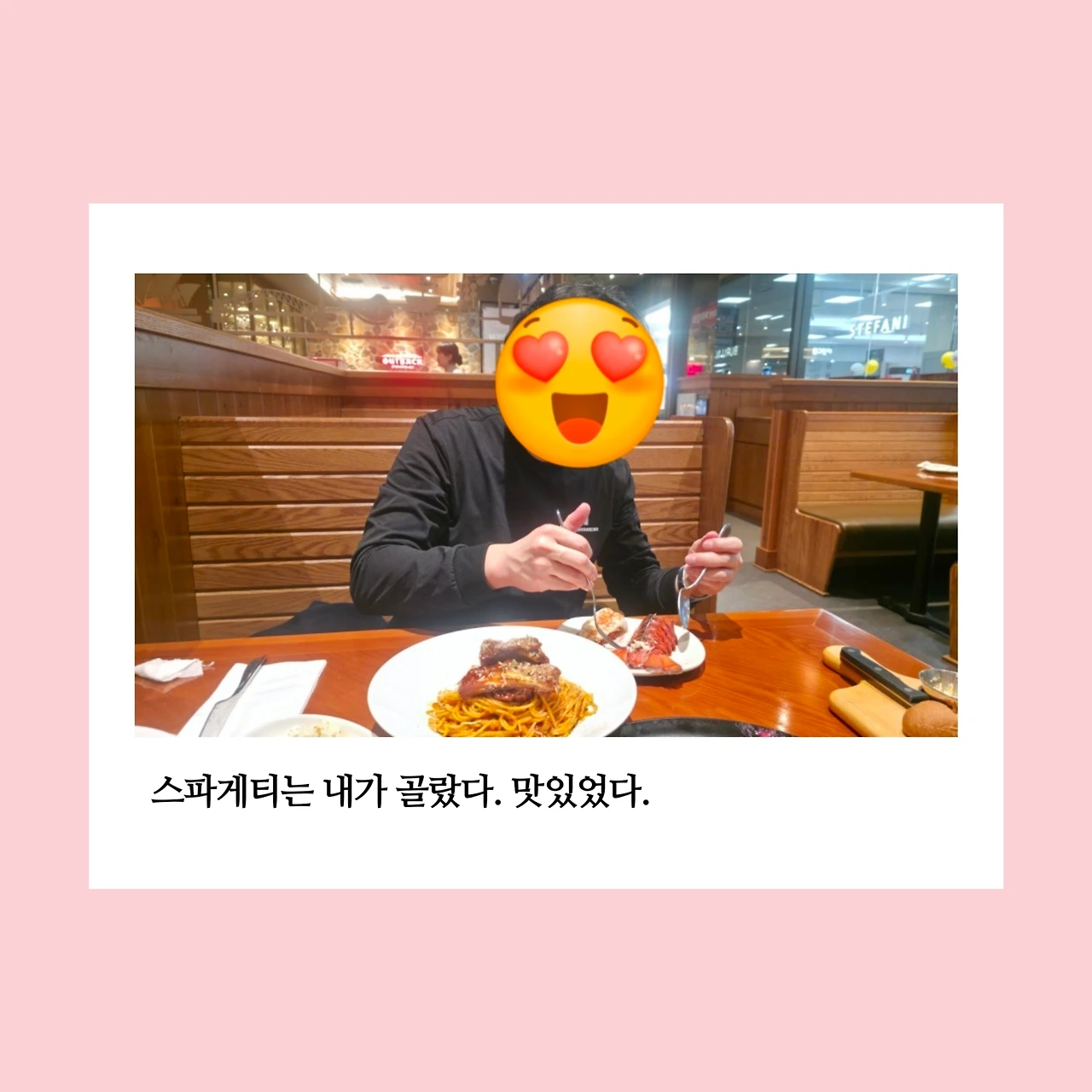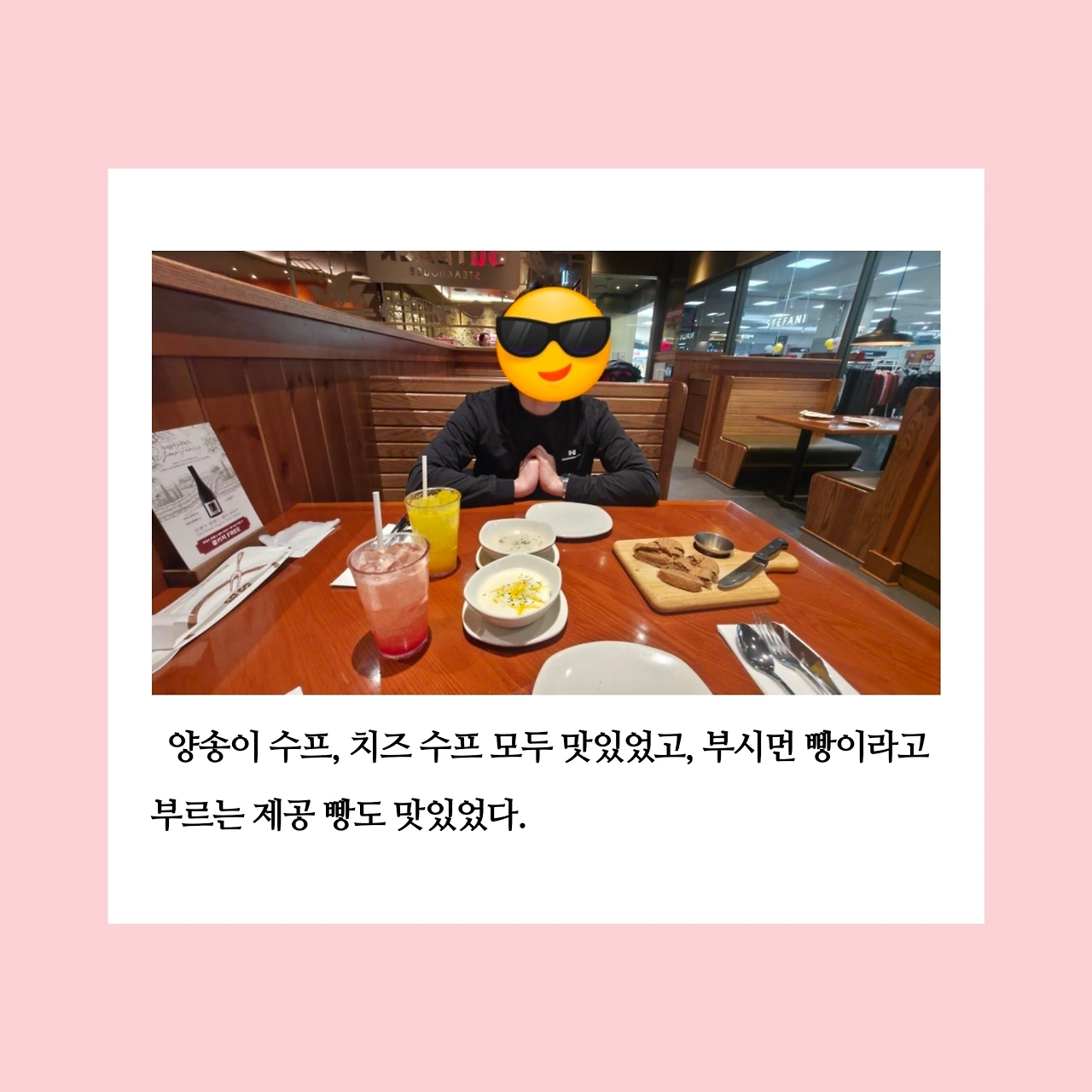아웃백에서 잠깐 기다린 후 자리에 앉았다. 대표 메뉴들을 설명해 주시려는 직원님께 쿠폰을 바로 보여주며 쿠폰에 있는 음식 그대로 먹겠다고 했다. 그 이후 음식들이 어찌나 빨리 나오던지, 전자레인지나 오븐에 돌리기만 해서 나오는 건가 싶을 정도였다. 식당 내에 직원님들이 정말 많았는데, 그분들이 돌아가며 자리에 오셔서 필요한 것이 없는지, 불편한 점은 없는지 친절하게 물어봐 주셨다. 친절하게 대해주셔서 매우 감사했다. 그래서 이 식사는 단순한 외식이라기보다, 누군가의 배려가 겹겹이 쌓인 사랑처럼 느껴졌다.