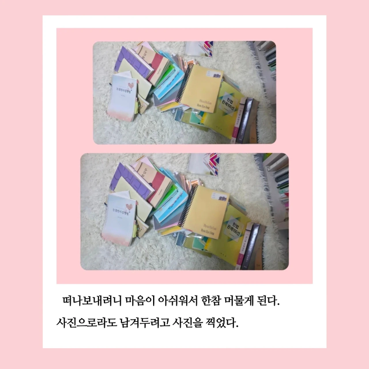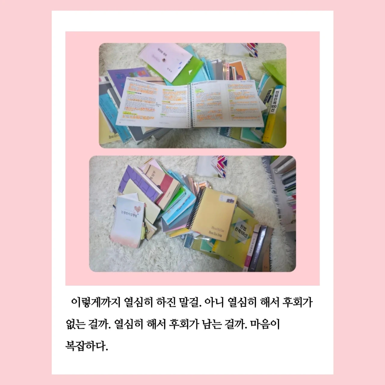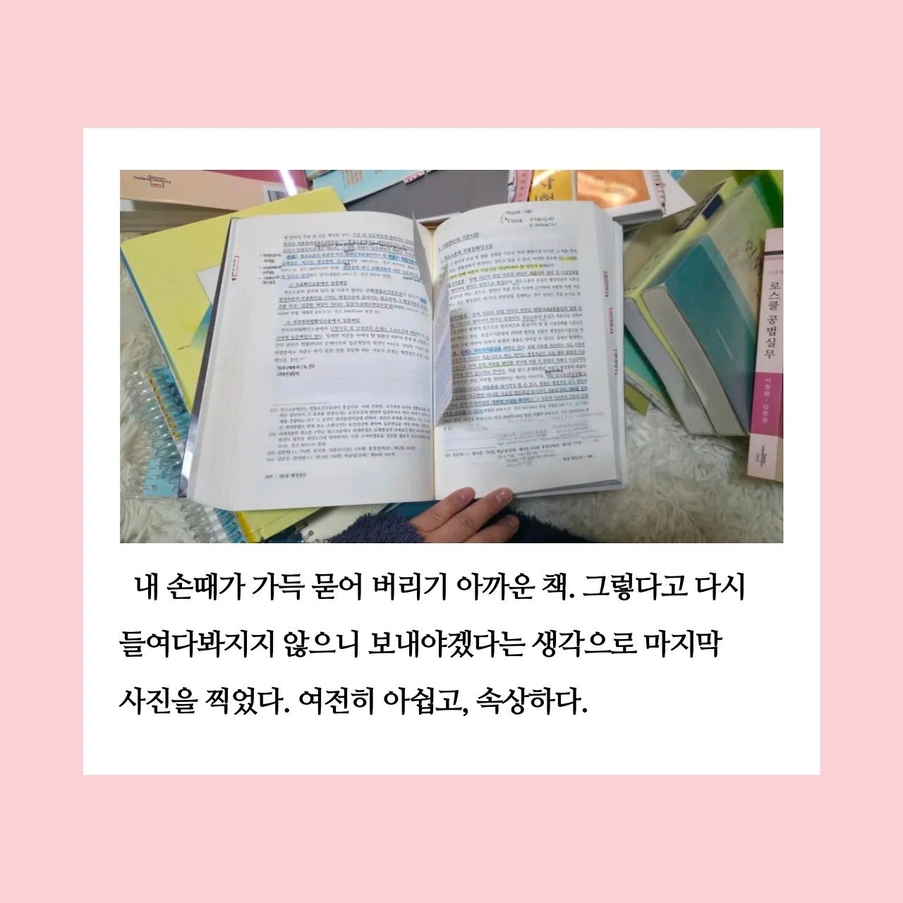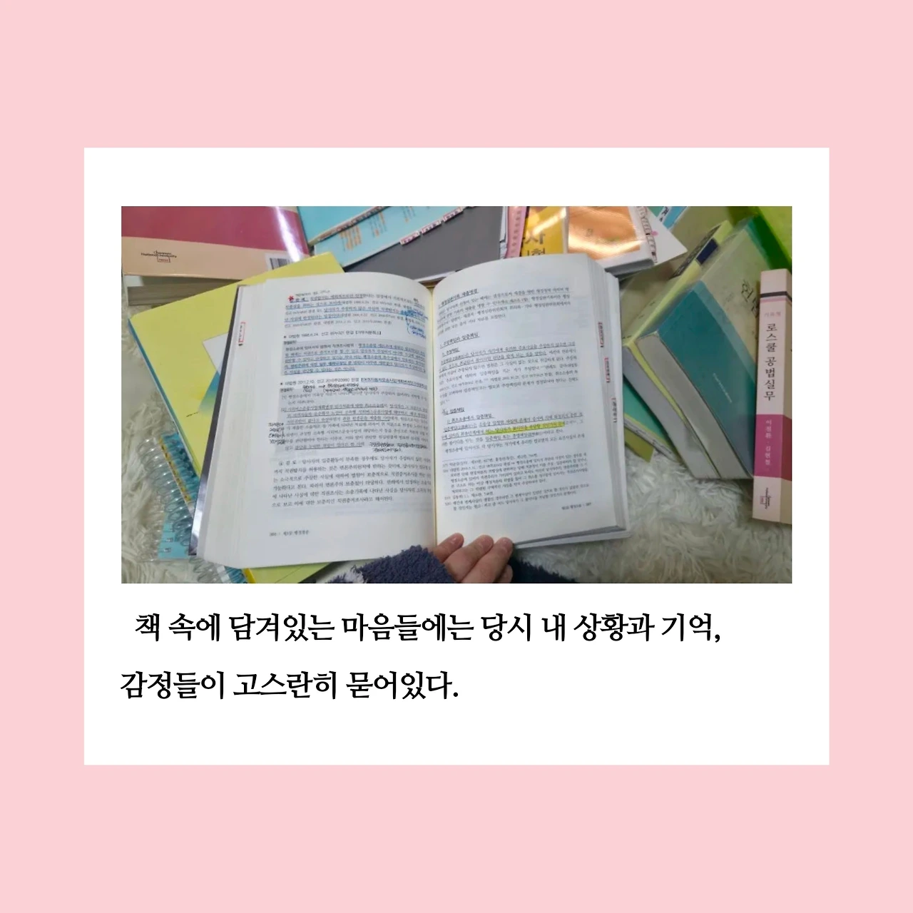 책과 기록들은 내게 많은 감정을 남긴다. 책 한 권을 살 때마다 그 당시의 상황과 감정이 고스란히 담겼고, 읽고 정리할 때마다 가졌던 마음들이 페이지마다 서려 있다. 그래서 아주 오랫동안 책이라는 물건 안에 기억과 복잡한 감정들을 붙들어 두고 떠나보내지 못했다. 그럼에도 백여 번은 들여다보고 정리했던 수험 기록들만큼은 아직 붙들고 있다. 이것들도 언젠가는 천천히 떠나보낼 준비를 해야 할 것이다.