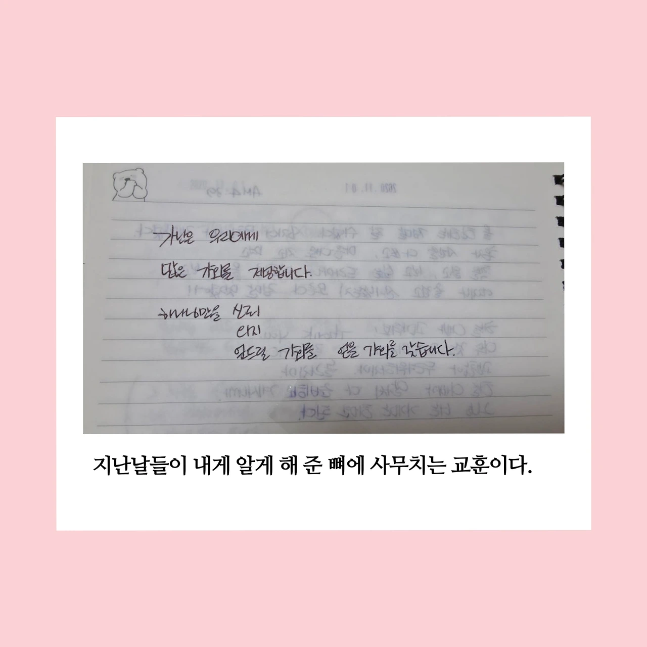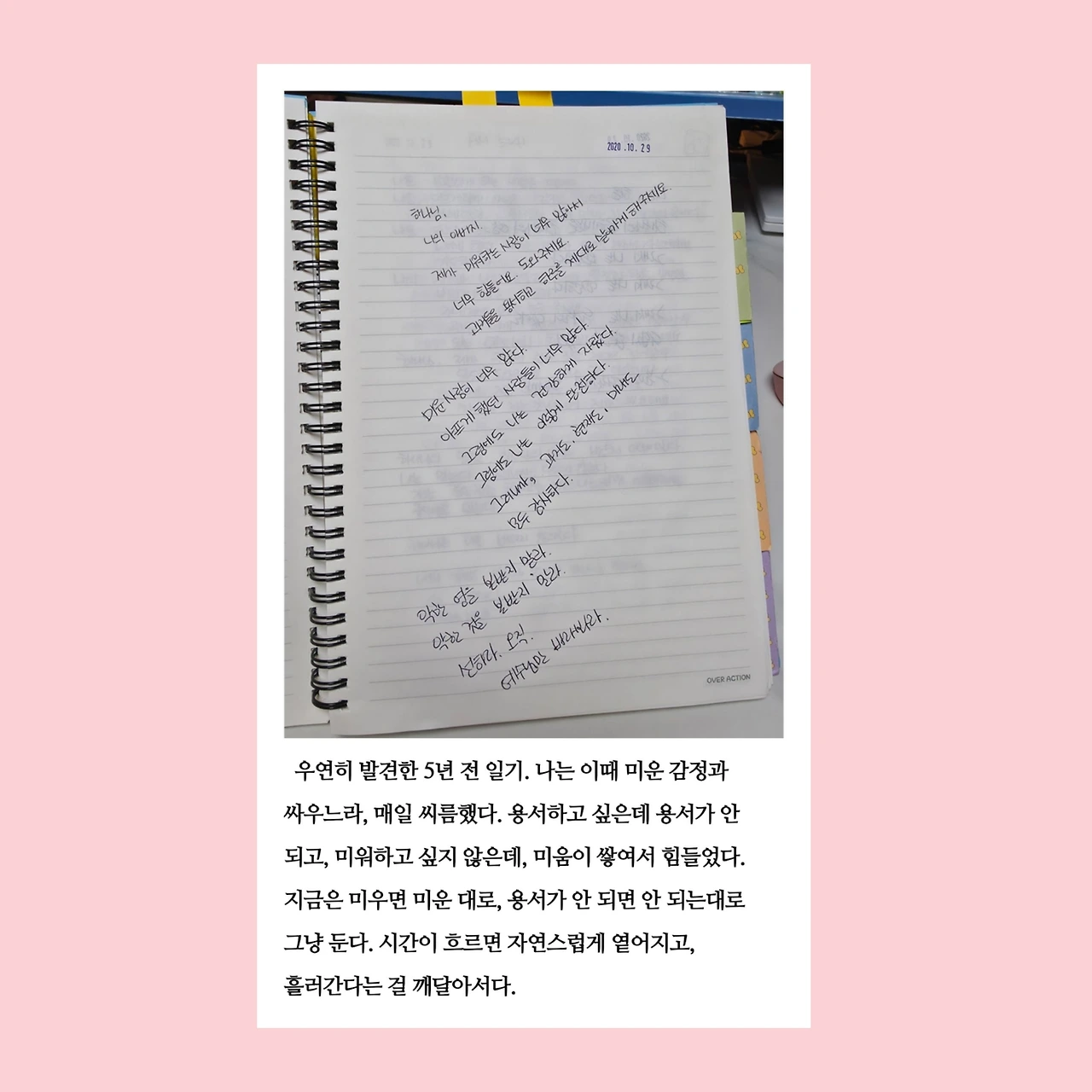 아침부터 그 수험서들을 꺼내 정리를 시작했다. 스프링 철 된 것들은 스프링과 종이, 표지를 분리했고, 책으로 된 것들은 놓아버릴 마음으로 분리수거를 했다. 지난번 다 정리했다고 생각했는데 아직도 남아 있는 법률 서적들이 있었다. 대학생 시절 교수님께서 선물해 주셨던 책이라든지, 최소 스무 번은 봐서 손때가 잔뜩 묻은 공책과 정리서들 말이다. 놓아지지 않아 계속 가지고 있었던 기억과 추억, 아픔들이 한꺼번에 쏟아지는 아침이었다. 그러다 우연히 5년 전에 썼던 일기장이 나왔다. 그 일기 속에는 지난날의 아쉬움과 슬픔, 그리고 감사가 가득 담겨 있었다.