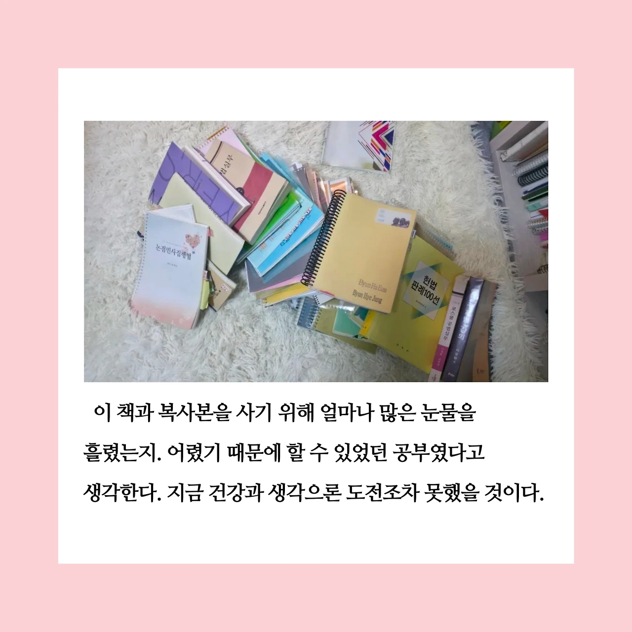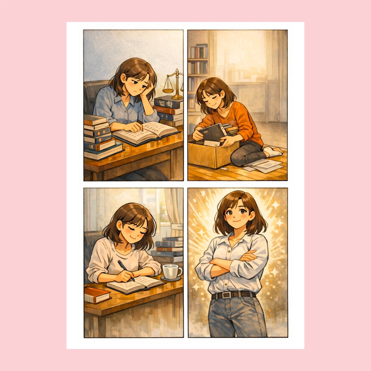 하루 6시간이라. 그렇게 생각하고 보니 별거 아닌데?라는 생각이 들었다. 그러다 하루 6시간 이상 10년 넘게 법 분야를 공부했다는 생각에 마음이 갑자기 쪼그라든다. 전문가가 된다며.라고 하기엔 나는 이도 저도 아닌 나부랭이가 된 것 같아서다. 그런 생각을 하던 중 침실에 놓인 책장에 아직도 꽂혀 있는 수험서들이 눈에 들어왔다.