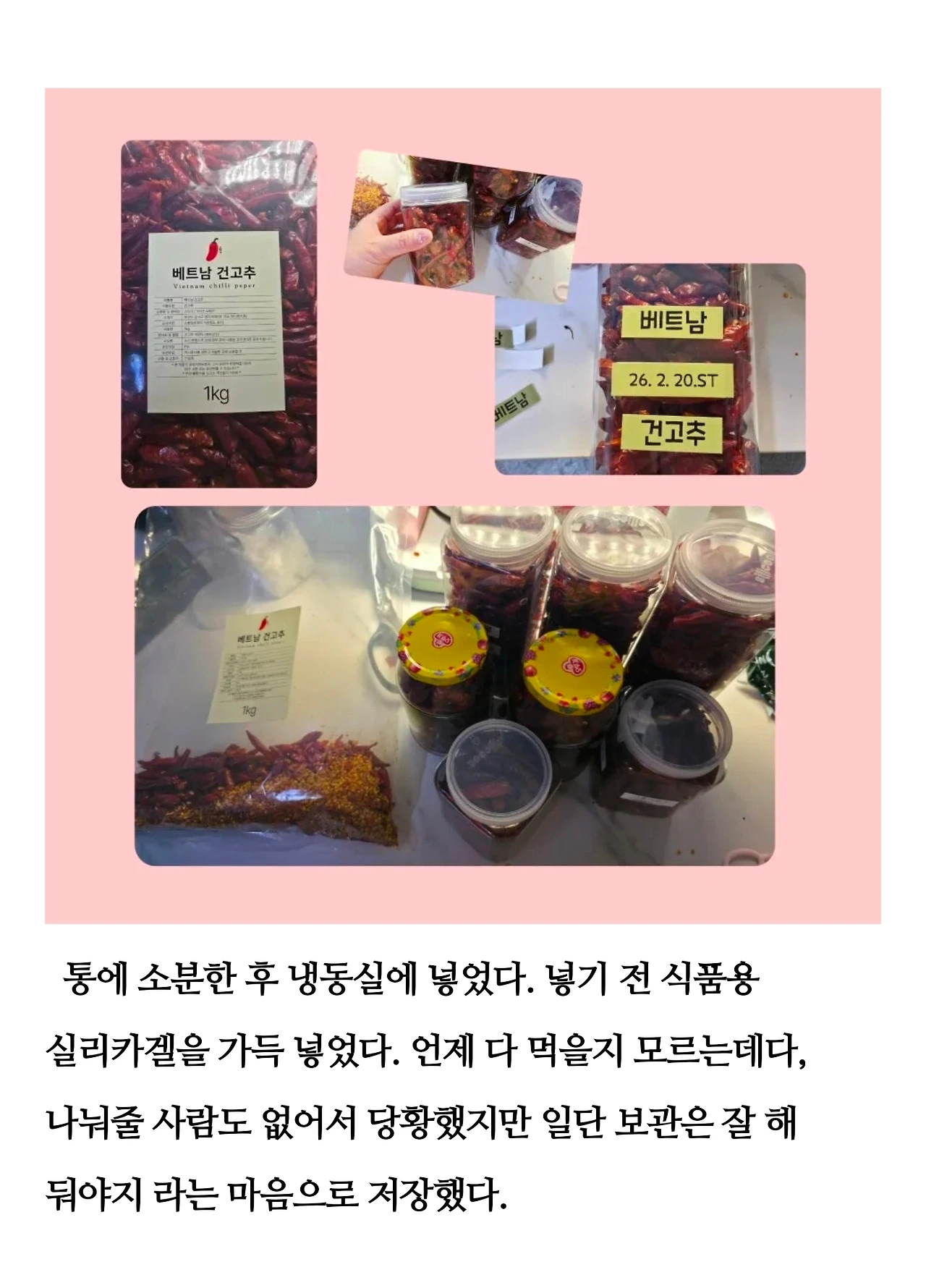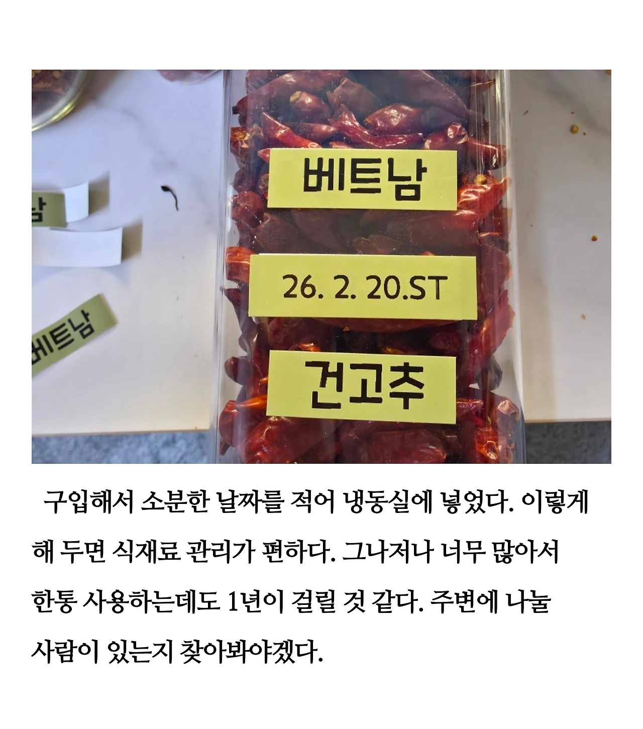 어쩌다 보니 너무 많은 양을 사서 고민이 됐다. 냉동실 칸도 부족하고, 이걸 1년 안에 다 먹을 수 있을지 하는 생각이 들었다. 일단 나눠줄 사람이 없어서 냉동실에 다 넣긴 했는데, 다음엔 먹을 만큼만 사야겠다고 다짐했다. 앞으로 이걸 넣어 만들 수 있는 음식들을 하나씩 찾아 만들어야겠다.