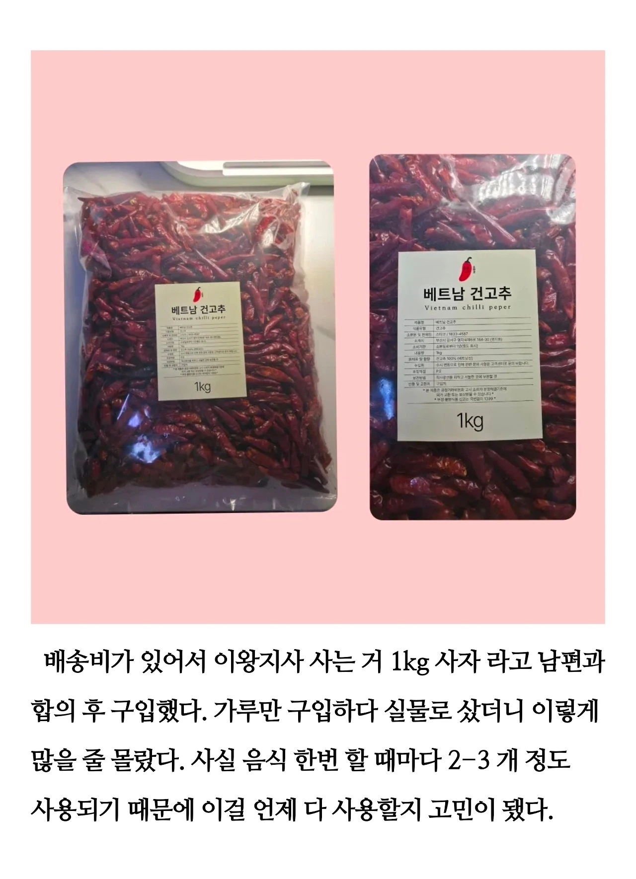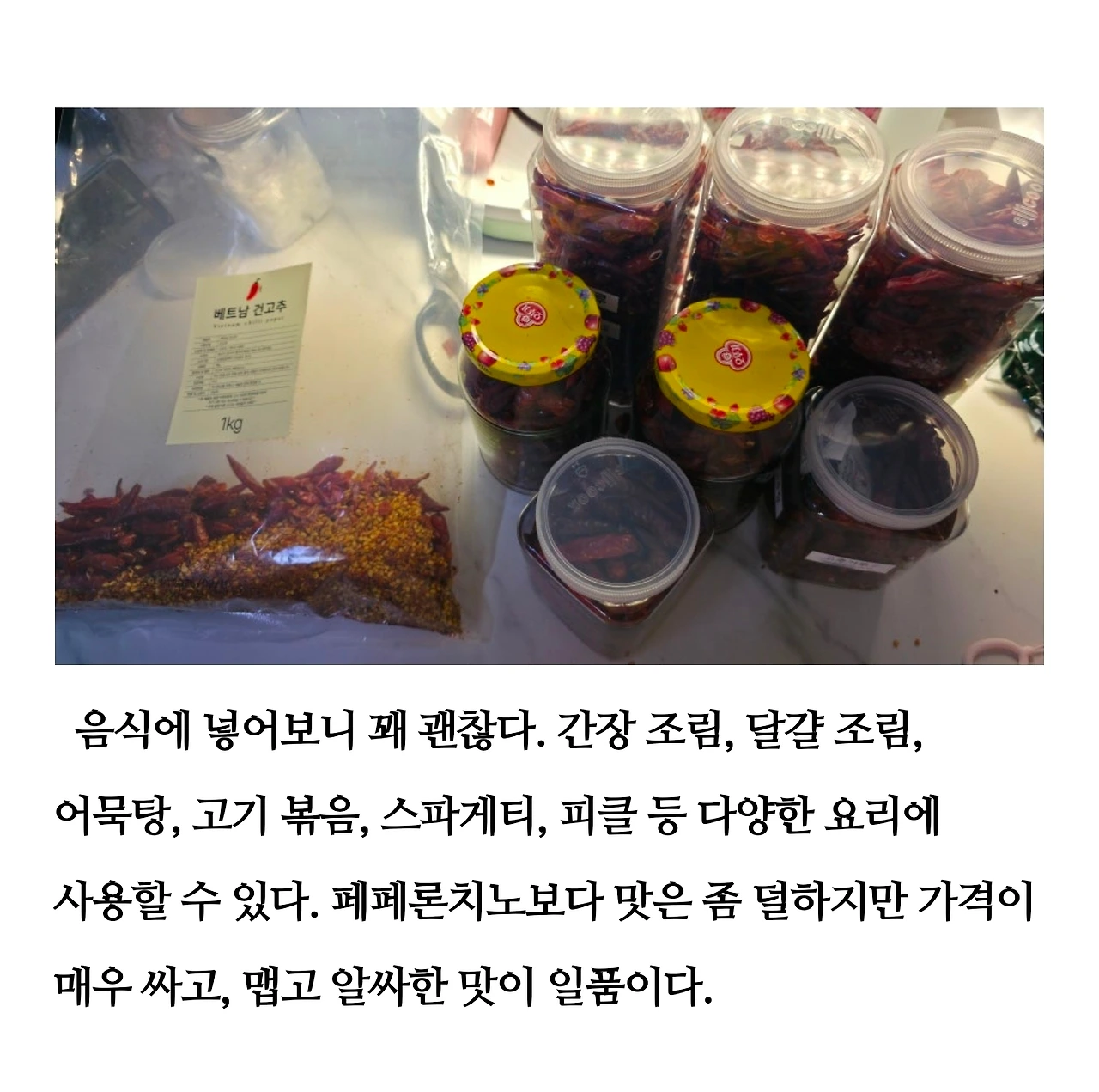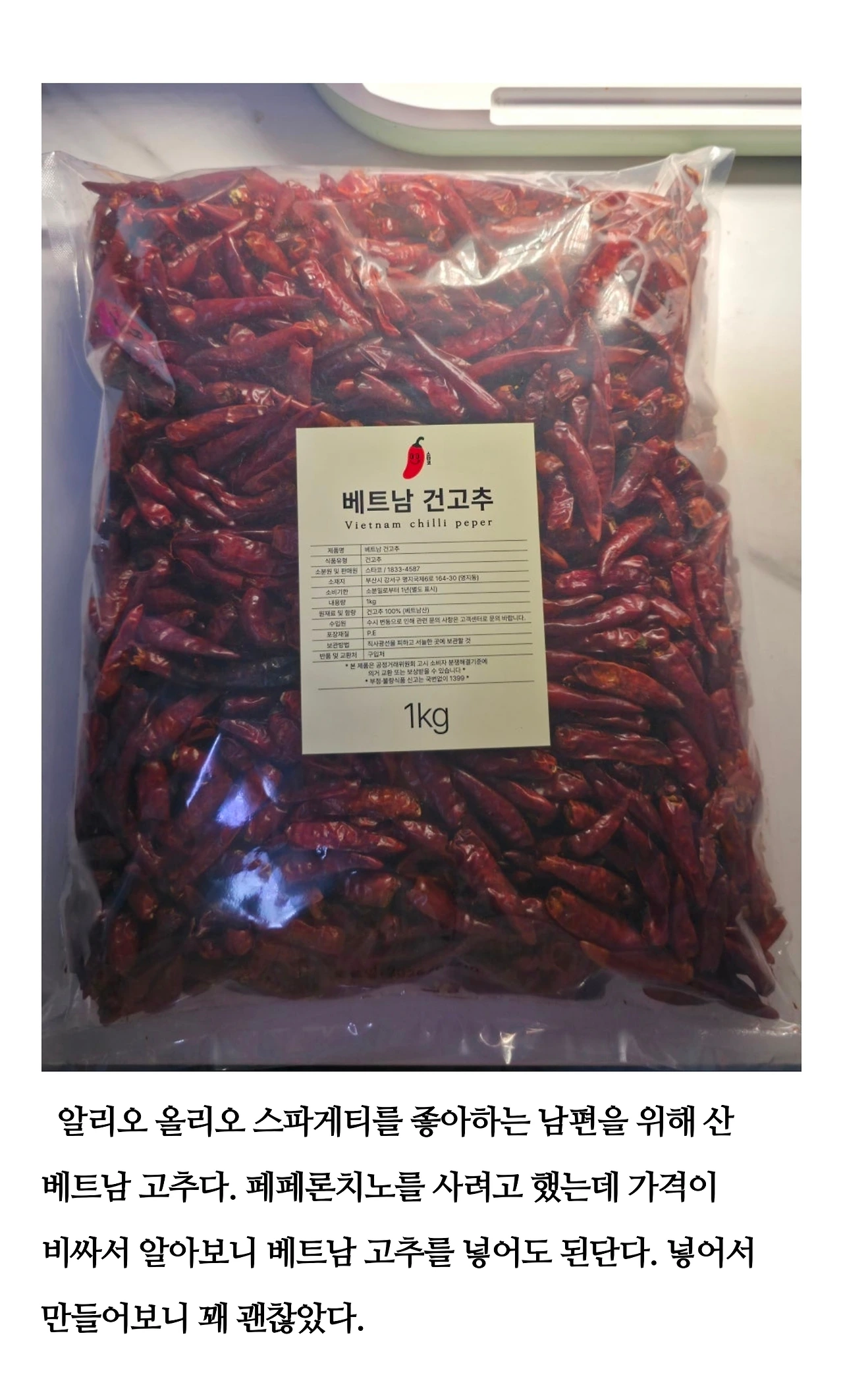 아뿔사~! 너무 많이 샀다. 라는 생각을 하면서 차곡차곡 정리했다. 페페론치노가 사고 싶어서 알아보다가 용량 대비 가격이 너무 비싸게 느껴져서 베트남 고추를 구입했다. 알아보니 베트남 고추를 넣어도 된단다. 맛이 약간 다르긴 한데, 베트남 고추를 넣고 볶은 스파게티도 꽤 맛있었다.