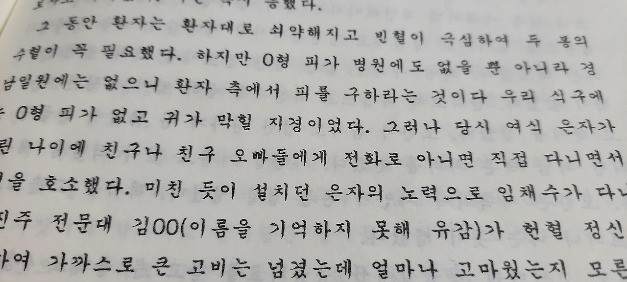 아빠의 자서전 - 정심 선행그동안 환자는 환자대로 쇠약해지고 빈혈이 극심하여 두 봉의 수혈이 꼭 필요했다. 하지만 O형 피가 병원에도 없었을 뿐 아니라 경남 일원에는 없으니 환자 측에서 피를 구하라는 것이다. 우리 식구에는 O형 피가 없고 귀가 막힐 지경이었다. 그러나 당시 여식 은자가 어린 나이에 친구나 친구 오빠들에게 전화로 아니면 직접 다니면서 사정을 호소했다. 미친 듯이 설치던 은자의 노력으로 임채수가 다니는 진주 전문대 김 OO(이름을 기억하지 못해 유감)가 헌혈 정신을 발휘하여 가까스로 큰 고비는 넘겼는데 얼마나 고마웠는지 모른다. <부인 큰 병나다 - 정심 선행 中>