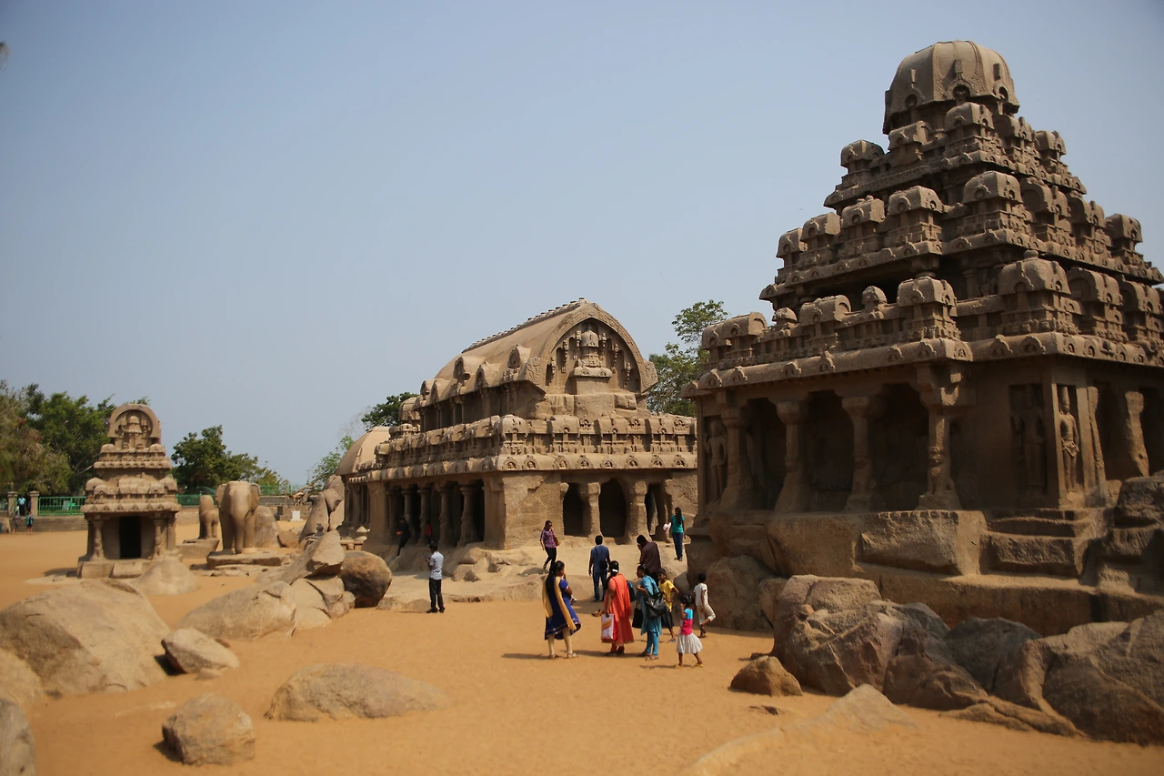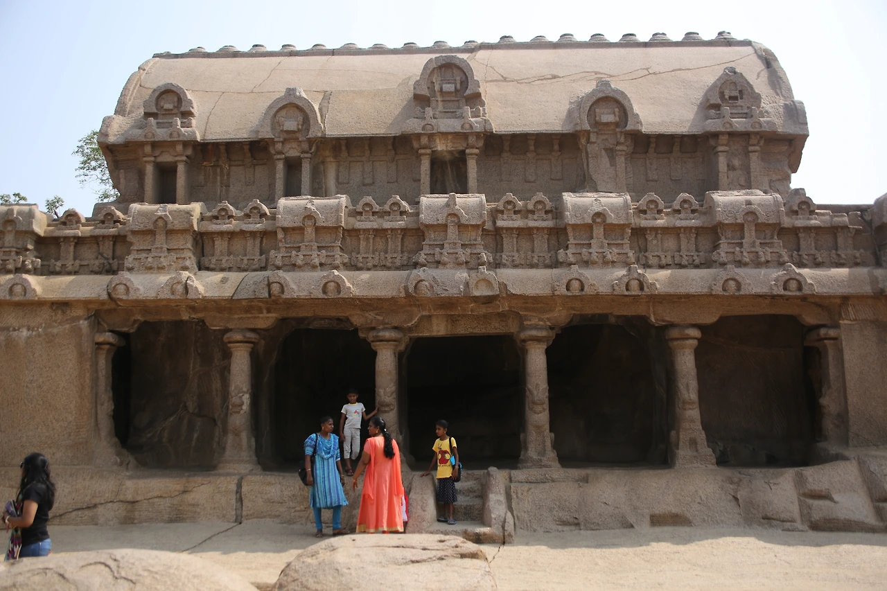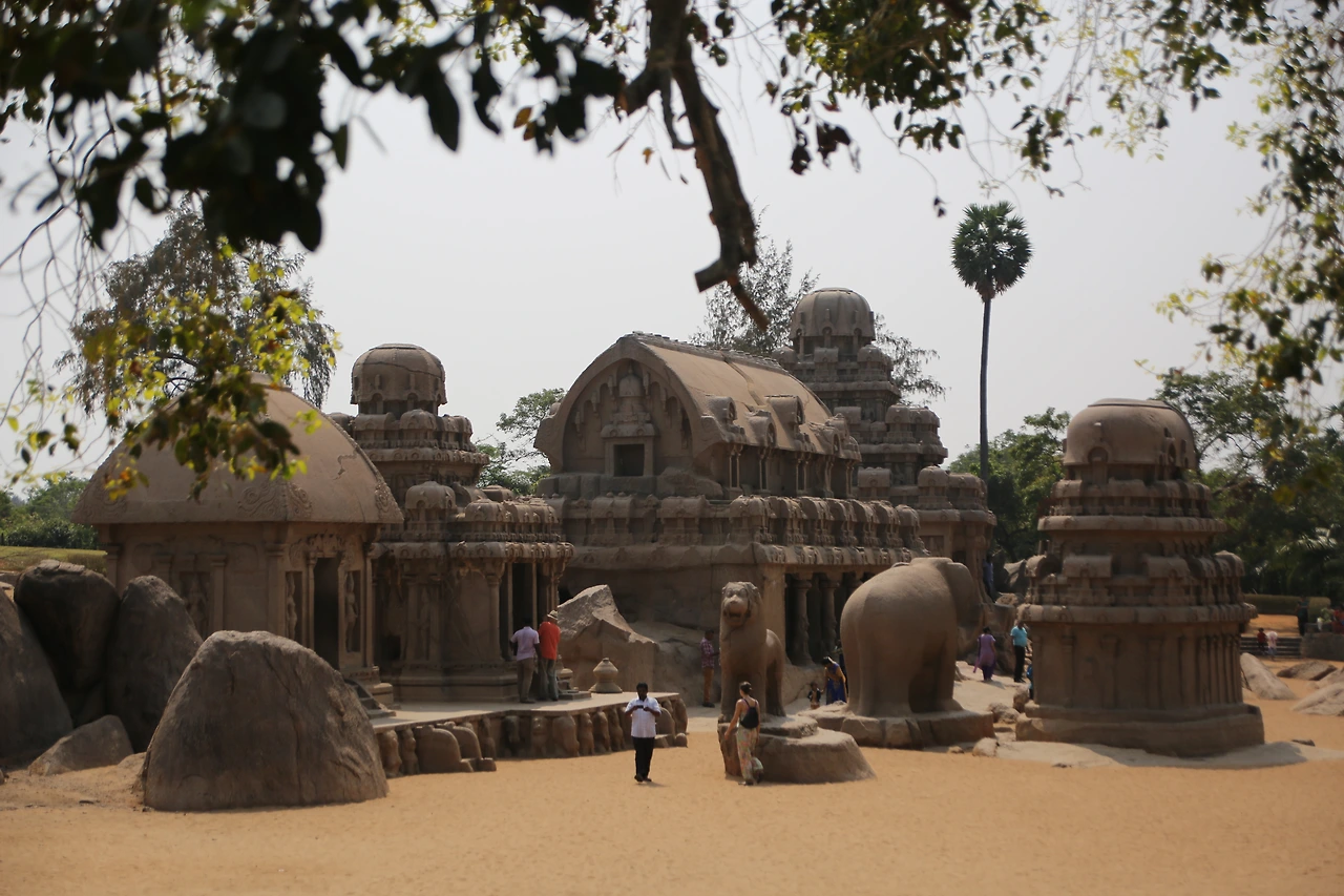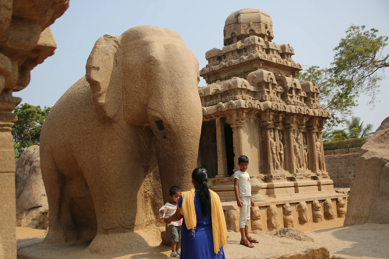 마말라뿌람은 7세기 빨라바 왕조 시내부터 전국에서 모인 석공들의 도시로 명성을 얻었다. 지금도 곳곳에서 돌을 다듬고 있는 석공들의 모습을 심심찮게 볼 수 있다. 거대한 바위산 하나를 깎아 만든 다섯 개의 사원은 모두 화강암이다. 사원의 외부는 화려한 조각으로 덮여있고 사원 내부는 사람이 통행할만한 공간을 갖고 있다. 그중 정교한 코끼리상이 있는데 실제 코끼리와 같은 크기로 조각되었다.