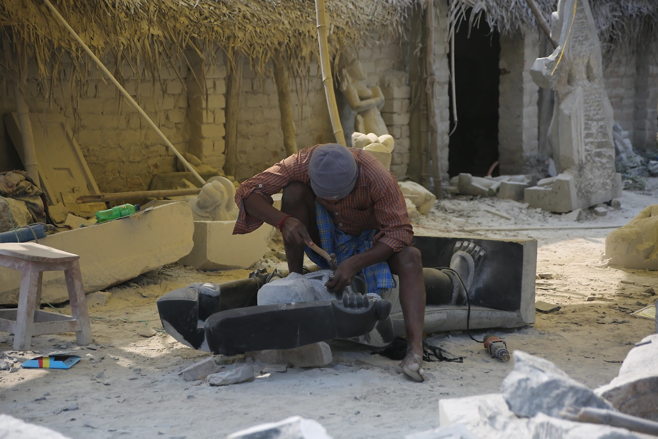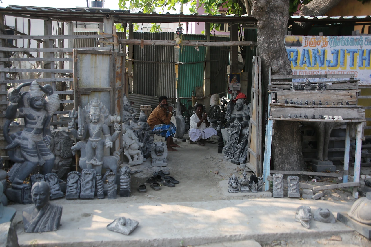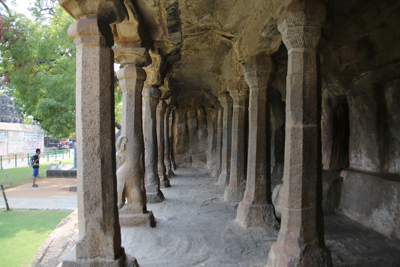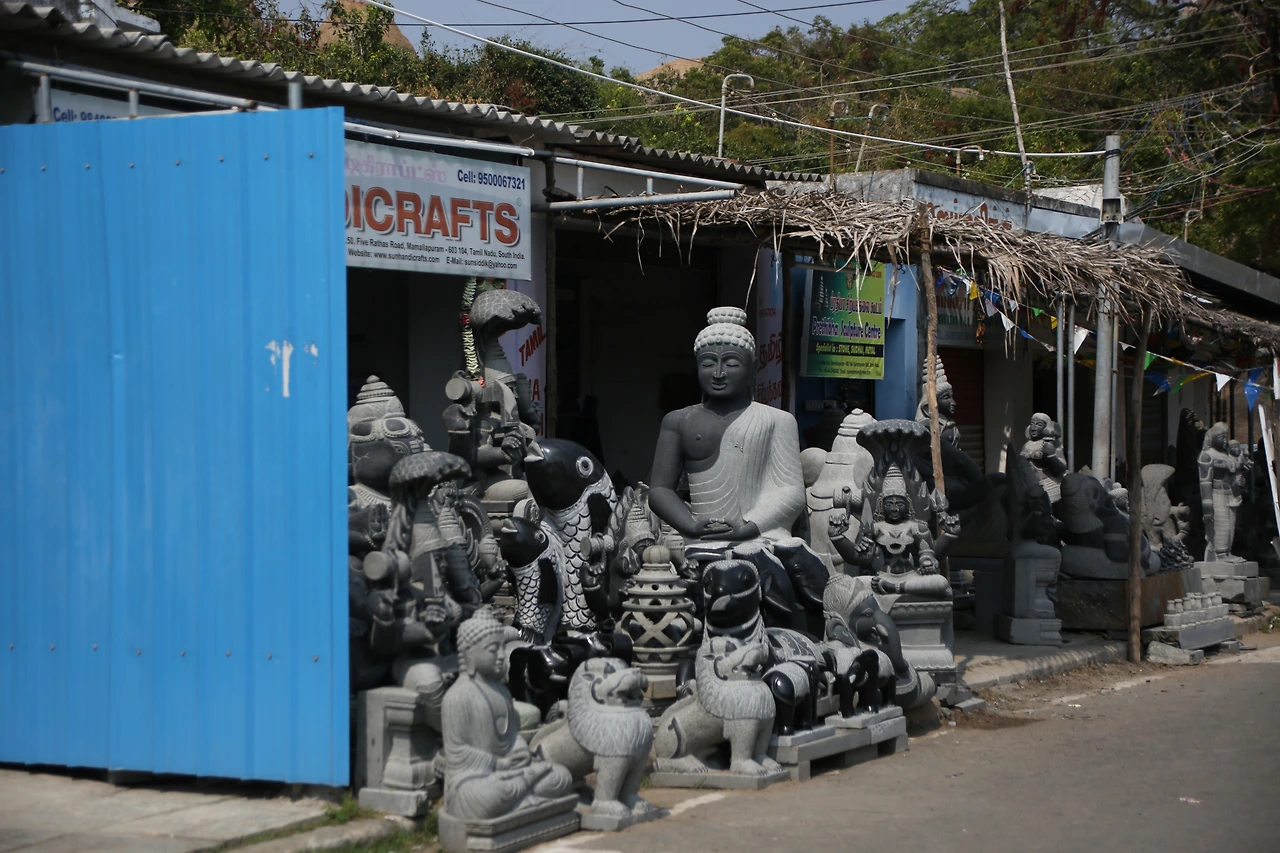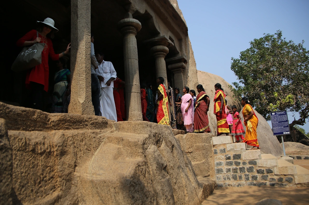 마말라뿌람은 7세기 빨라바 왕조 시내부터 전국에서 모인 석공들의 도시로 명성을 얻었다. 지금도 곳곳에서 돌을 다듬고 있는 석공들의 모습을 심심찮게 볼 수 있다. 거대한 바위산 하나를 깎아 만든 다섯 개의 사원은 모두 화강암이다. 사원의 외부는 화려한 조각으로 덮여있고 사원 내부는 사람이 통행할만한 공간을 갖고 있다. 그중 정교한 코끼리상이 있는데 실제 코끼리와 같은 크기로 조각되었다.
