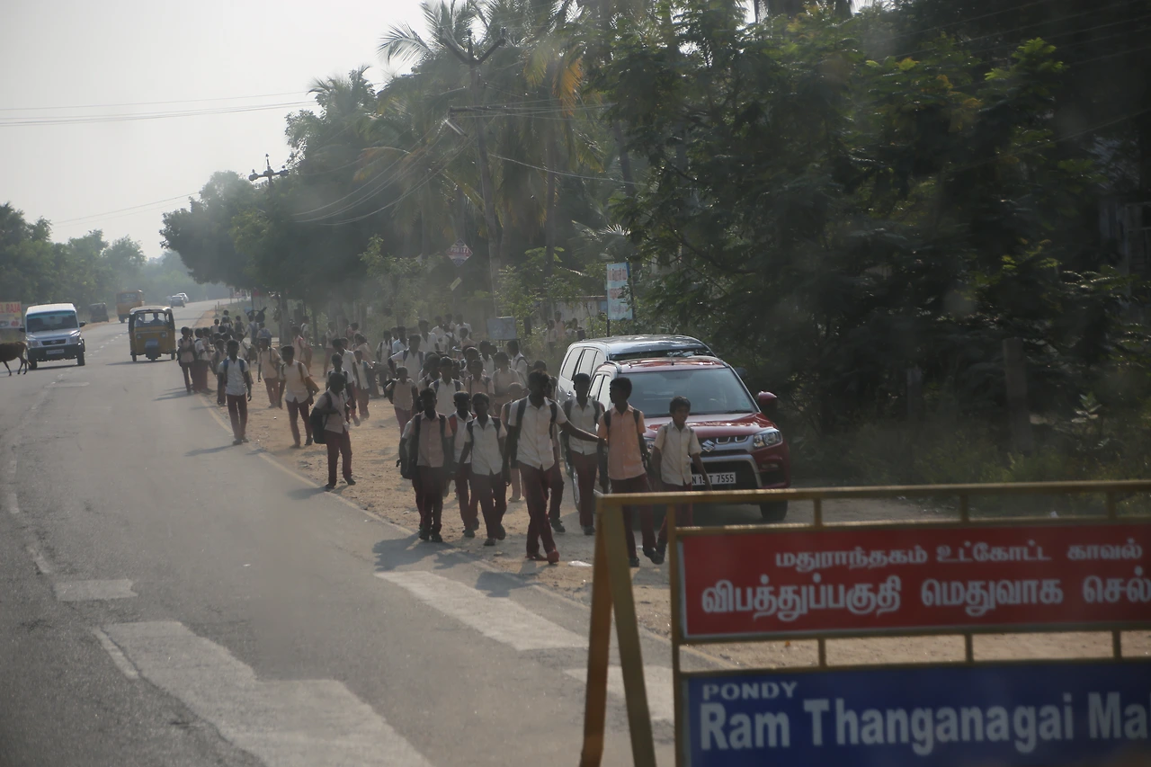 창 밖으로 말린 생선을 파는 모습이 보였다. 생선들이 인도 사람을 닮은 듯 비쩍 말랐다. 하교하는 학생들이 흙먼지를 뒤집어쓰며 거리를 메우고 있었다. 버스 차창에서 내 카메라 렌즈를 발견한 장난꾸러기 학생이 포즈를 취해준다. 사람에 취해 흔들리다 보니 어느새 버스는 폰디체리에 도착하고 있었다.