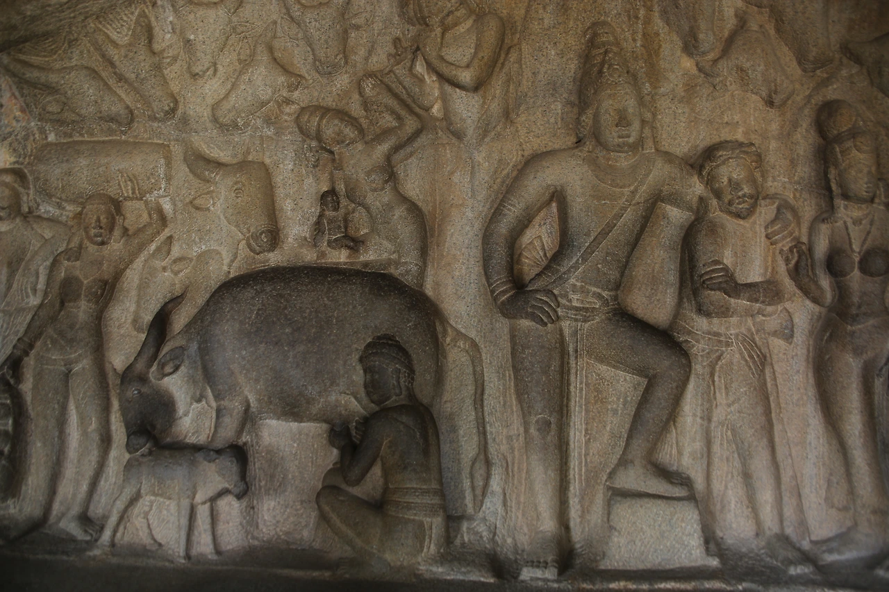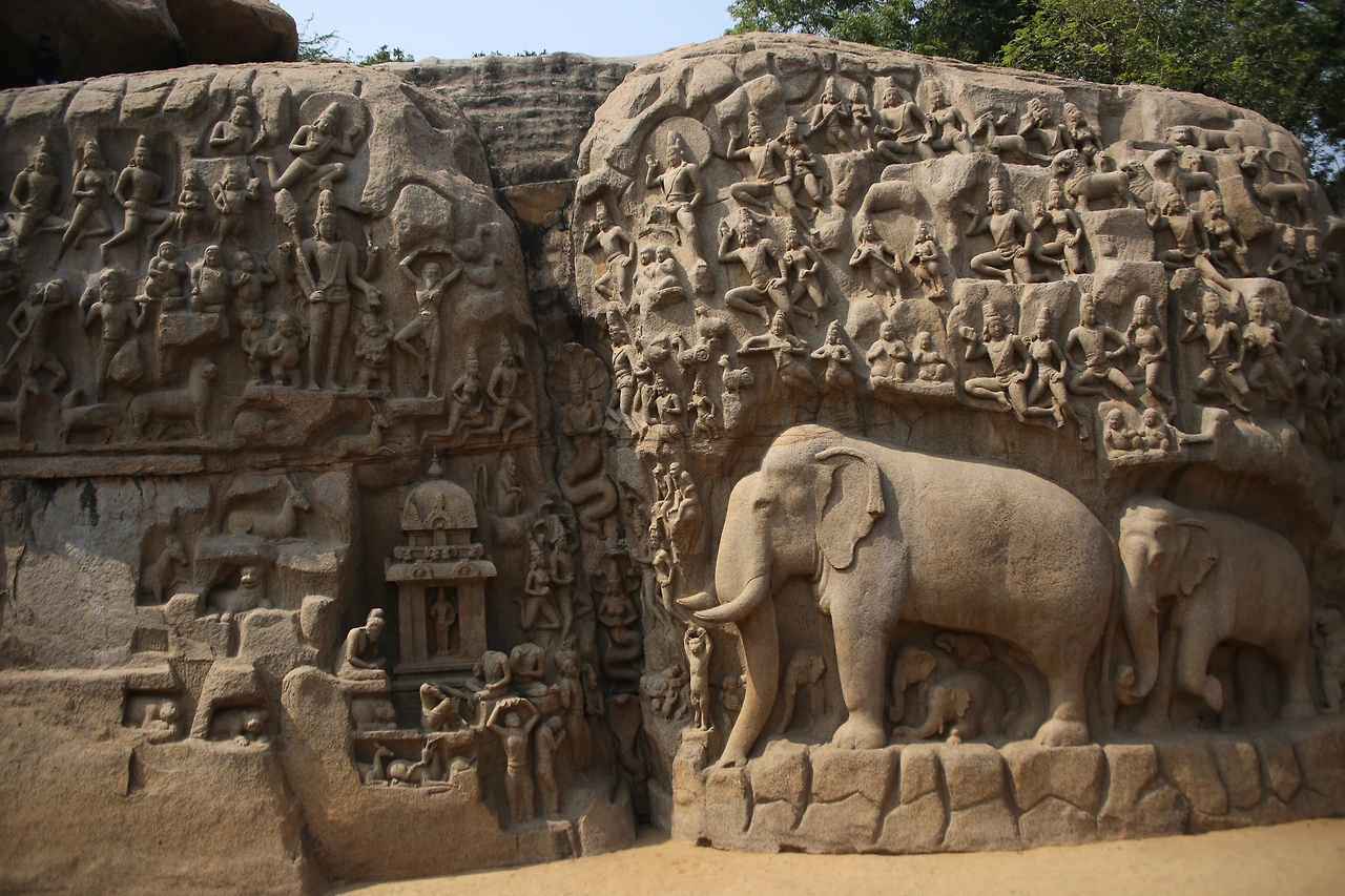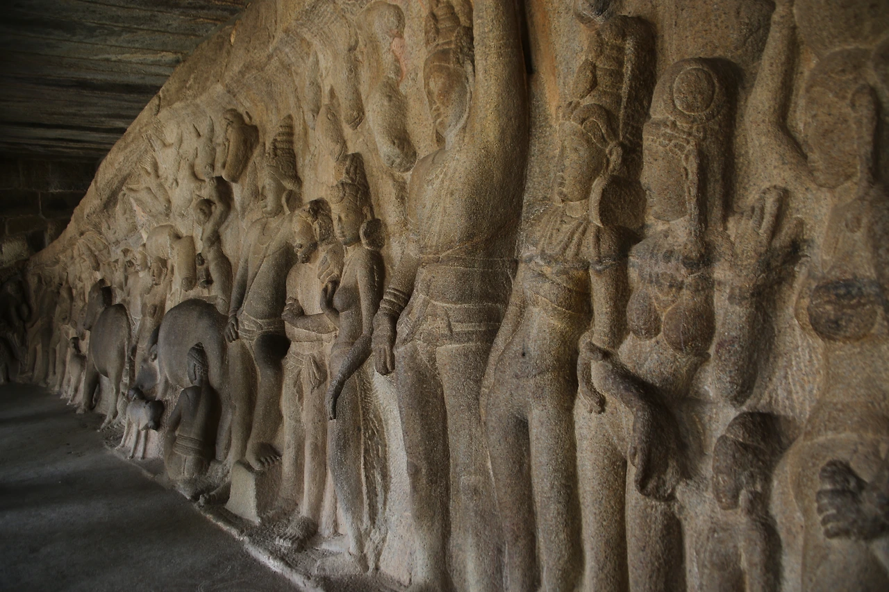 세계 최대의 부조라고 일컬어지는 아르주나의 고행 역시 바위산에 새겨진 장대한 조각이다. 폭 29m, 높이 13m의 이 부조는 강가(갠지스강)가 이 세상에 내려왔을 때의 이야기를 부조 기법으로 새긴 것이다. 이 바위에는 아르주나가 고행을 통해 가장 강력한 무기인 빠수 빠따를 얻으려고 하는 내용이 새겨있는데 일부 학자들은 이 작품이 바가 리타의 고행을 표현한 것으로 보기도 한다. 이 고행은 시바 신에게 천상에 있는 각가가 땅으로 내려와서 선조들의 모든 죄를 씻을 수 있도록 도움을 청하기 위함이라고 한다. 해석의 차이는 있지만 지금의 갠지스강이 천상에 있던 강이라는 내용은 동일하다. 그러므로 힌두교에서 갠지스강이 갖는 의미를 이해할 수 있다고 한다.