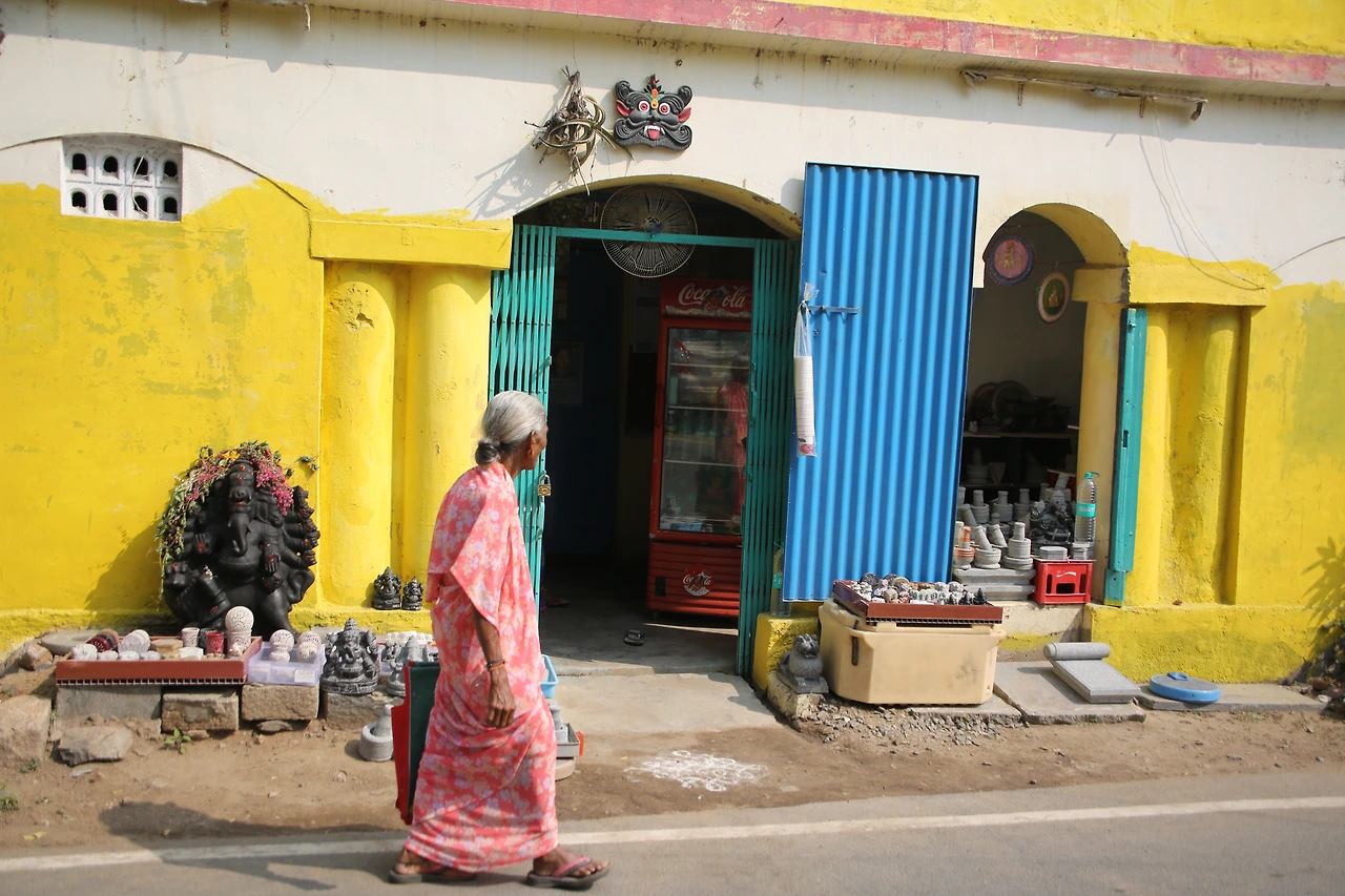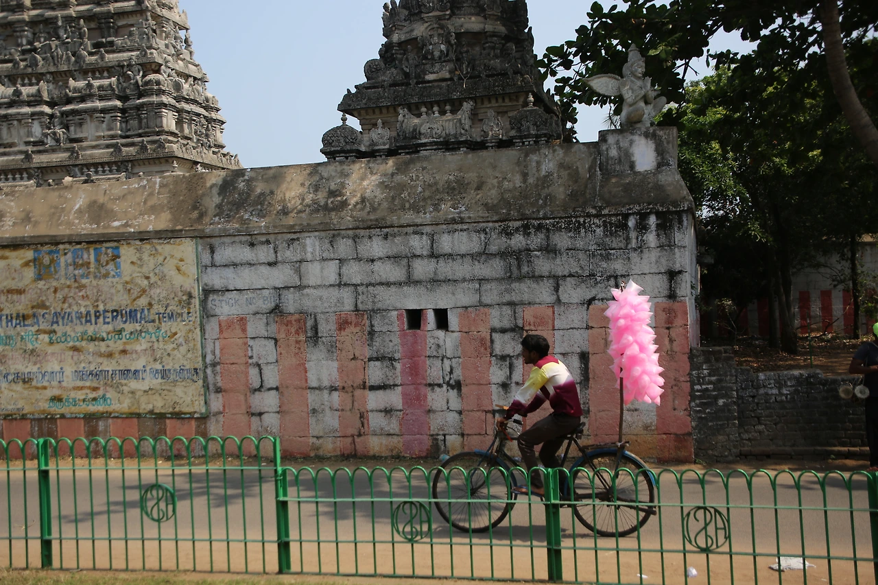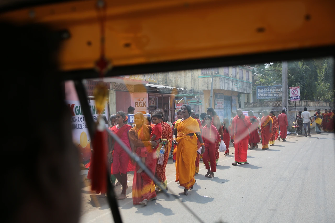 다른 도시로 가는 버스니까 일명 시외버스, 그러나 버스는 첸나이를 벗어나는 동안 마치 시내버스처럼 스무 번도 더 서고 가기를 반복했다. 타기만 하는 게 아니라 내리는 사람도 있다. 그때마다 차장은 호루라기를 불어 운전기사에게 신호를 보냈다. 가령 내릴 사람이 있거나 탈 사람이 있으면 호루라기를 삑! 하고 한 번 불어 스톱을 알린다. 이제 다 탔으니 떠나요 할 때는 삑삑(출발)! 하고 두 번 분다. 그런데 하필 내가 앉은자리는 사람들이 타고 내리는 뒷문 근처이고 차장은 바로 그 앞에 서있었다. 안 그래도 각종 차들의 경적 소리에 귀가 어지러운데 수시로 불어대는 호루라기 소리가 얼마나 크고 시끄러운지 그때마다 소리 송곳이 귀를 콕콕 찌르는 느낌이다. 음악을 전공해서인지 유난히 청각이 예민한 이유도 있을 것이다. 그렇게 어찌어찌 두 시간이 지나 열어둔 차창으로 흙먼지를 잔뜩 뒤집어쓴 채 마말라뿌람에 도착했다. 공항에서 만난 택시 기사의 말대로 뭔가 큰 행사가 벌어진 듯 단체 여행자들 버스가 줄지어 서있고 붉은색 사리를 입은 여인들의 미소가 거리를 채우고 있다.