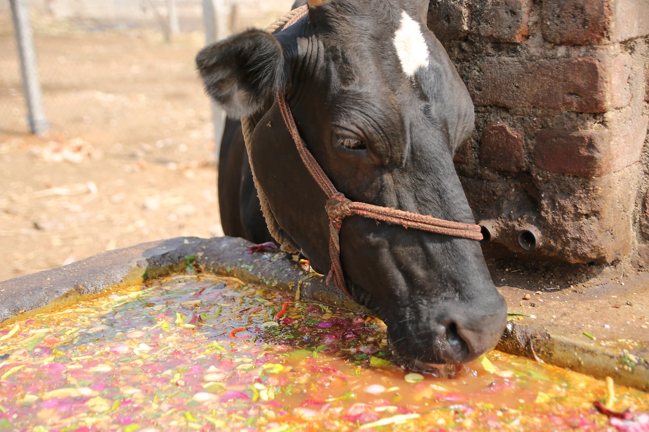 소가 여물을 먹고 있습니다. 메뉴는 꽃탕, 노랗고 빨간 꽃잎이 둥둥 떠 있는 꽃물을 먹네요.