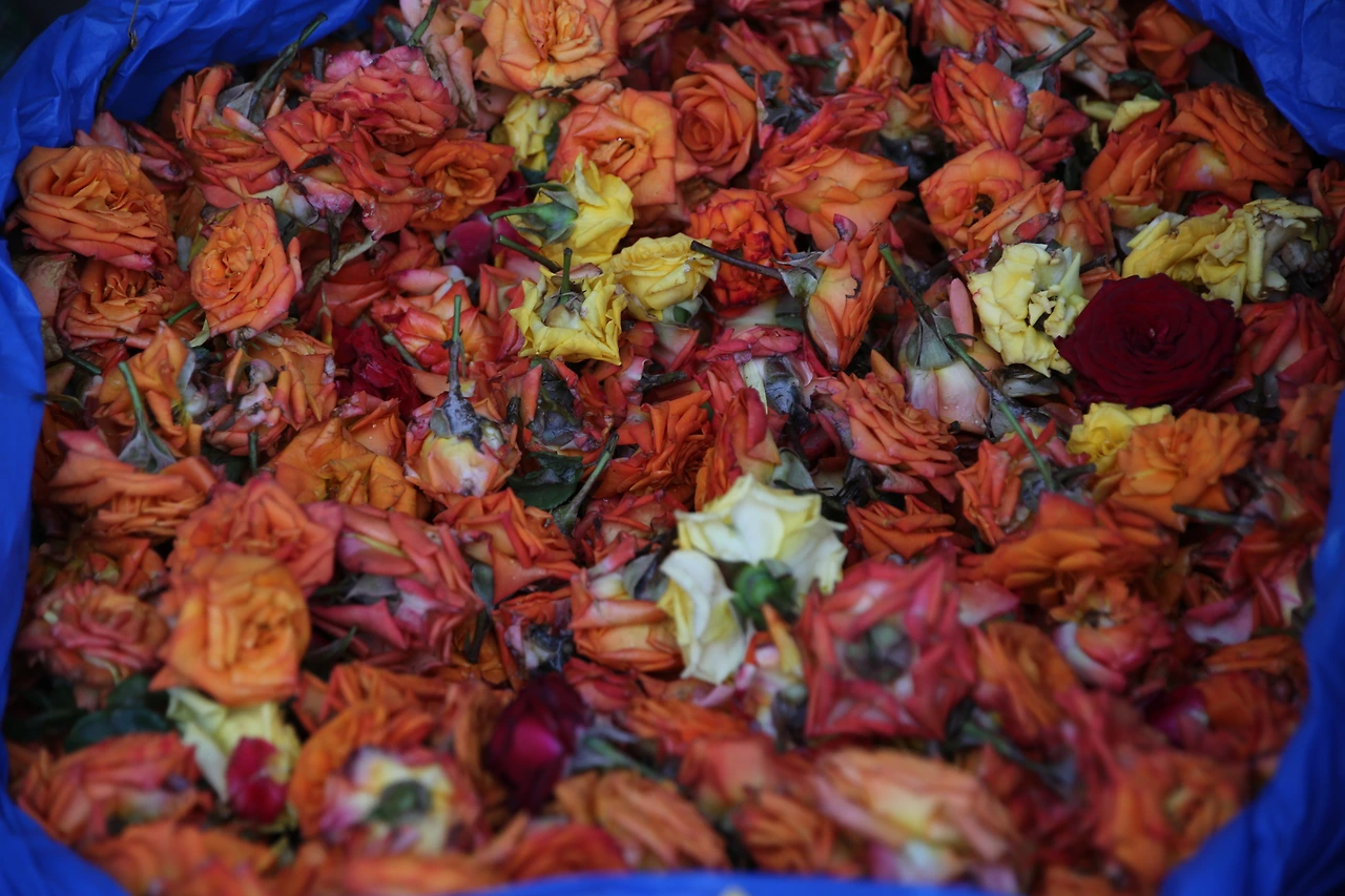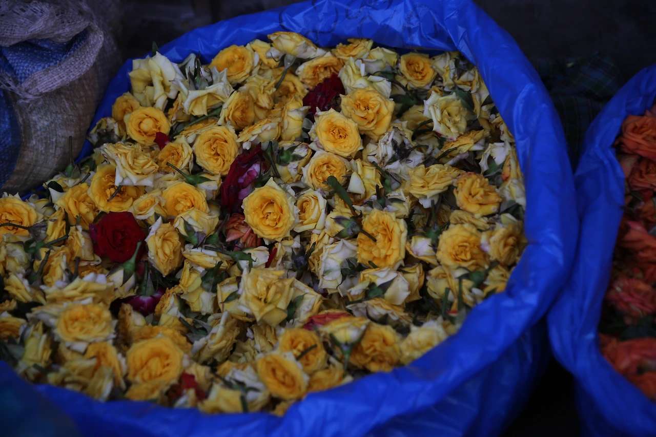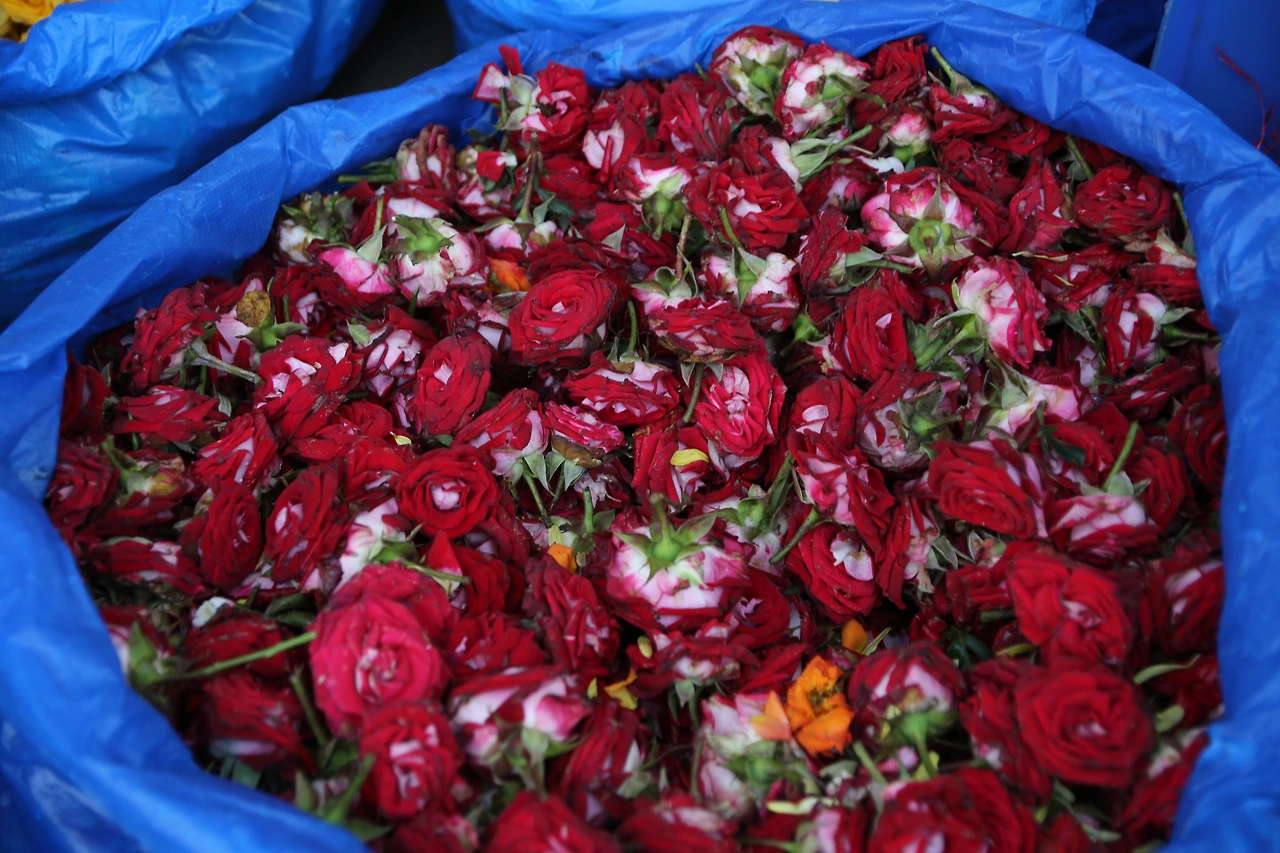 꽃송이만 댕강 잘린 장미꽃들이 색깔별로 비닐에 담겨 있어요.