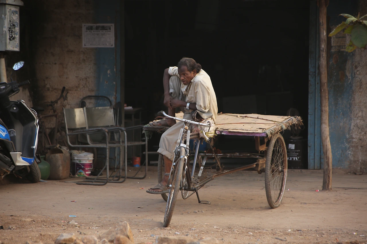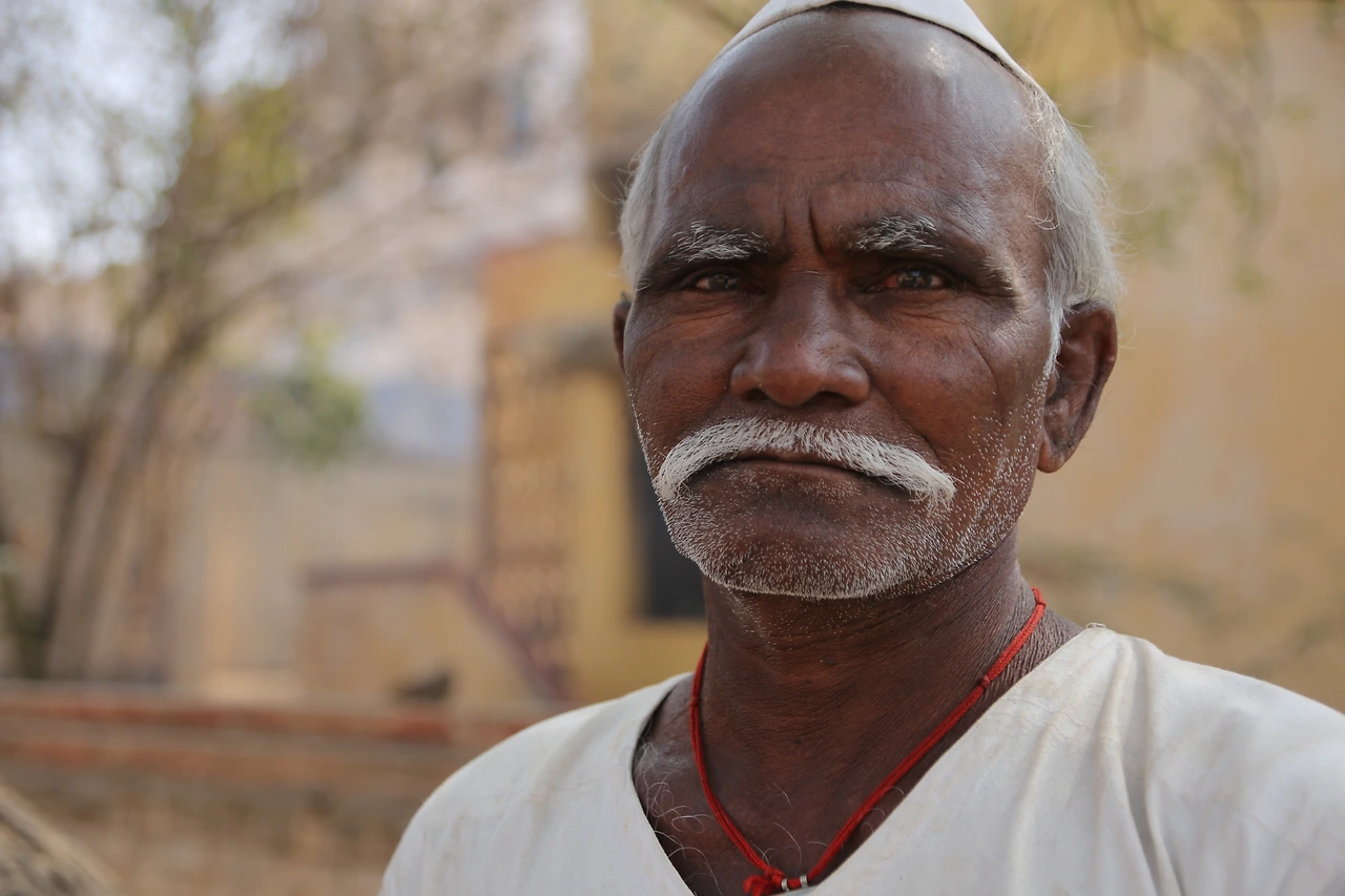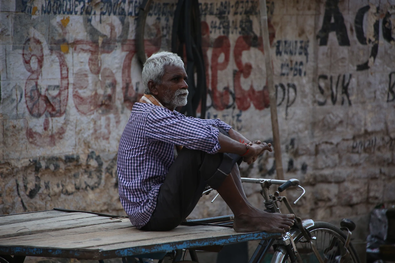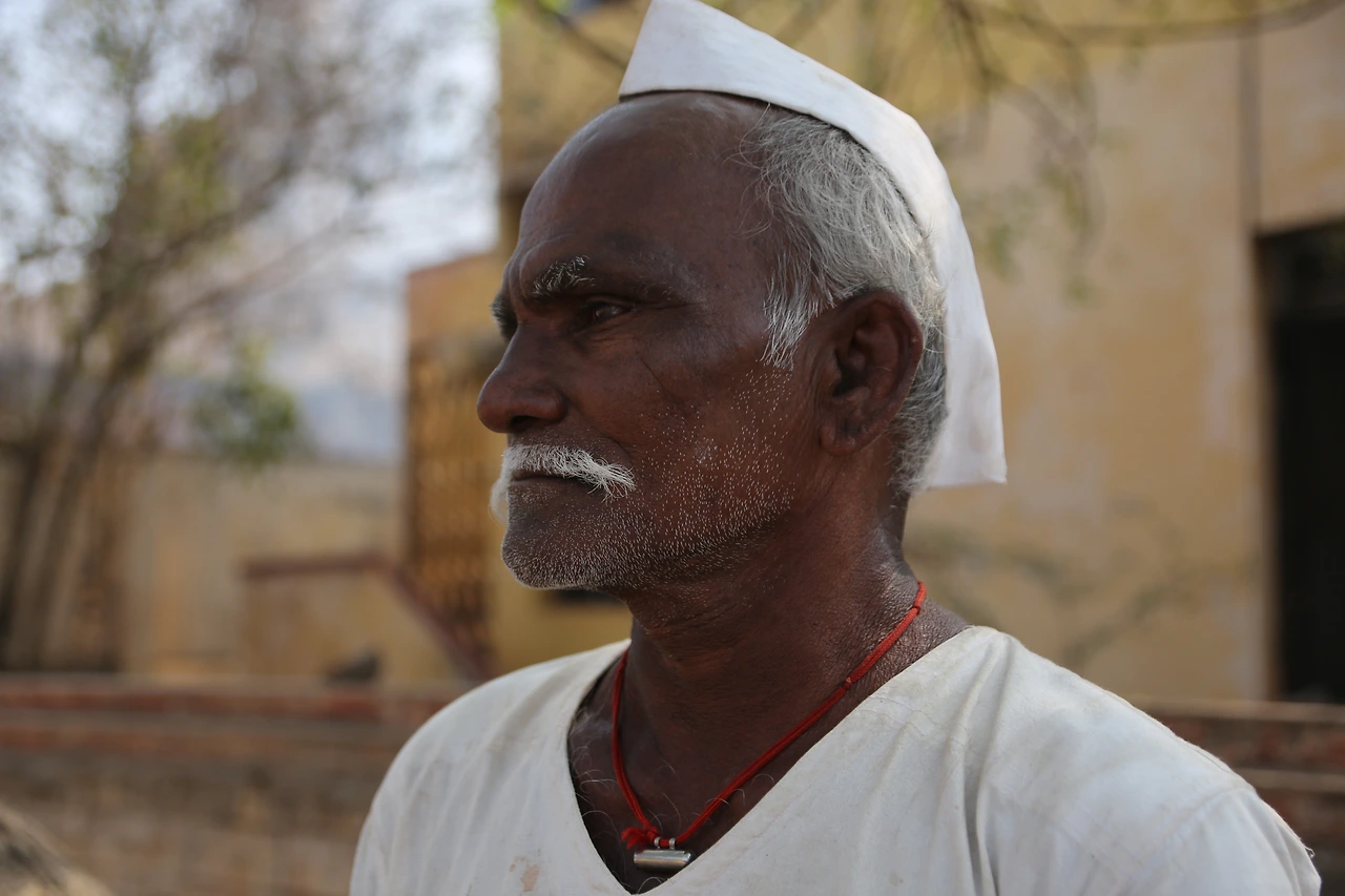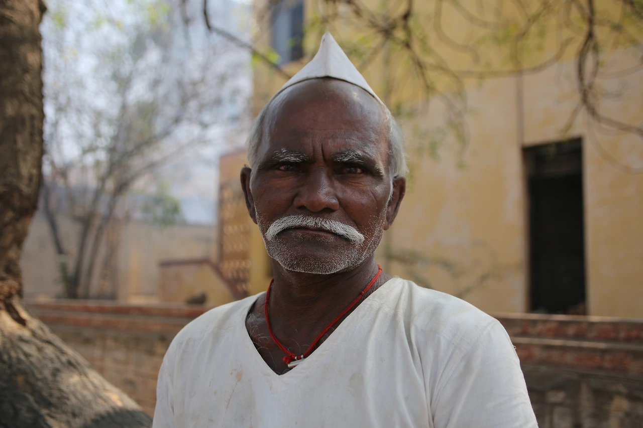 대부분의 인도 남자들은 카라가 달린 셔츠를 입는데 카라가 없는 티셔츠를 입은 것부터 남다른 할아버지의 근육이 제법 탄탄해 보입니다.