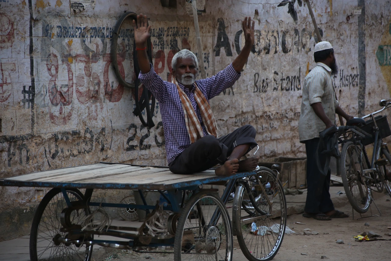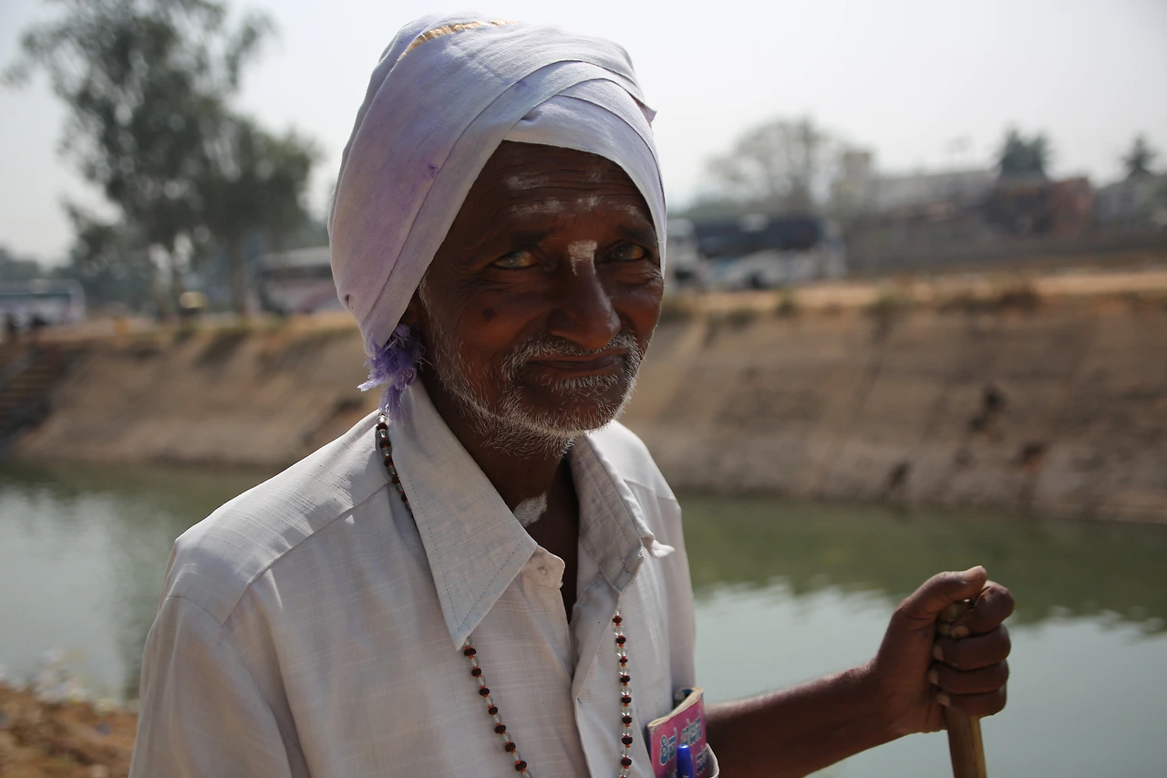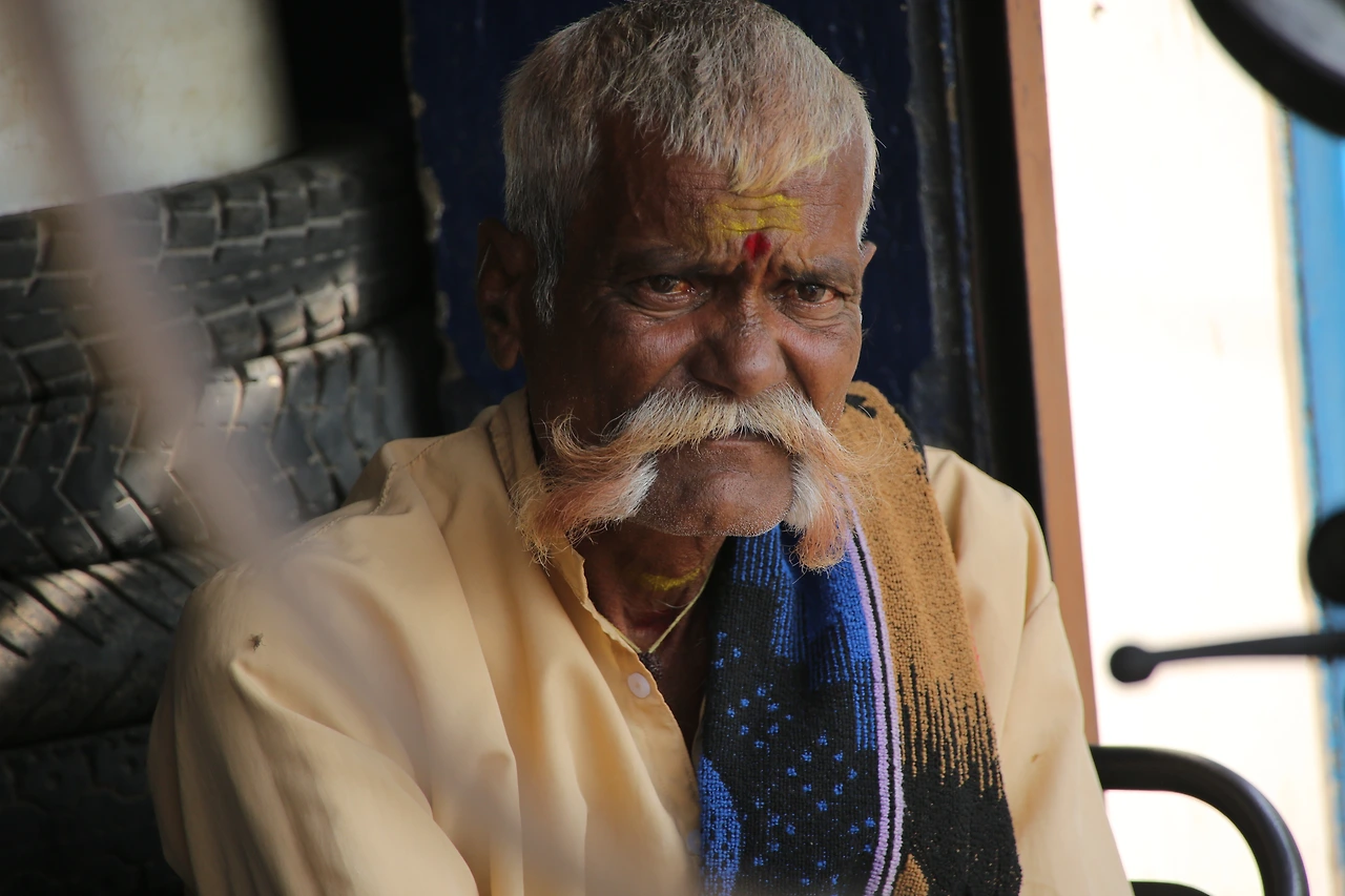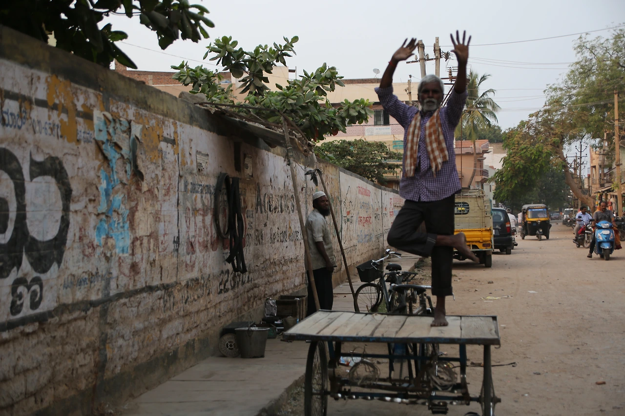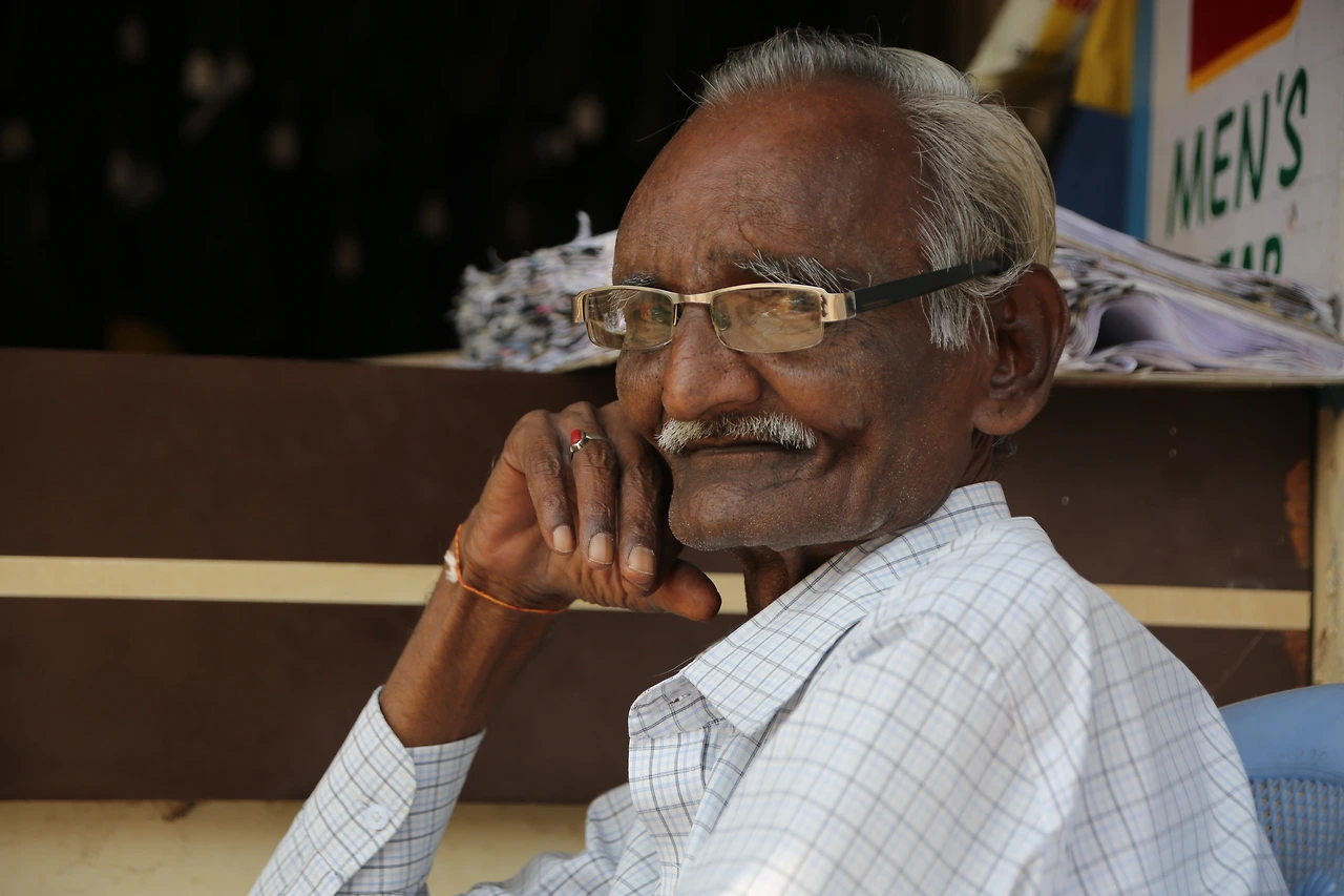 대부분의 인도 남자들은 카라가 달린 셔츠를 입는데 카라가 없는 티셔츠를 입은 것부터 남다른 할아버지의 근육이 제법 탄탄해 보입니다.