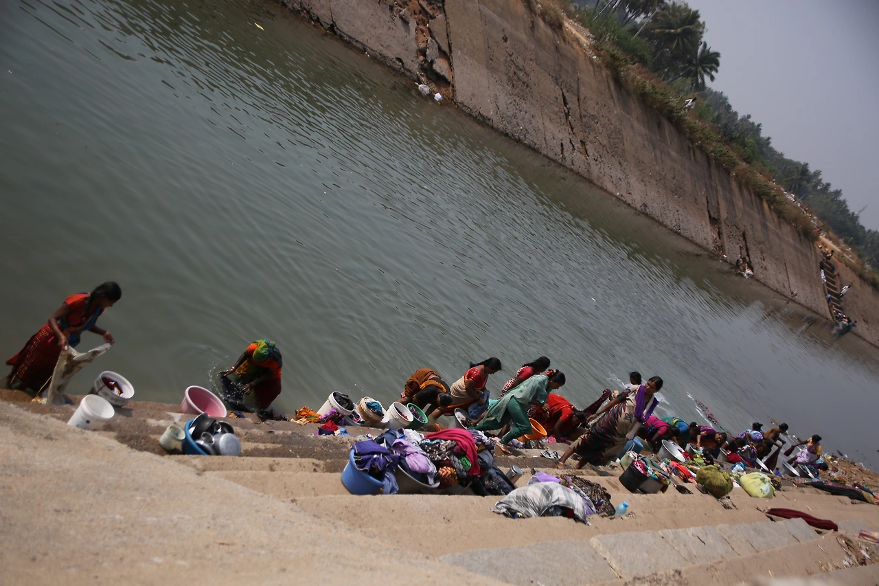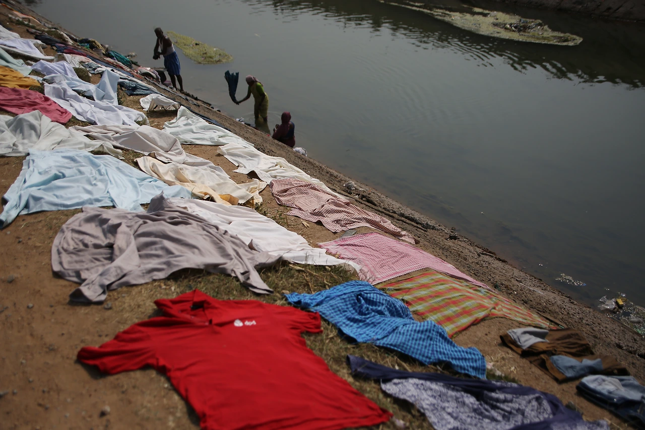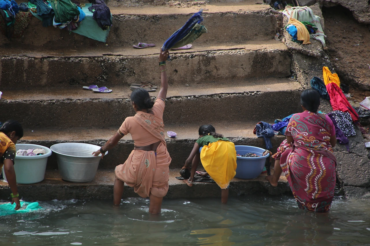 산더미 같은 빨래를 돌 위에 내려치고, 알 수 없는 세제에 담그고 헹구고 물을 짜는 손길이 분주합니다.
