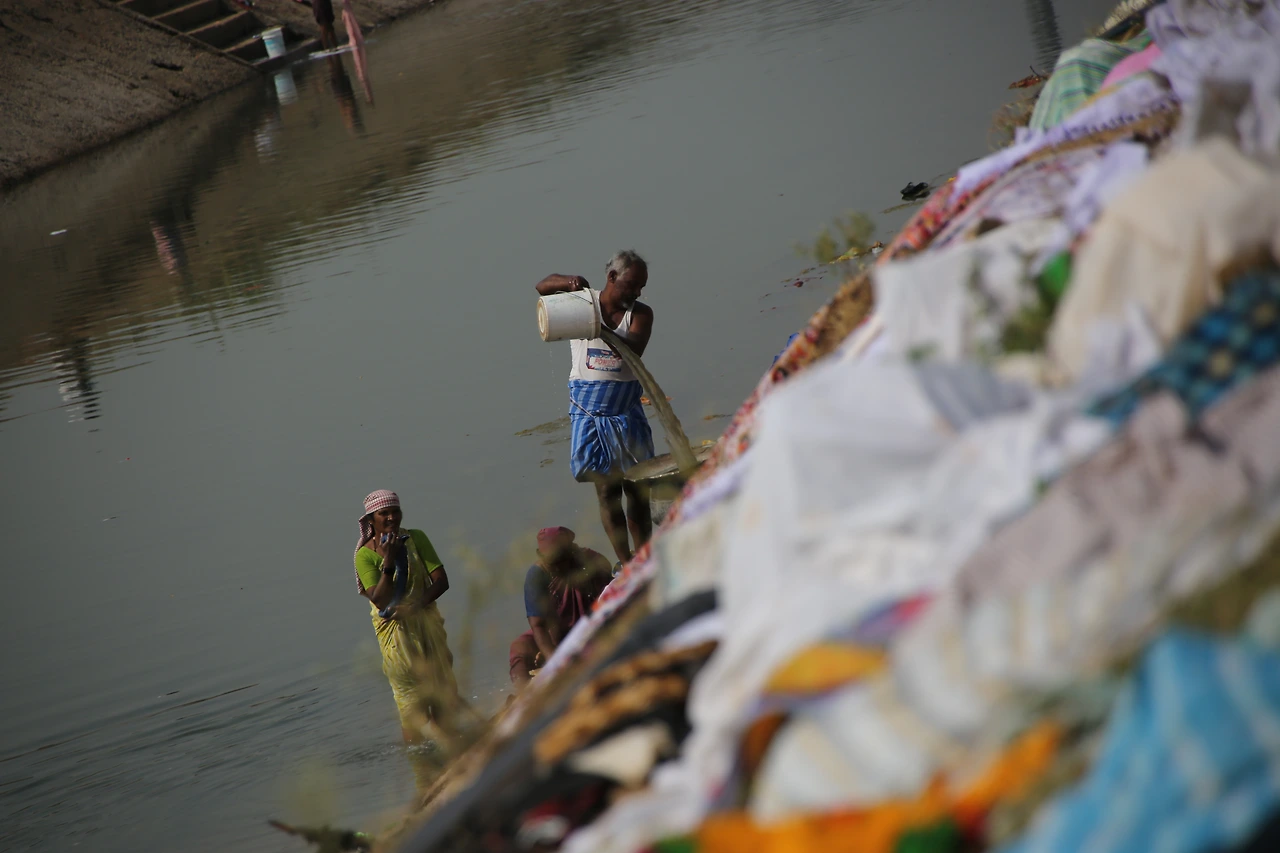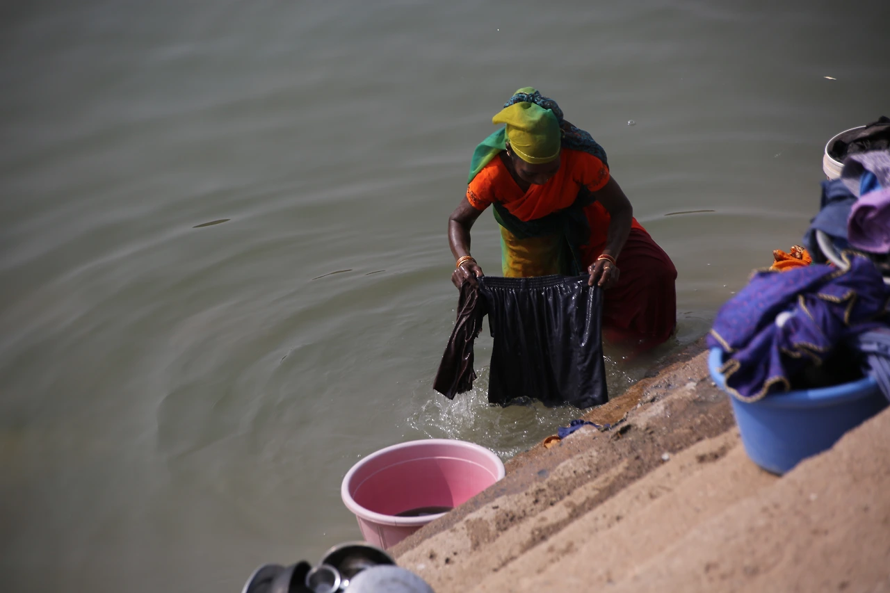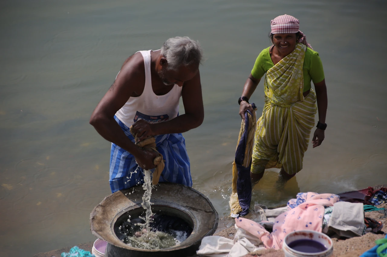 산더미 같은 빨래를 돌 위에 내려치고, 알 수 없는 세제에 담그고 헹구고 물을 짜는 손길이 분주합니다.