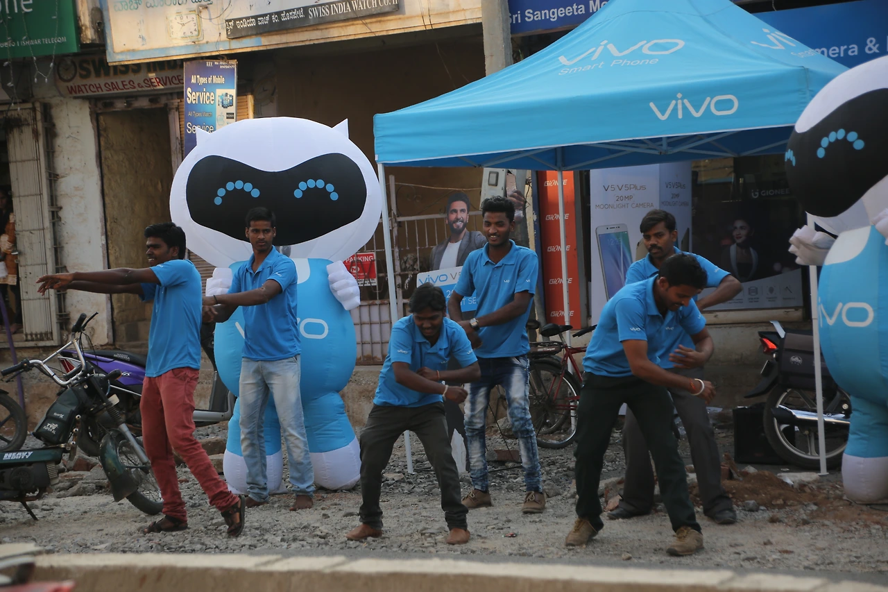 개업한 이동통신 vivo 매장 앞에서 T셔츠를 맞춰 입은 청년들이 댄스를 합니다.