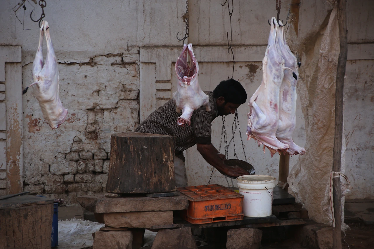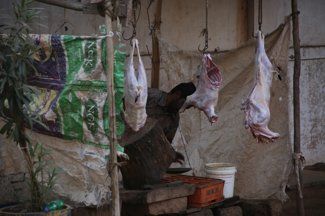 위생이라는 단어는 필요 없어 보이는 나무토막 도마와 녹슨 갈고리에 걸린 생고기가 그야말로 노 프라블럼입니다. 꼬랑지 끝의 털을 보니 무엇이지 짐작이 가는군요.