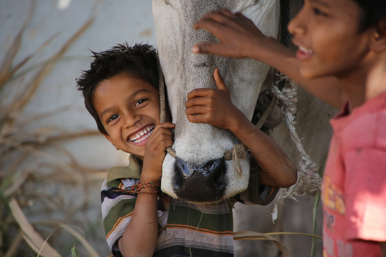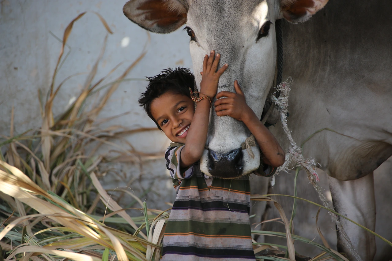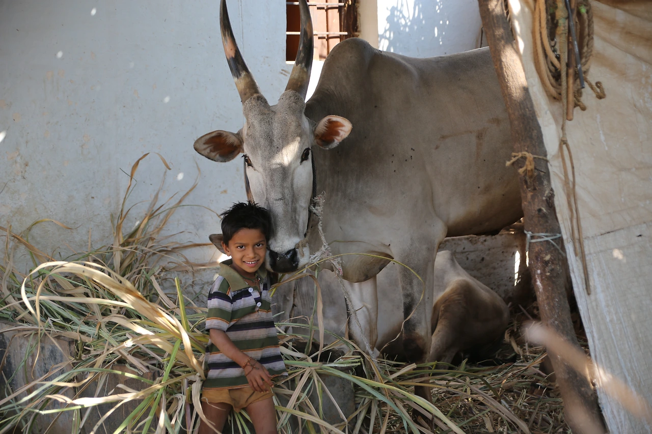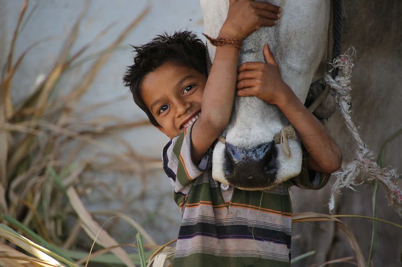 한 아이가 다짜고짜 집으로 달려 들어가더니 키우고 있는 물소를 끌어안으며 포즈를 취했습니다.