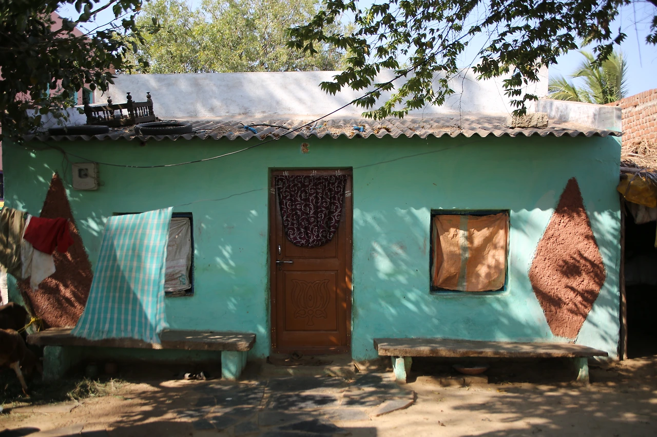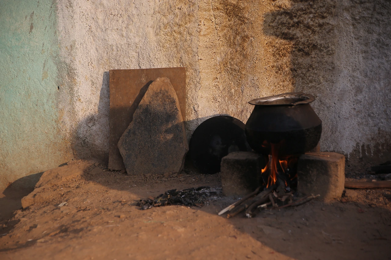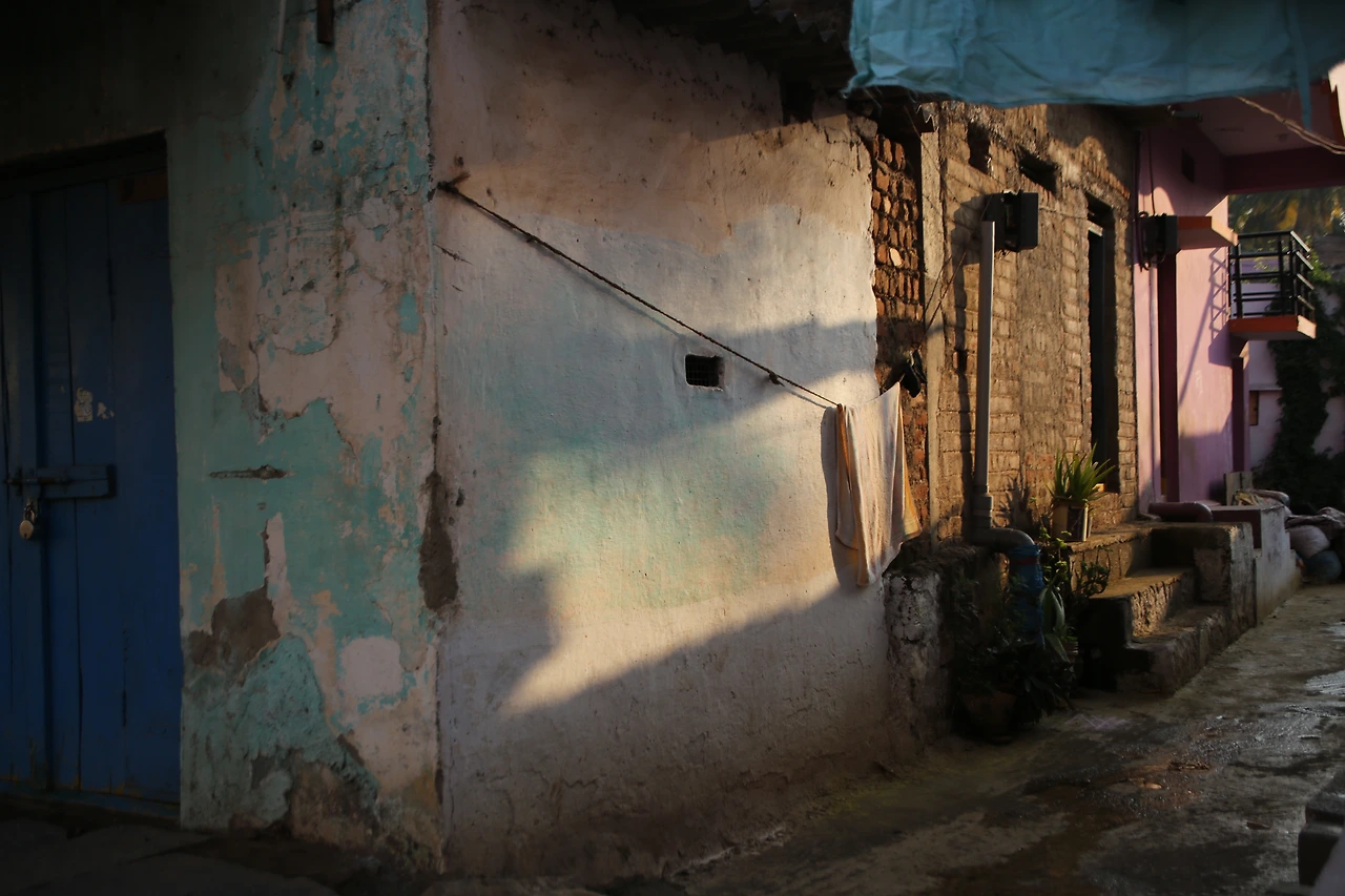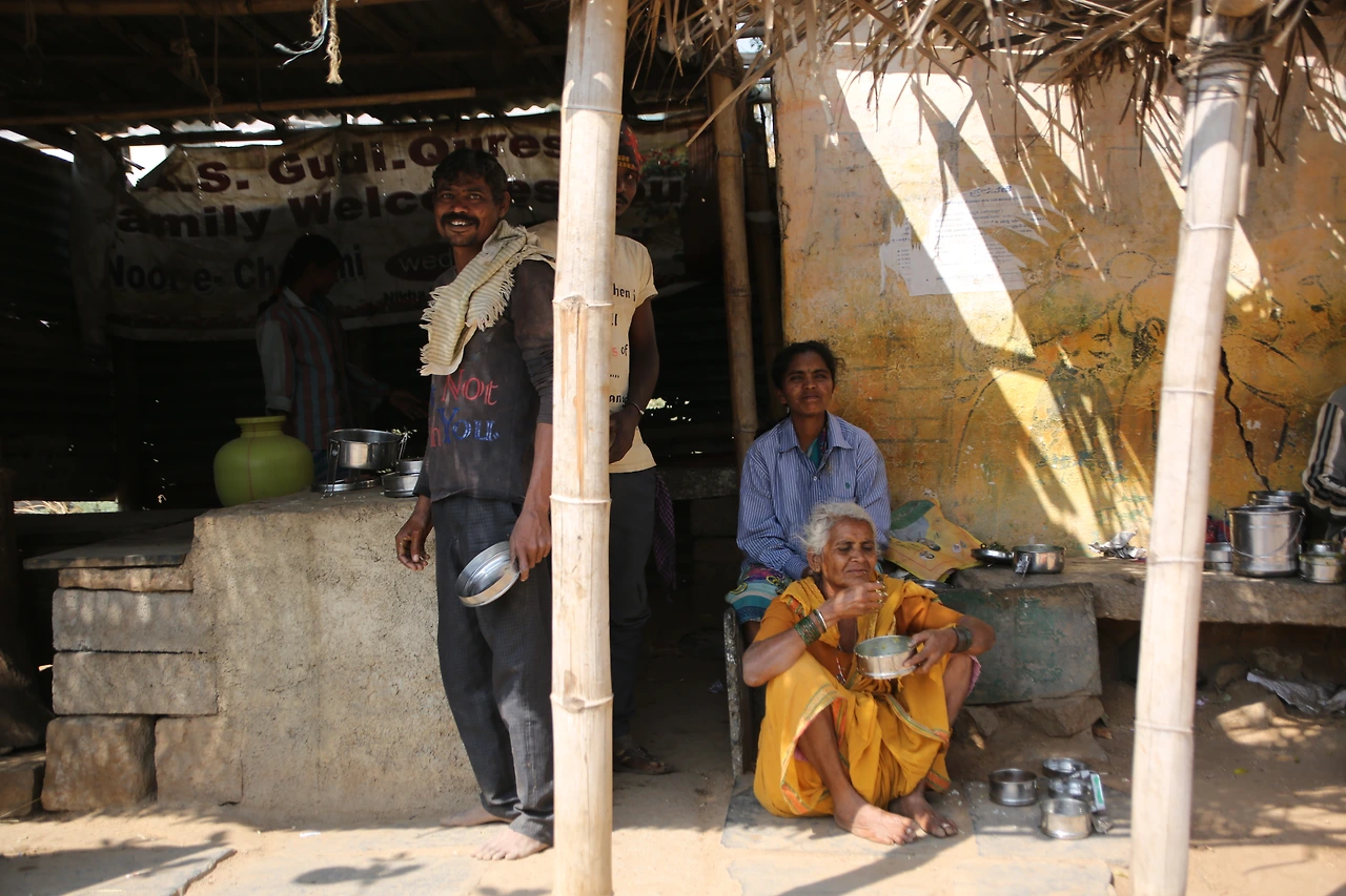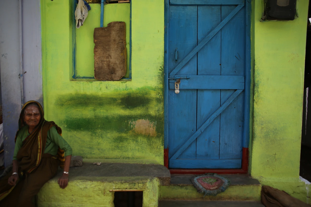 갈대 짚 이엉이 만들어내는 그림자 사이로 노란 사리를 입은 백발의 할머니가 손가락으로 식사를 하십니다. 그 뒤로 놀랍게도 남자 셔츠를 입은 여인이 허공을 응시하고 있어요. 도회지에서 아가씨들이 청바지를 입은 모습도 보기 드문 곳이 인도입니다. 하물며 그 작은 마을의 아낙이 남자 셔츠를 입고 있는 게 좀 의아하네요. 그릇 뚜껑을 든 남자가 공연히 웃어요. 대나무 기둥 뒤로 흘끗 보이는 남자 모습이 옛날 그림 속 이야기처럼 뭔가 얘깃거리가 될 것만 같습니다. 두 여인의 시선이 각각 다른 곳에 있는 반면 두 남자의 시선은 카메라를 향합니다. 마치 스토리가 있는 그림 같아요. 구도며 거리, 빛의 감도, 뭐 그런 것들을 모두 떠나서 말이죠.