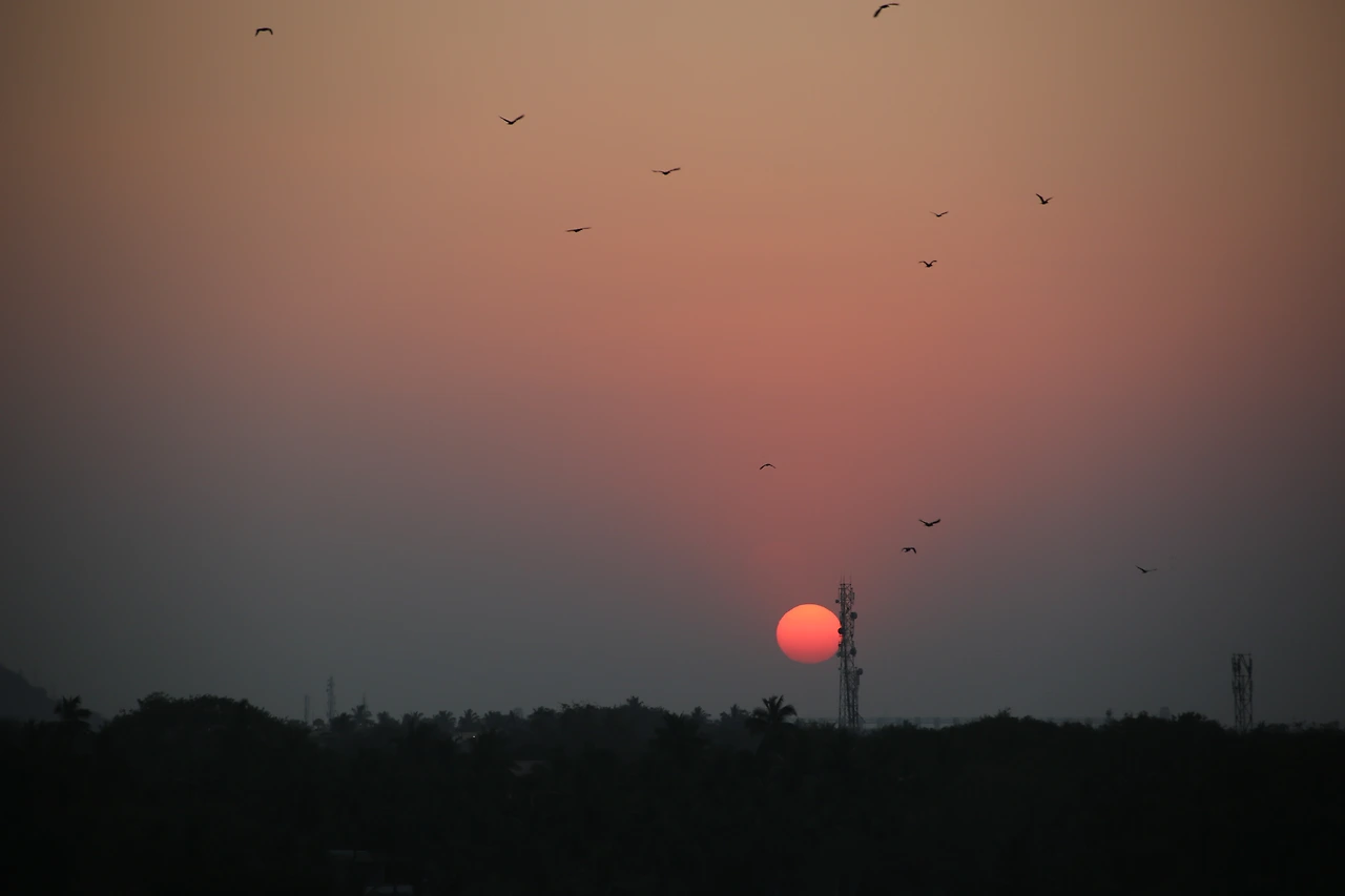 붉은 노을을 등지고 집으로 돌아가는 새들이 호텔 창으로 보이네요.