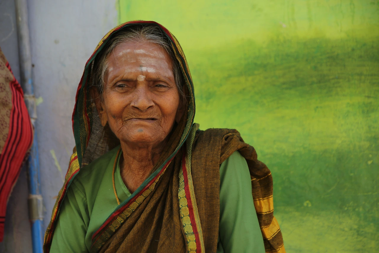 머리를 하나로 땋아 내린 여인의 사리 속에 입은 촐리와 보라색 나무 의자가 조화롭습니다.