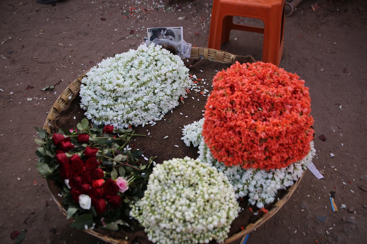 비닐 매트와 사리가 들려있는 빨래 줄 앞으로 종려나무 이파리가 마치 커튼 자락처럼, 클레오파트라의 머리카락처럼 펼쳐져 있습니다. 인도 사람들의 배경에는 늘 유화보다 강렬한 아크릴 물감이 펼쳐져 있어요.