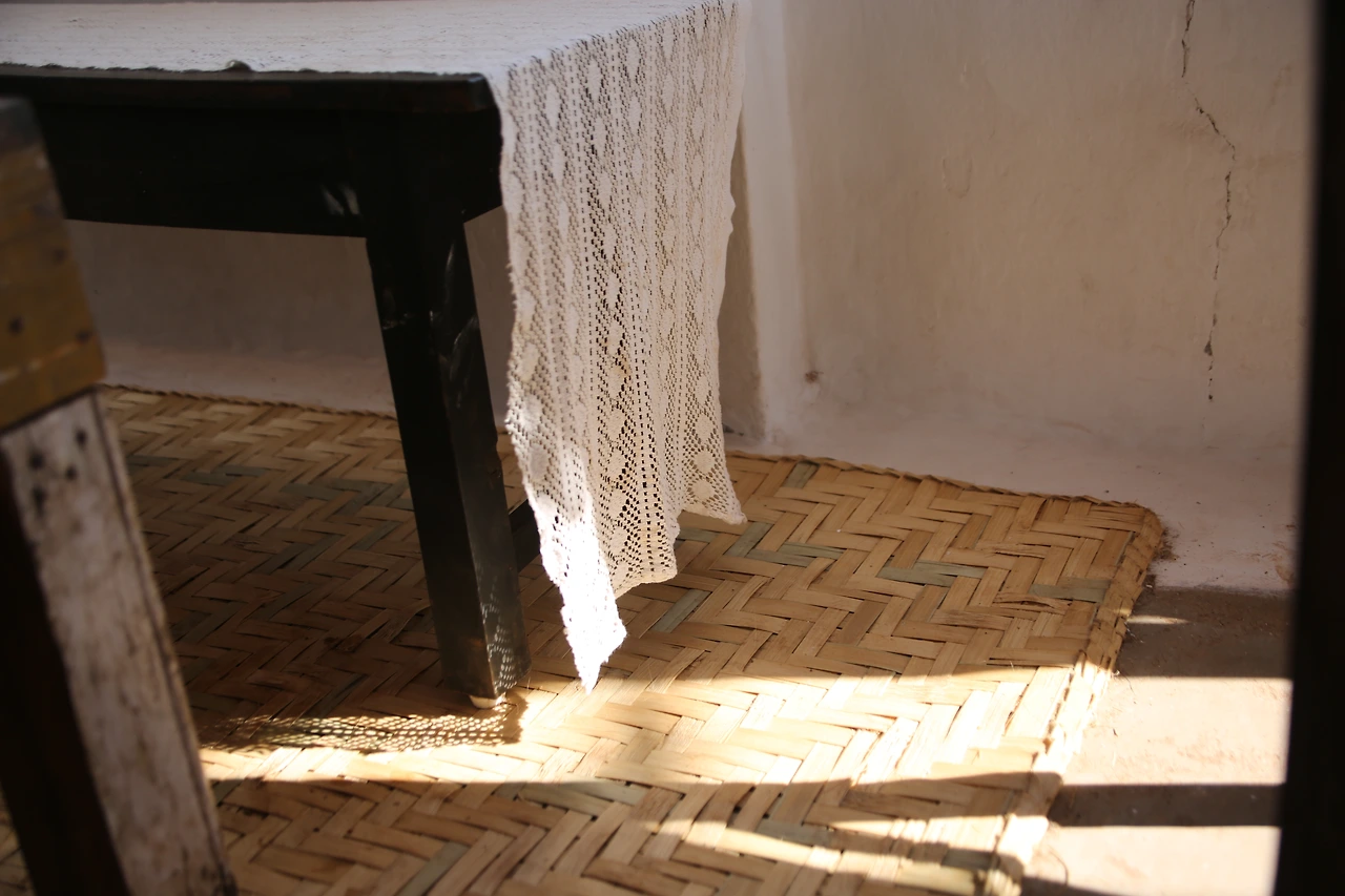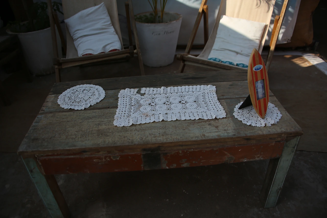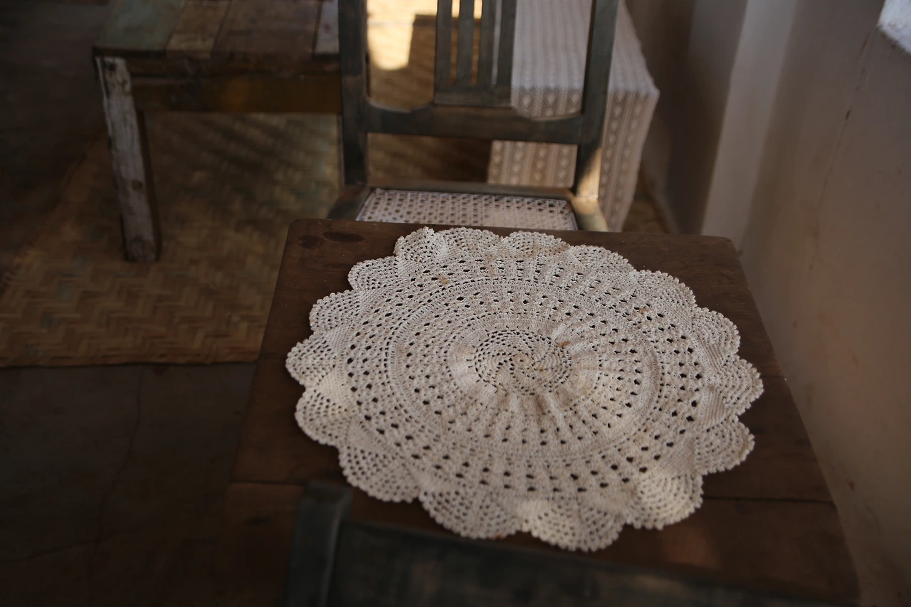 크기와 모양이 다른 면실로 짠 레이스 테이블보가 여기저기 놓여있고 하얀 회 칠을 한 작은 화분 세 개,