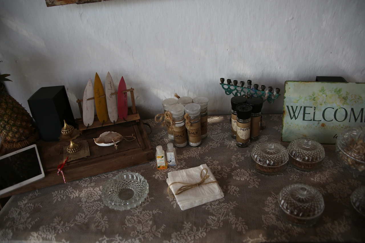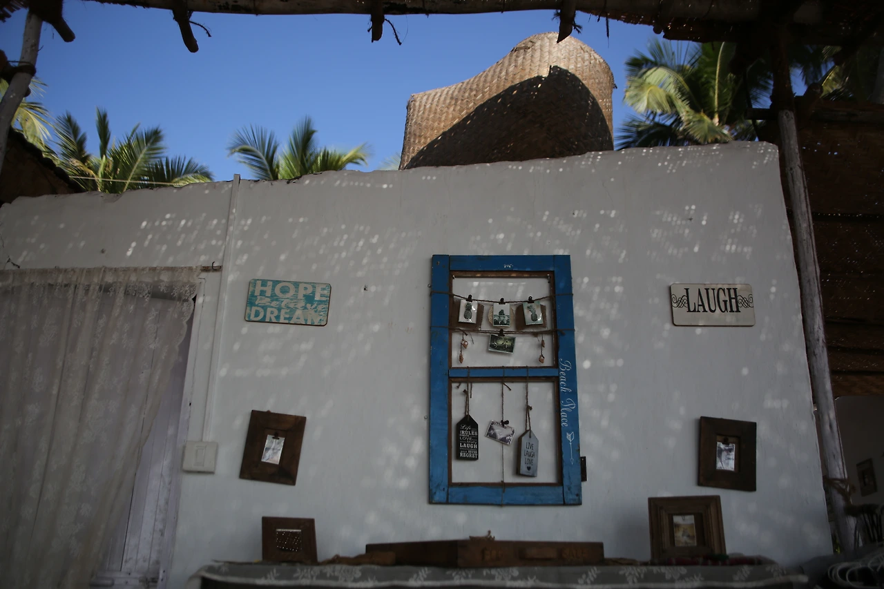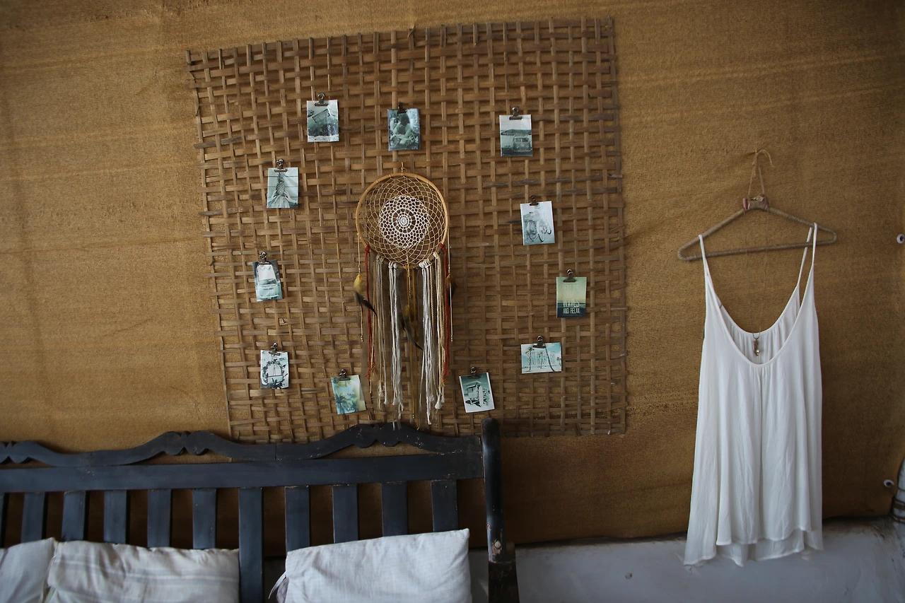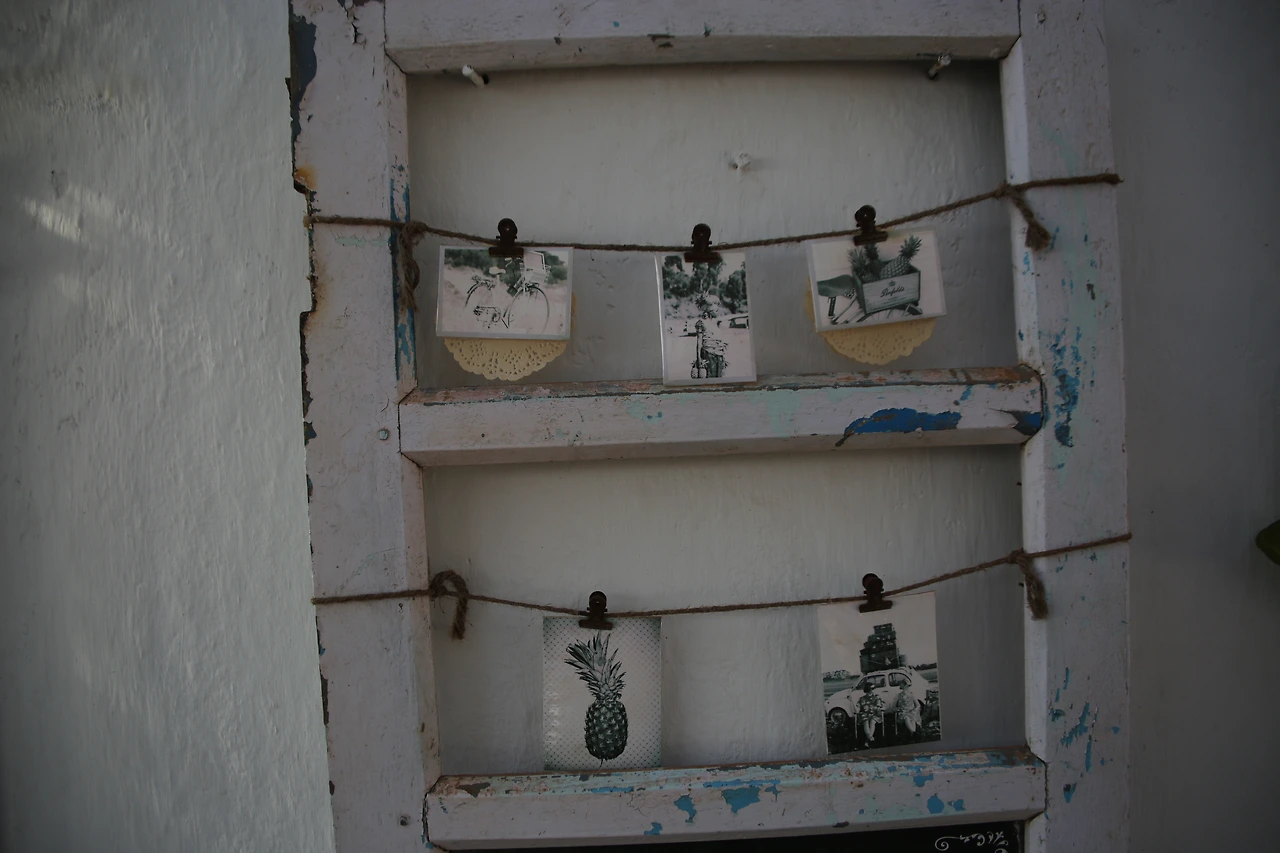 린넨 천에 올려진 조개껍데기 하나, 무채색 파라솔과 대나무로 짠 벽걸이엔 걸린 작은 사진들,