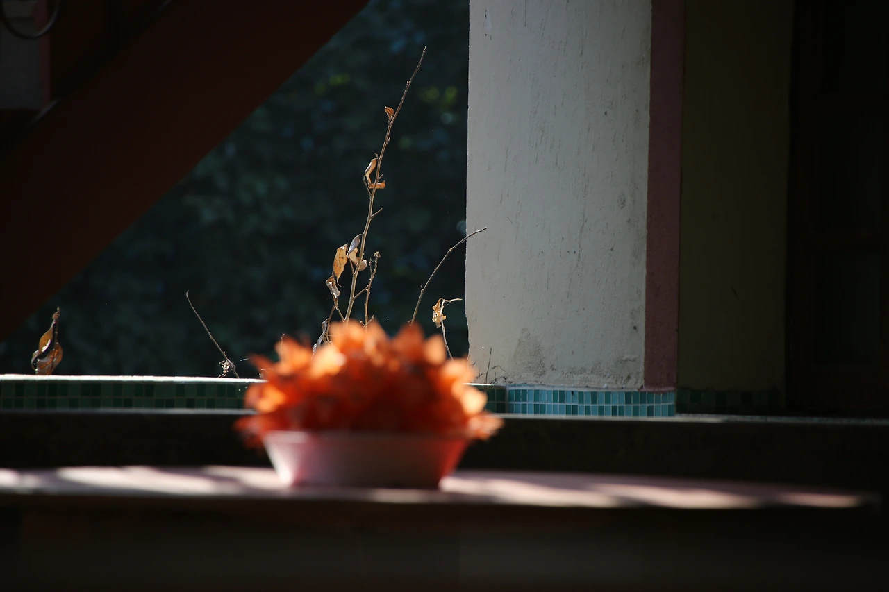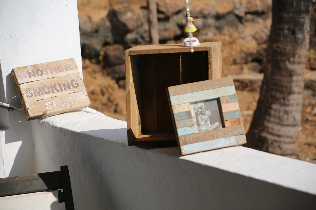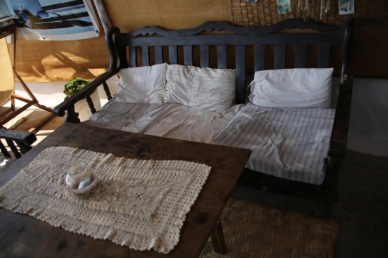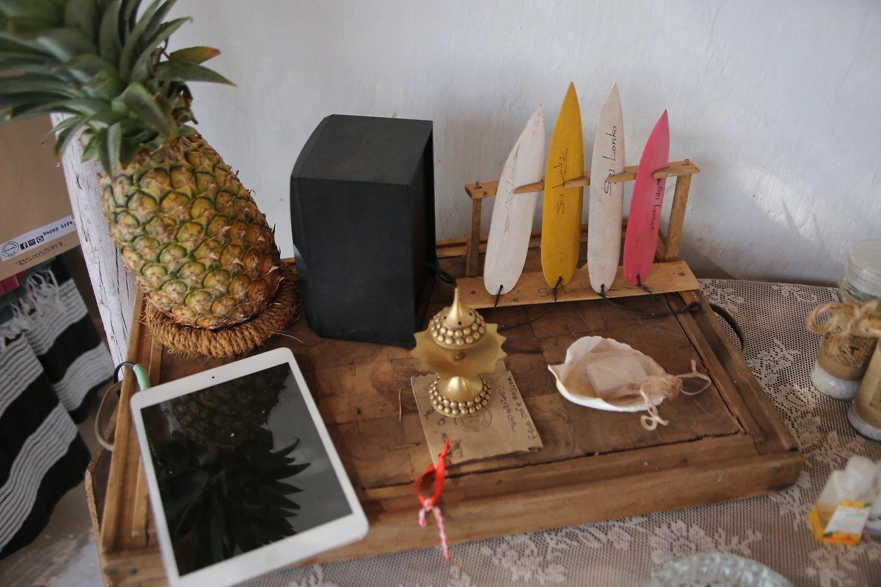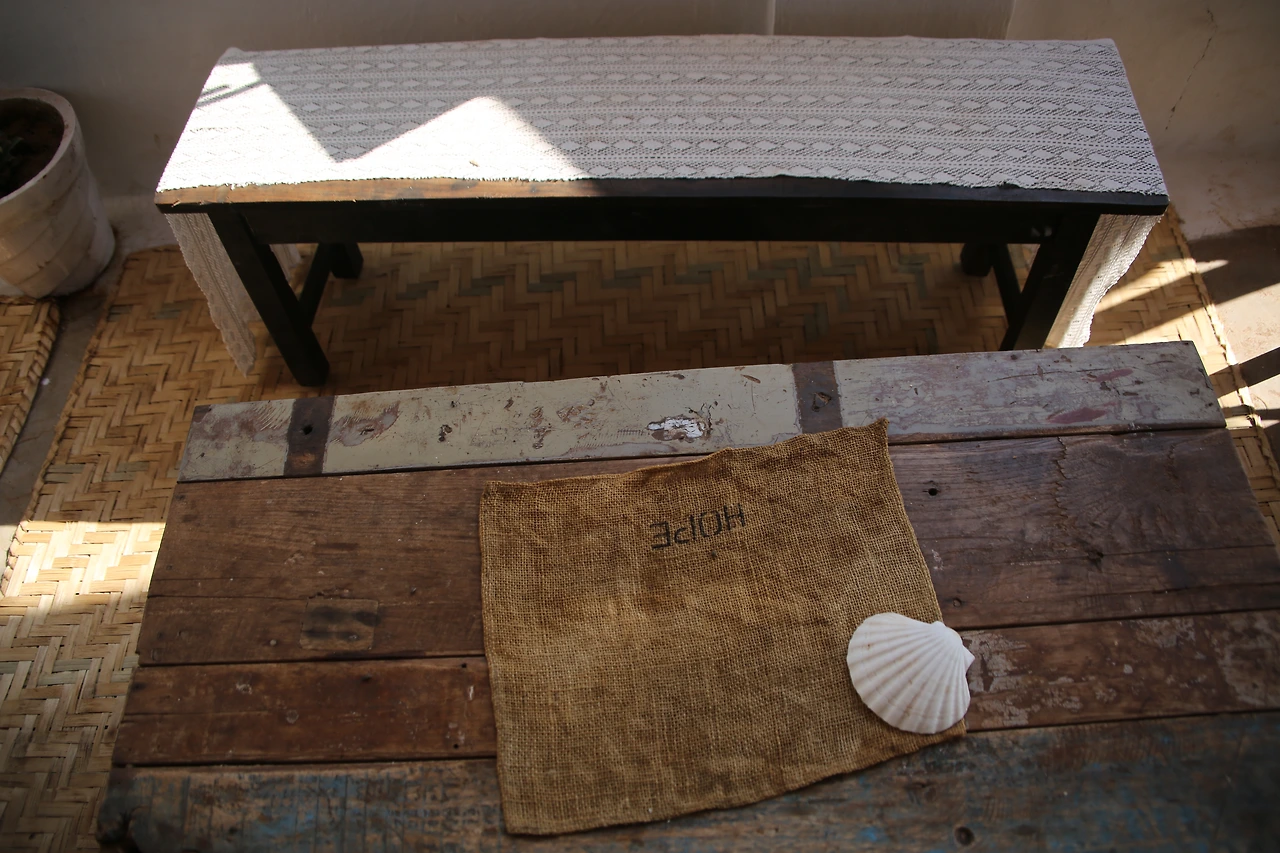 린넨 천에 올려진 조개껍데기 하나, 무채색 파라솔과 대나무로 짠 벽걸이엔 걸린 작은 사진들,