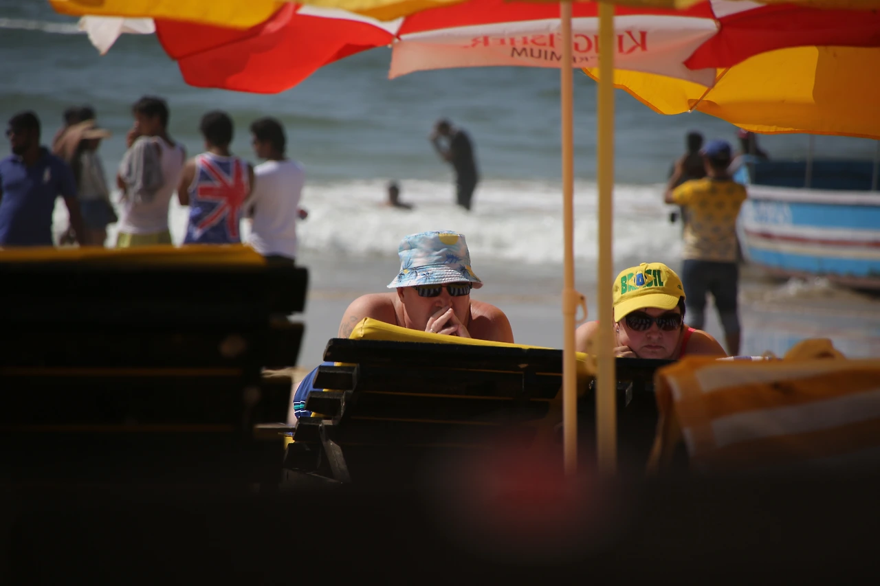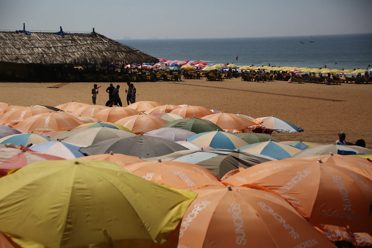 노랗고 빨간 수 백 개의 파라솔이 질서 있게 펼쳐져 있고 수영복이 아닌 반바지와 티셔츠를 입은 채 바다에 뛰어든 인디언들이 거의 대부분입니다.