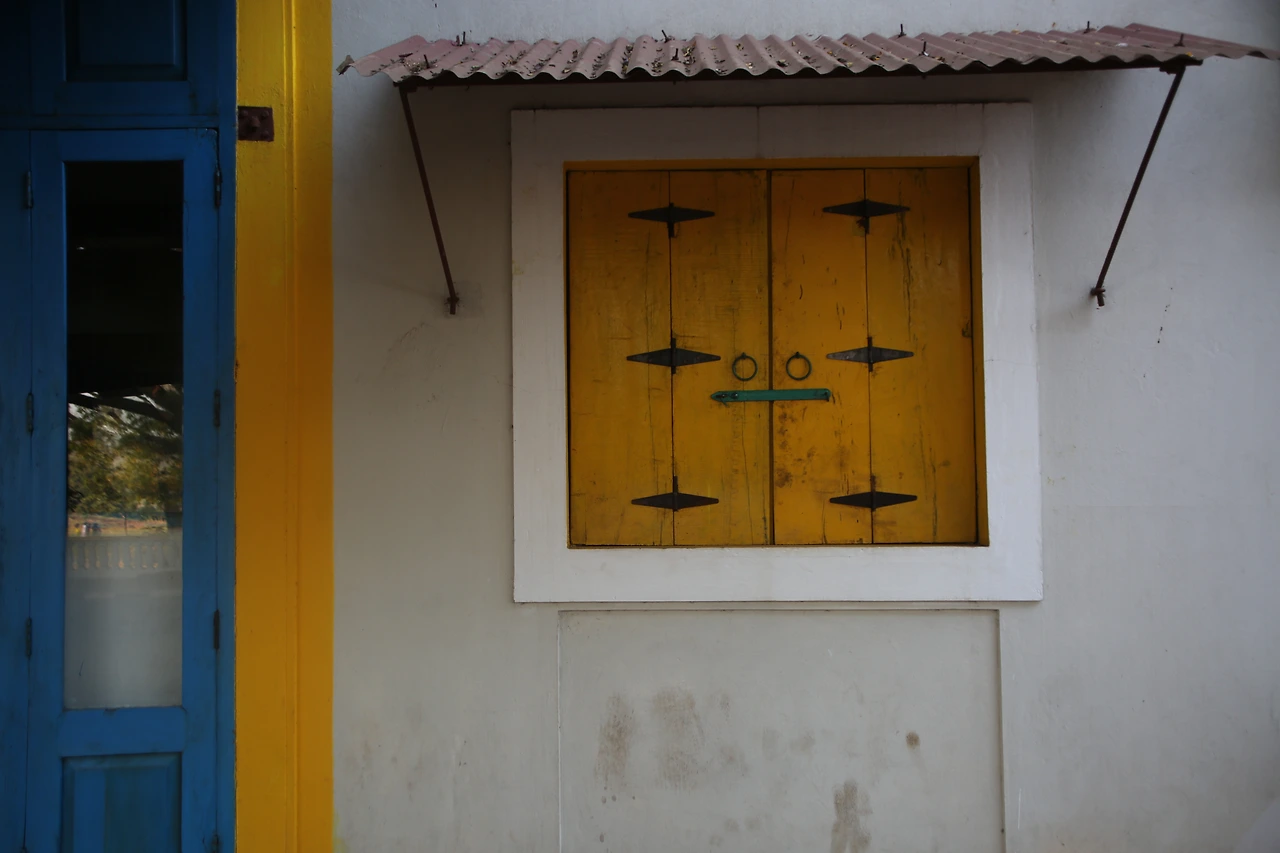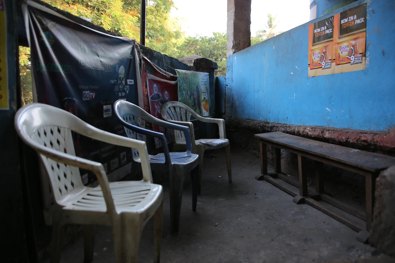 낡은 플라스틱 의자 몇 개와 청소를 기다리며 세워진 비가 이채로운 모습이에요.