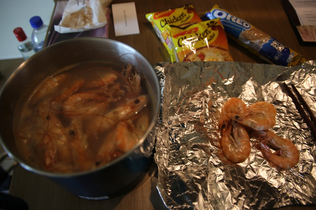 대하라고 할 수 있는 크기의 새우 스무 마리와 오렌지 2개를 샀어요.