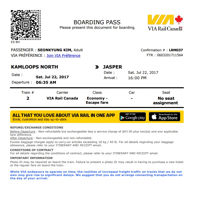캐나다는 비아 레일이라는 기차를 타고 밴쿠버에서 토론토까지 횡단할 수 있습니다. 동서 횡단 거리는 무려 4,500km이며 80시간이 걸리죠. 1주일에 3회만 운행하기에 예약은 필수입니다. 사촌이 사는 Kamloops는 밴쿠버를 떠나 토론토까지 가는 비아 레일의 첫 번 째 도착역이며 그다음 역은 로키 마운틴 국립공원이 있는 재스퍼예요. 기차를 타고 Kamloops에서 간다면 그곳에서 적어도 3박은 해야 다음 기차를 탈 수 있으므로 그레이하운드를 이용합니다. 버스를 타면 시간이 절약되고 다음 날 재스퍼로 가는 비아레일을 탈 수 있으니까요.