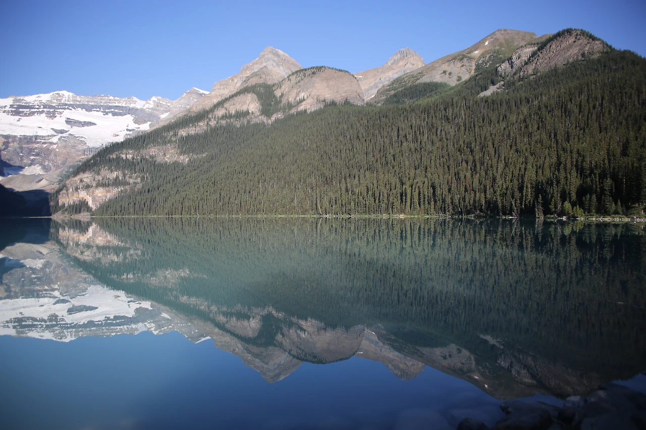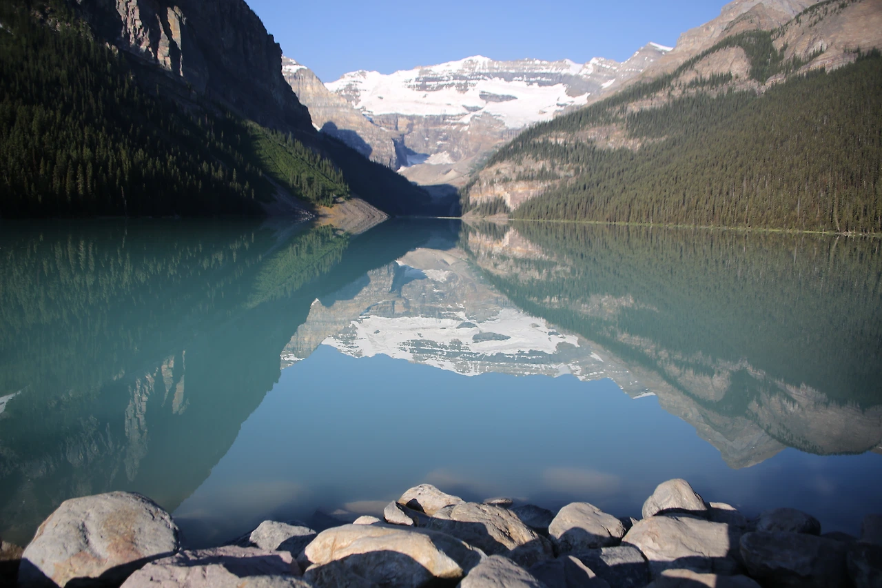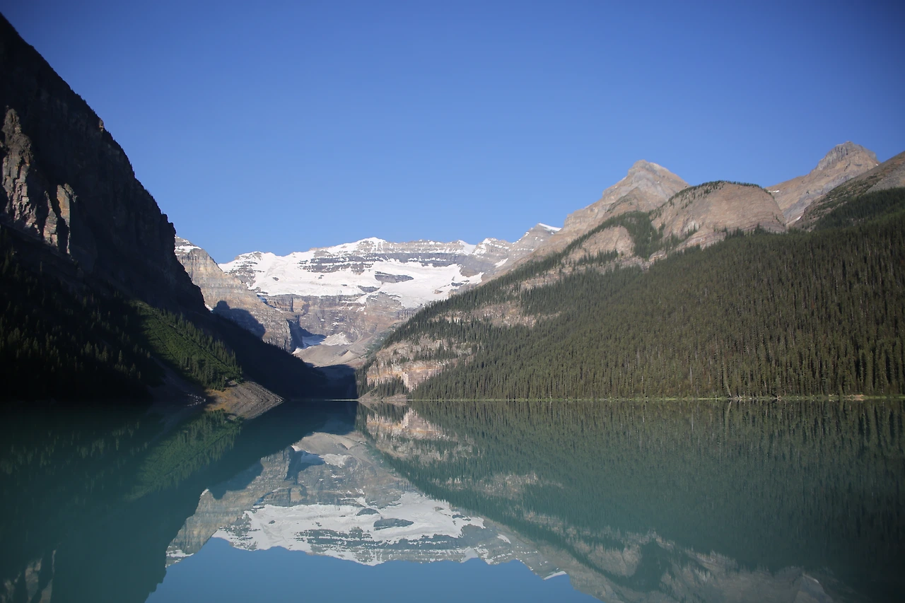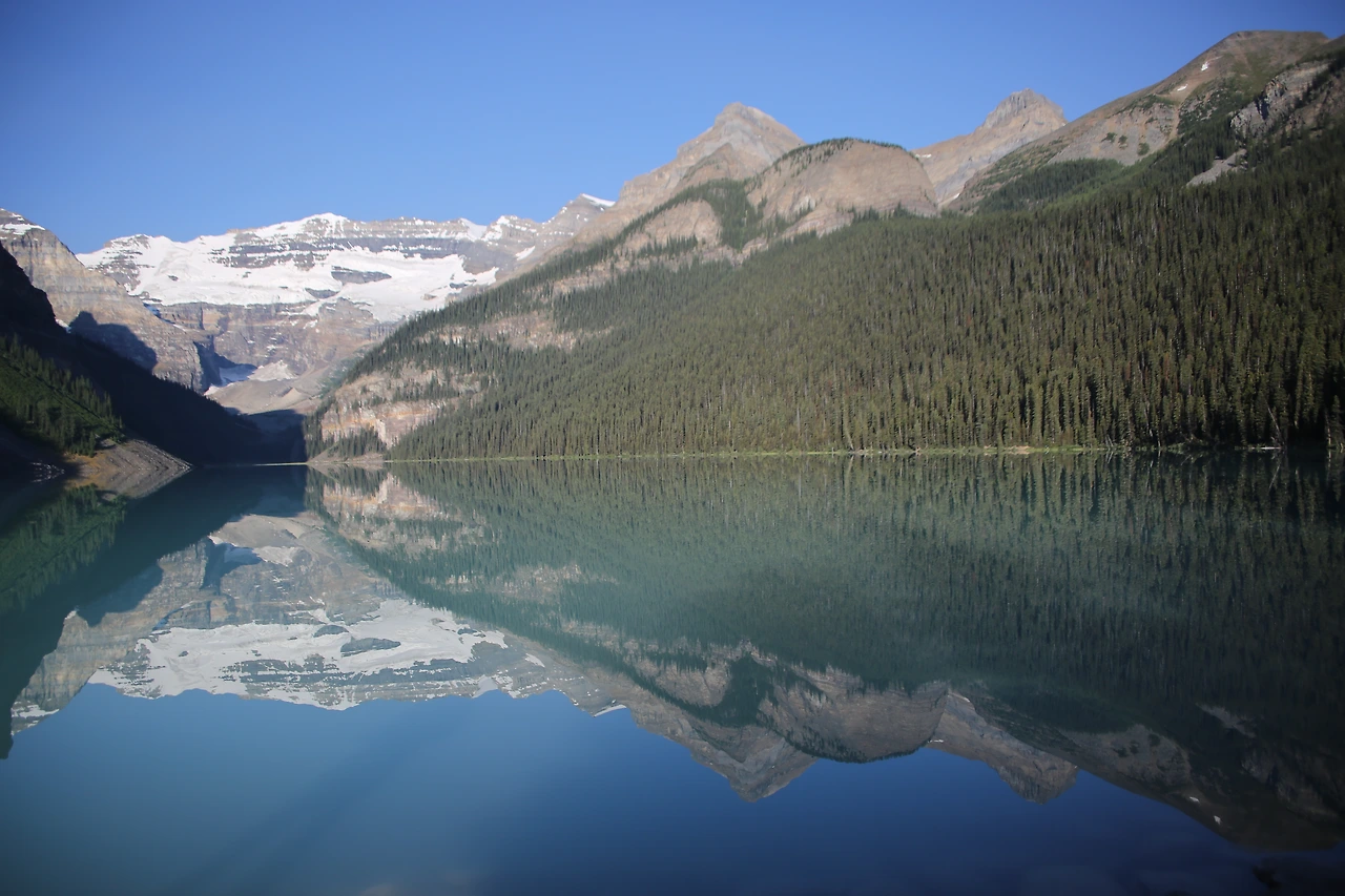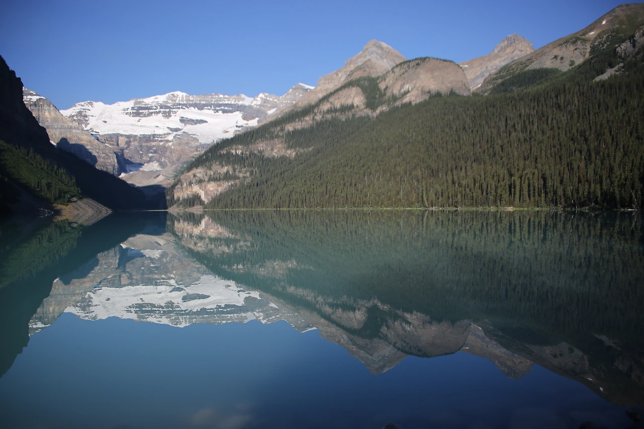 돌산에서 내려와 호수의 산책로를 따라 걷다 보니 어느새 사람들이 많아지기 시작했어요. 그러기도 할 것이 모레인 호수의 오픈 시기는 4월에서 10월이지만 6월까지 호수가 얼어있는 상황이라 호수의 아름다운 물빛을 보기 어렵기 때문입니다. 성수기인 7-8월엔 많은 사람이 몰려들기 때문에 아침 일찍 아니면 저녁 늦게 가는 게 최선이라는 것이지요. 이제 다시 레이크 루이스로 가는 길, 나와는 반대로 모레인으로 들어오느 자동차들이 꼬리에 꼬리를 물고 있습니다. 레이크 루이스에 도착하니 구름 한 점 없이 파한 하늘입니다. 호수는 순하디 순한 얼굴로 산과 나무를 물속에 그대로 품고 있습니다. 완벽한 대칭, 어딜 보나 데칼코마니였어요.