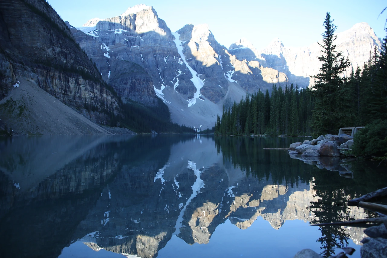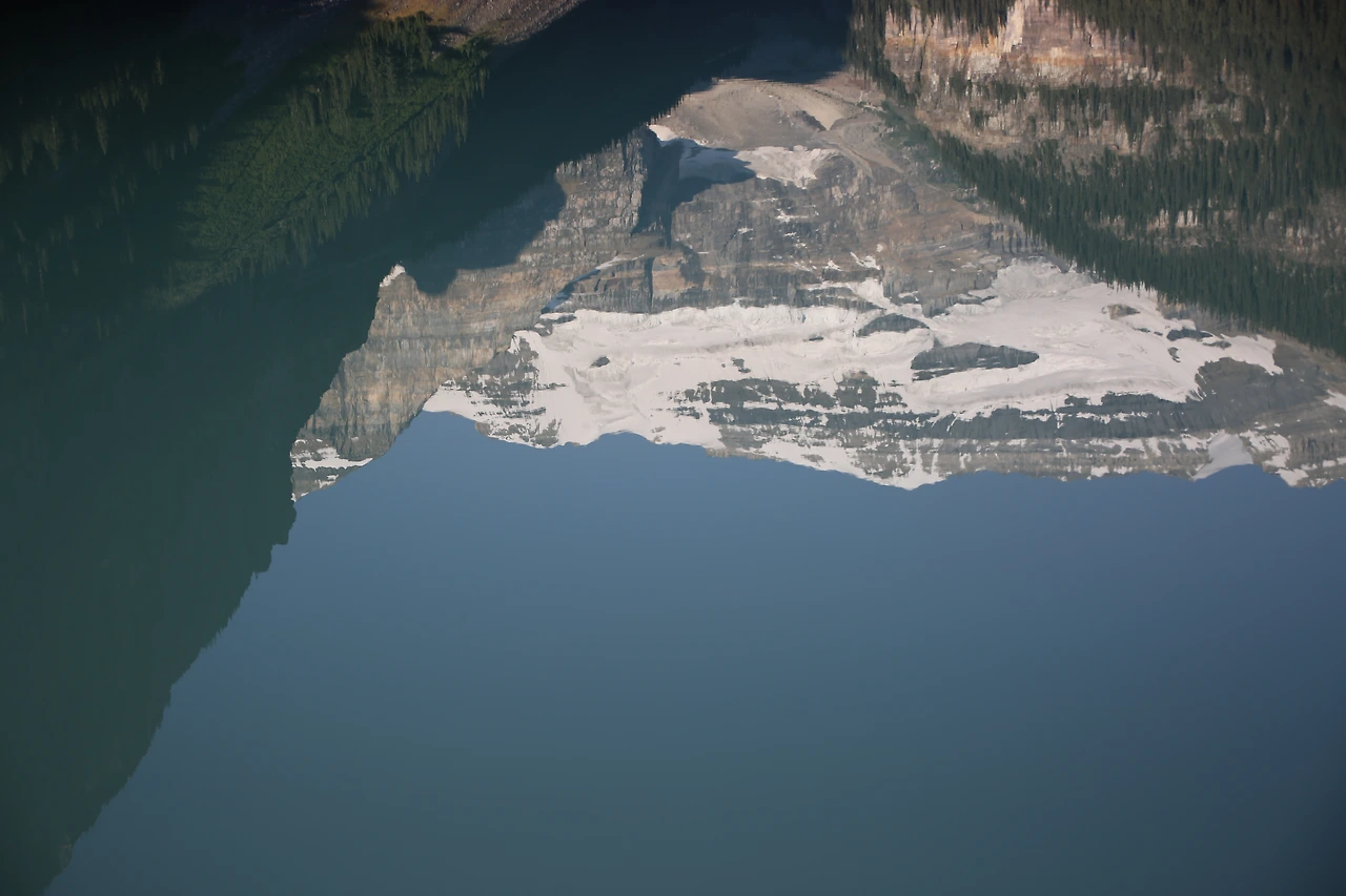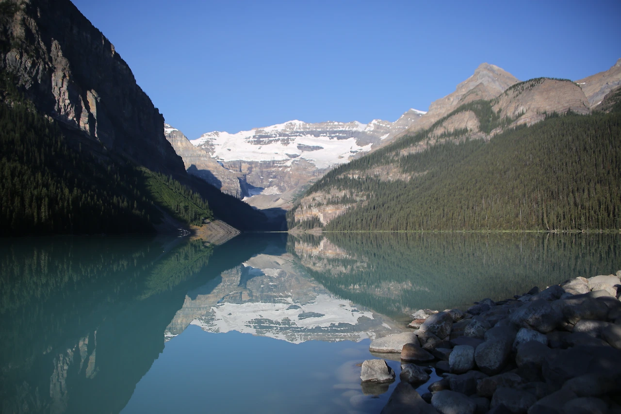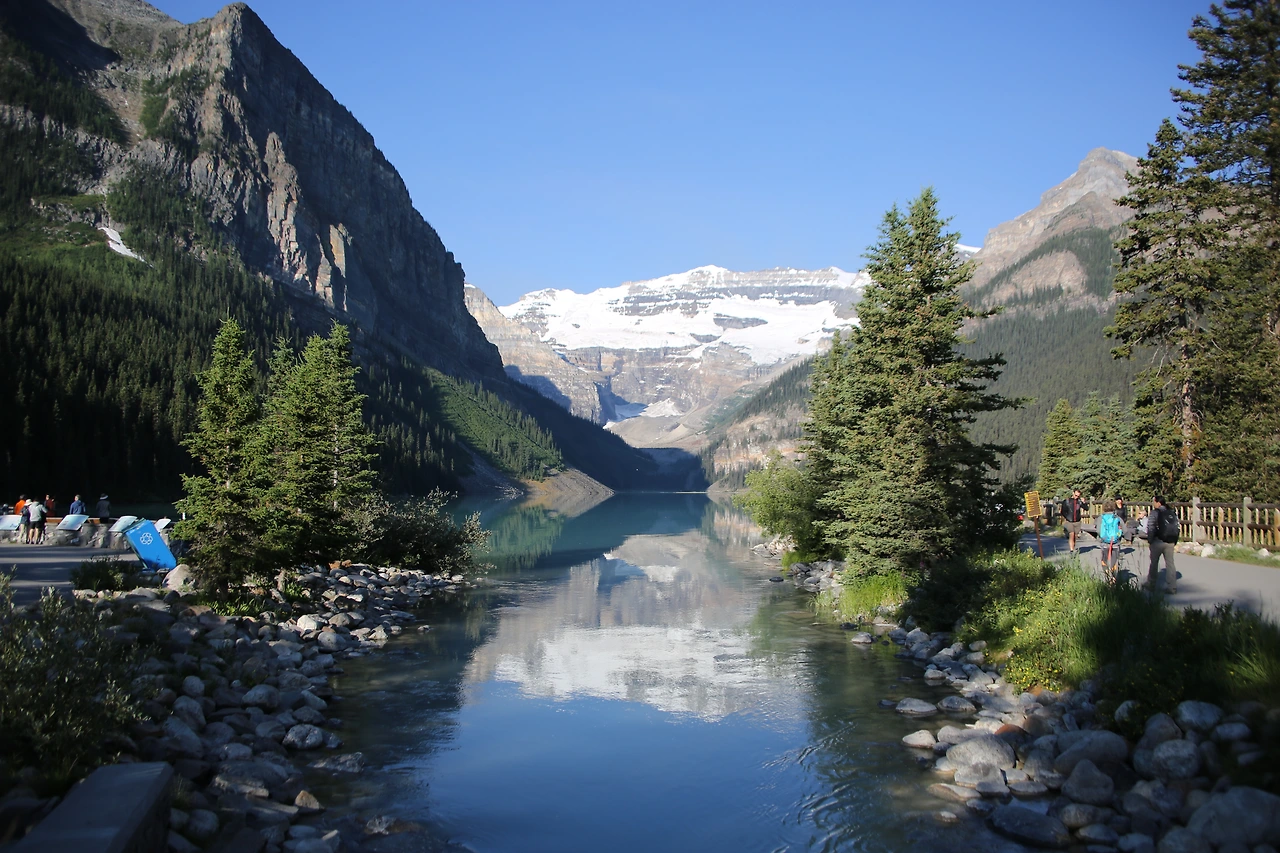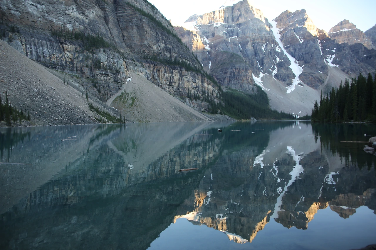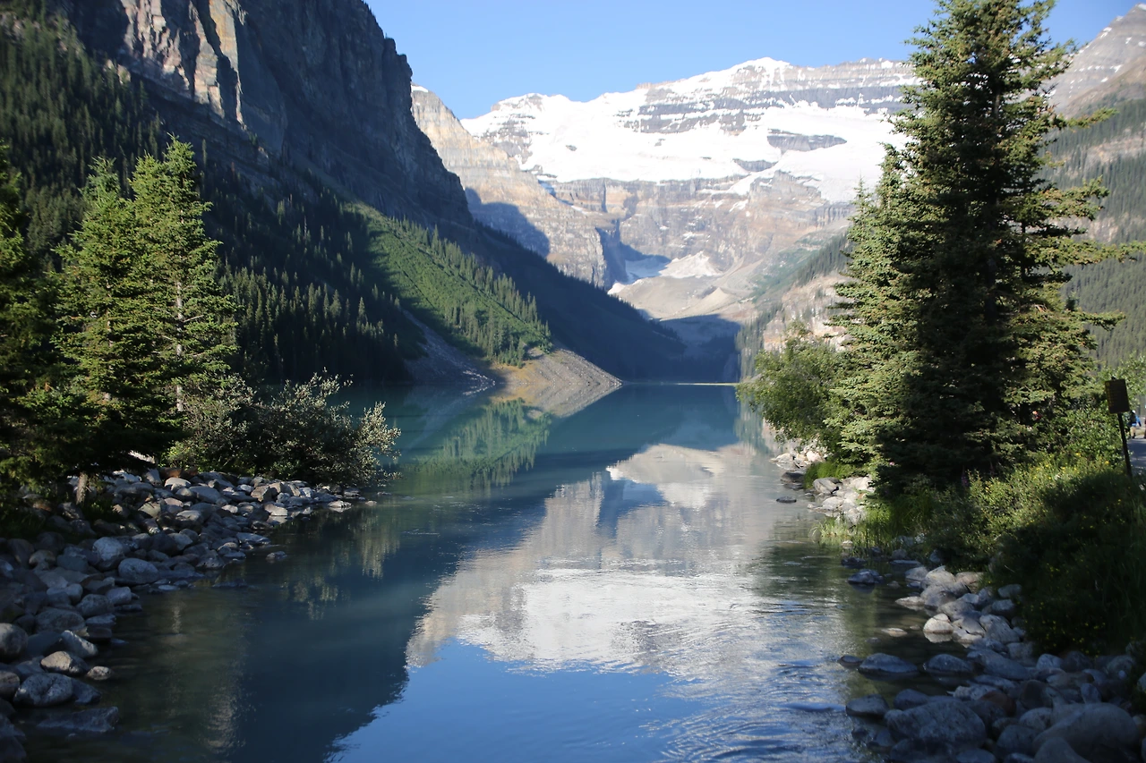 돌산에서 내려와 호수의 산책로를 따라 걷다 보니 어느새 사람들이 많아지기 시작했어요. 그러기도 할 것이 모레인 호수의 오픈 시기는 4월에서 10월이지만 6월까지 호수가 얼어있는 상황이라 호수의 아름다운 물빛을 보기 어렵기 때문입니다. 성수기인 7-8월엔 많은 사람이 몰려들기 때문에 아침 일찍 아니면 저녁 늦게 가는 게 최선이라는 것이지요. 이제 다시 레이크 루이스로 가는 길, 나와는 반대로 모레인으로 들어오느 자동차들이 꼬리에 꼬리를 물고 있습니다. 레이크 루이스에 도착하니 구름 한 점 없이 파한 하늘입니다. 호수는 순하디 순한 얼굴로 산과 나무를 물속에 그대로 품고 있습니다. 완벽한 대칭, 어딜 보나 데칼코마니였어요.
