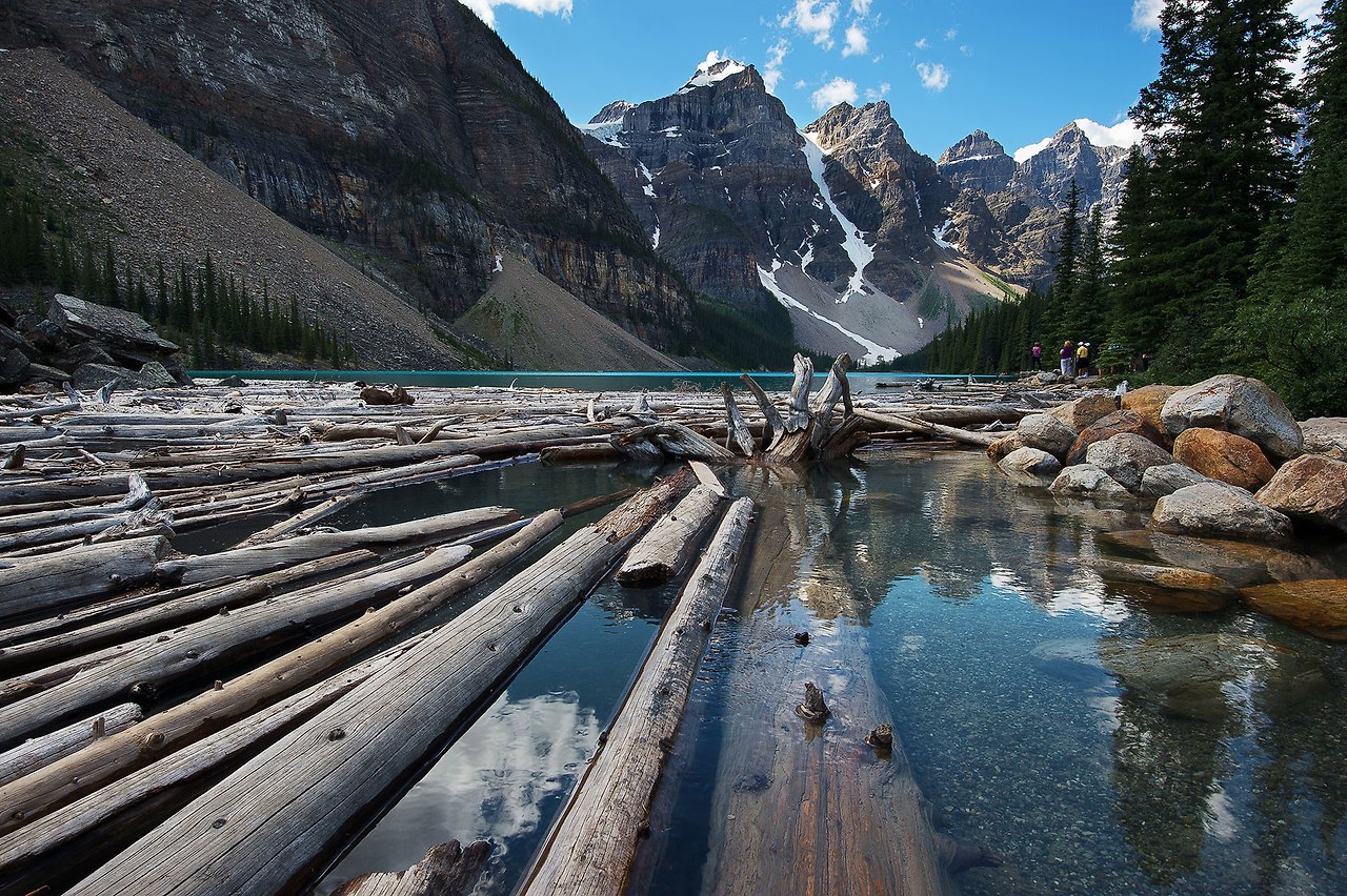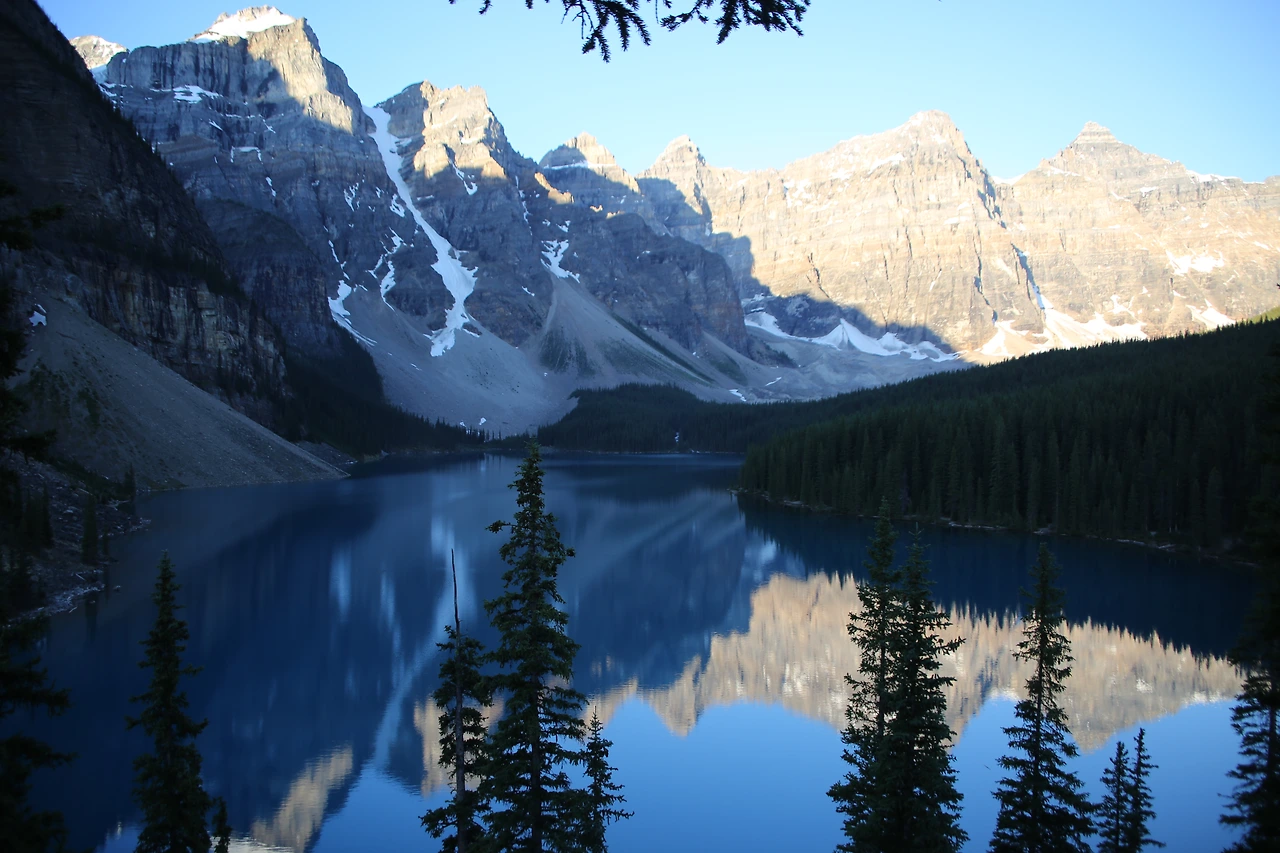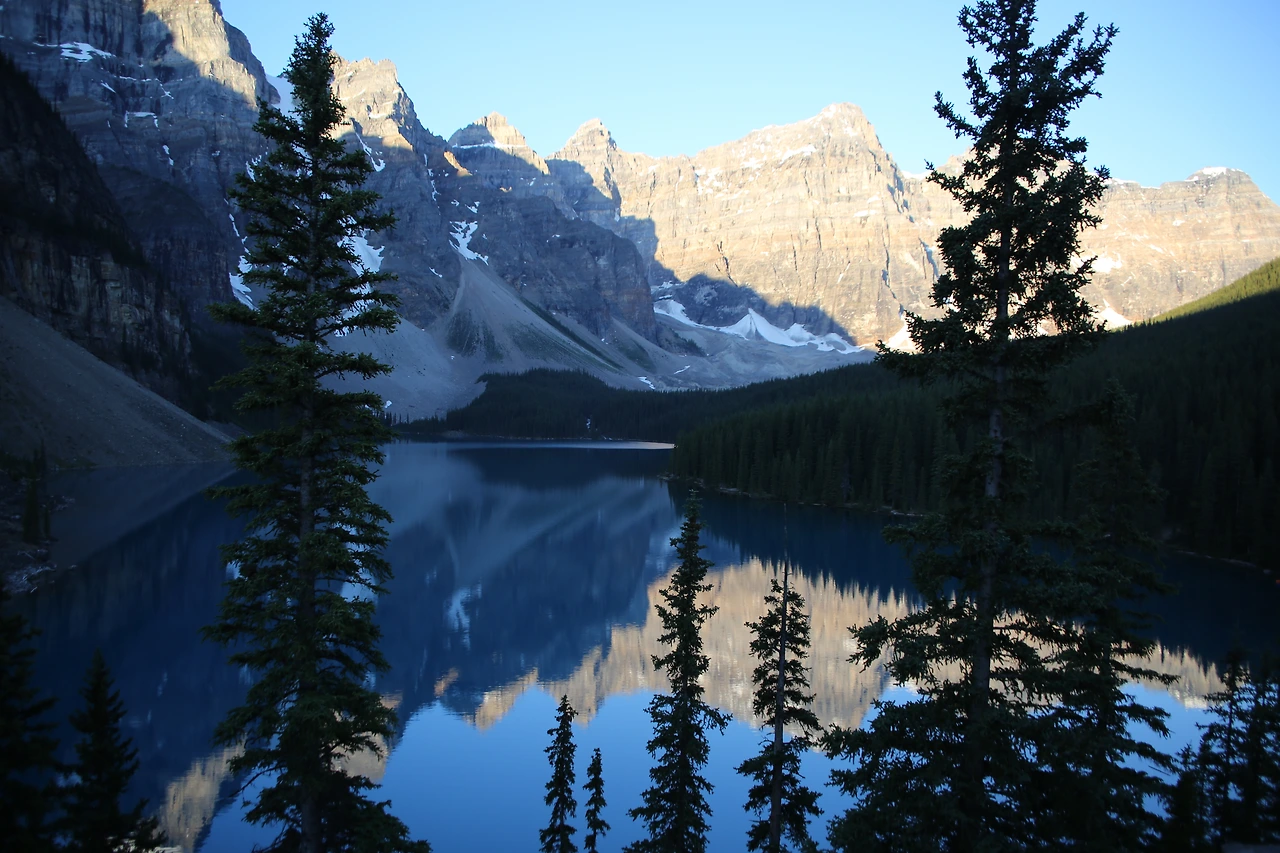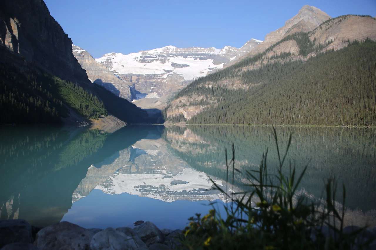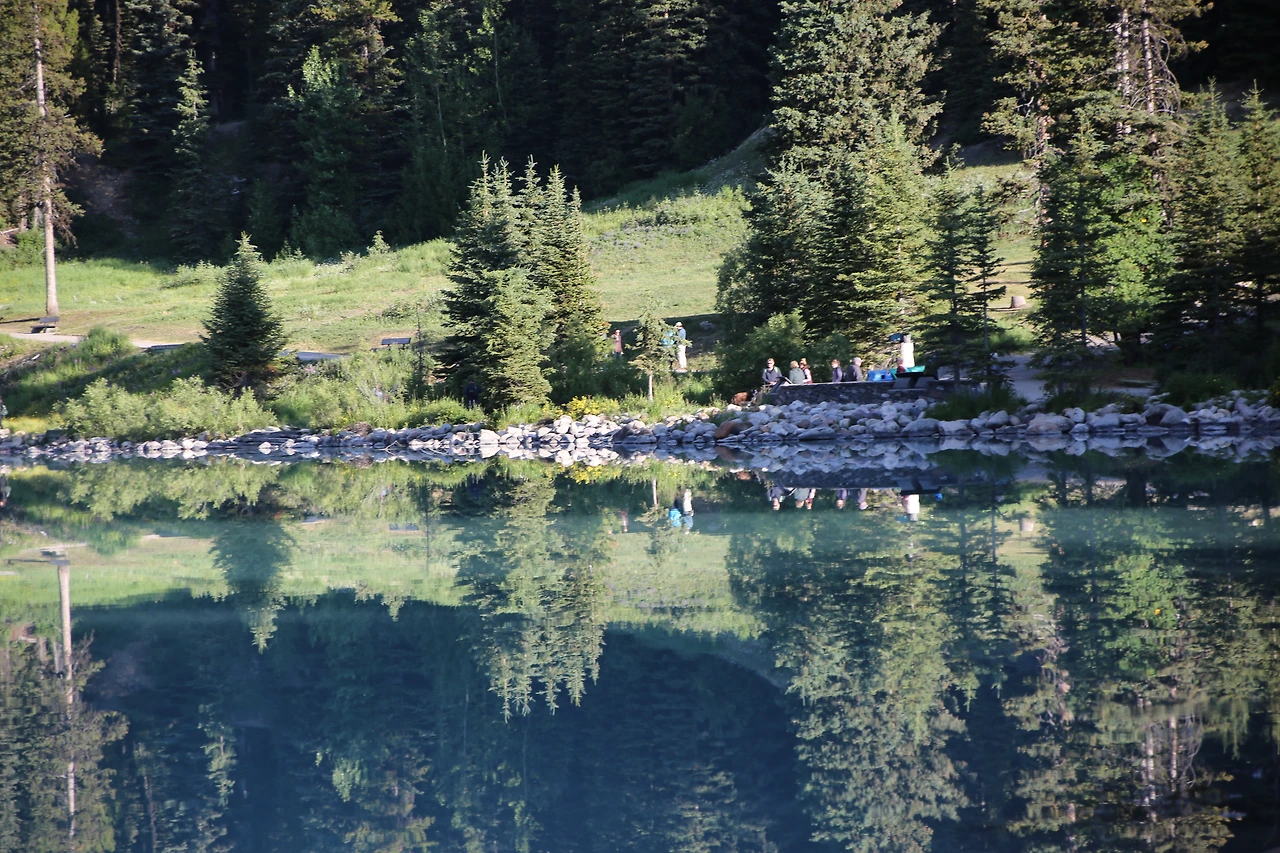 돌산에서 내려와 호수의 산책로를 따라 걷다 보니 어느새 사람들이 많아지기 시작했어요. 그러기도 할 것이 모레인 호수의 오픈 시기는 4월에서 10월이지만 6월까지 호수가 얼어있는 상황이라 호수의 아름다운 물빛을 보기 어렵기 때문입니다. 성수기인 7-8월엔 많은 사람이 몰려들기 때문에 아침 일찍 아니면 저녁 늦게 가는 게 최선이라는 것이지요. 이제 다시 레이크 루이스로 가는 길, 나와는 반대로 모레인으로 들어오느 자동차들이 꼬리에 꼬리를 물고 있습니다. 레이크 루이스에 도착하니 구름 한 점 없이 파한 하늘입니다. 호수는 순하디 순한 얼굴로 산과 나무를 물속에 그대로 품고 있습니다. 완벽한 대칭, 어딜 보나 데칼코마니였어요.