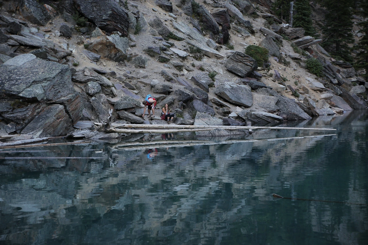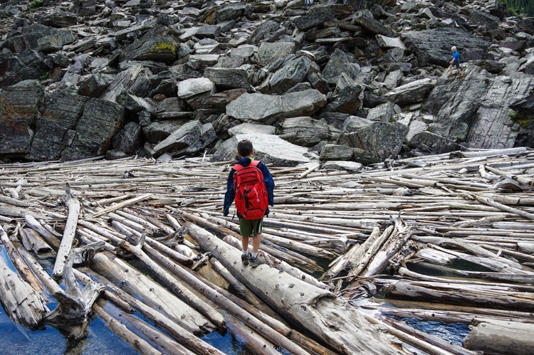 모레인을 선택한 시점은 옳았습니다. 호수가 거의 텅 비어있어요. 주차를 하자마자 망설임 없이 락 파일 트레일 쪽으로 향했습니다. 둥둥 떠있는 고사목을 불안하게 밟지 않고 산으로 오르는 길이 따로 있었음입니다. 작은 다리를 건너고 나무 계단과 돌계단으로 오르는 길은 무난했습니다. 약 300m쯤 올라가니 호수 전체가 내려다 보였어요.