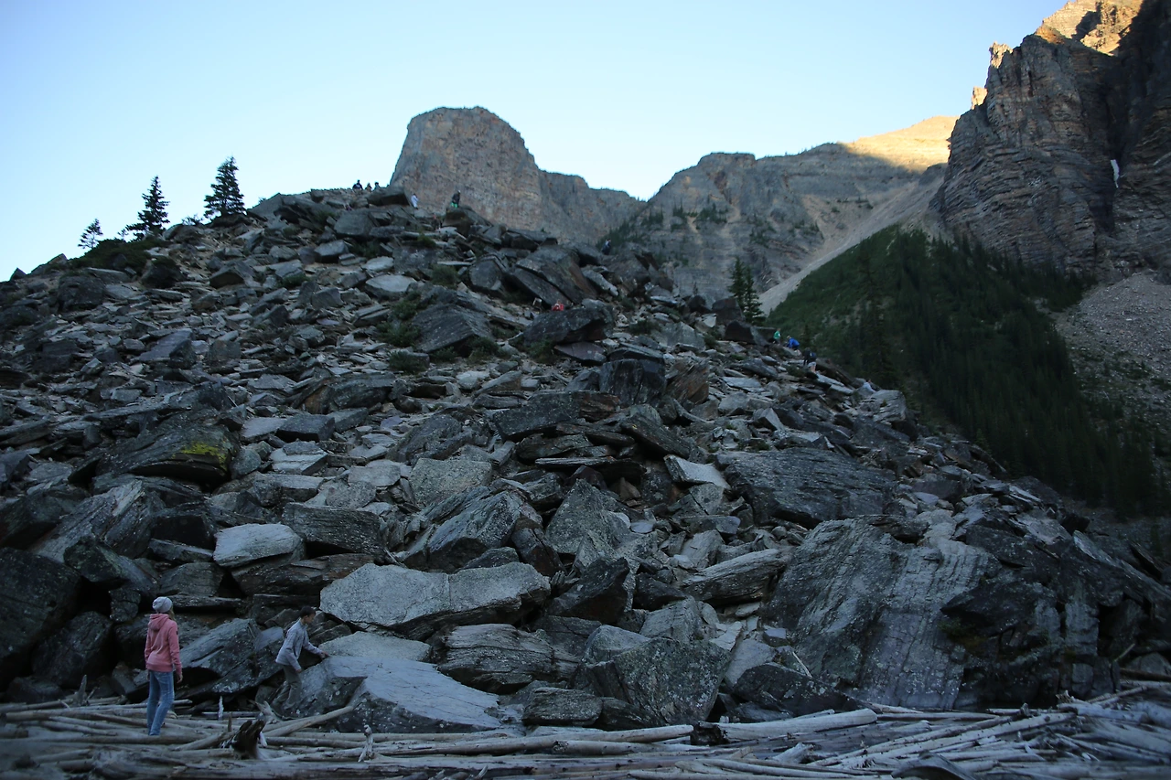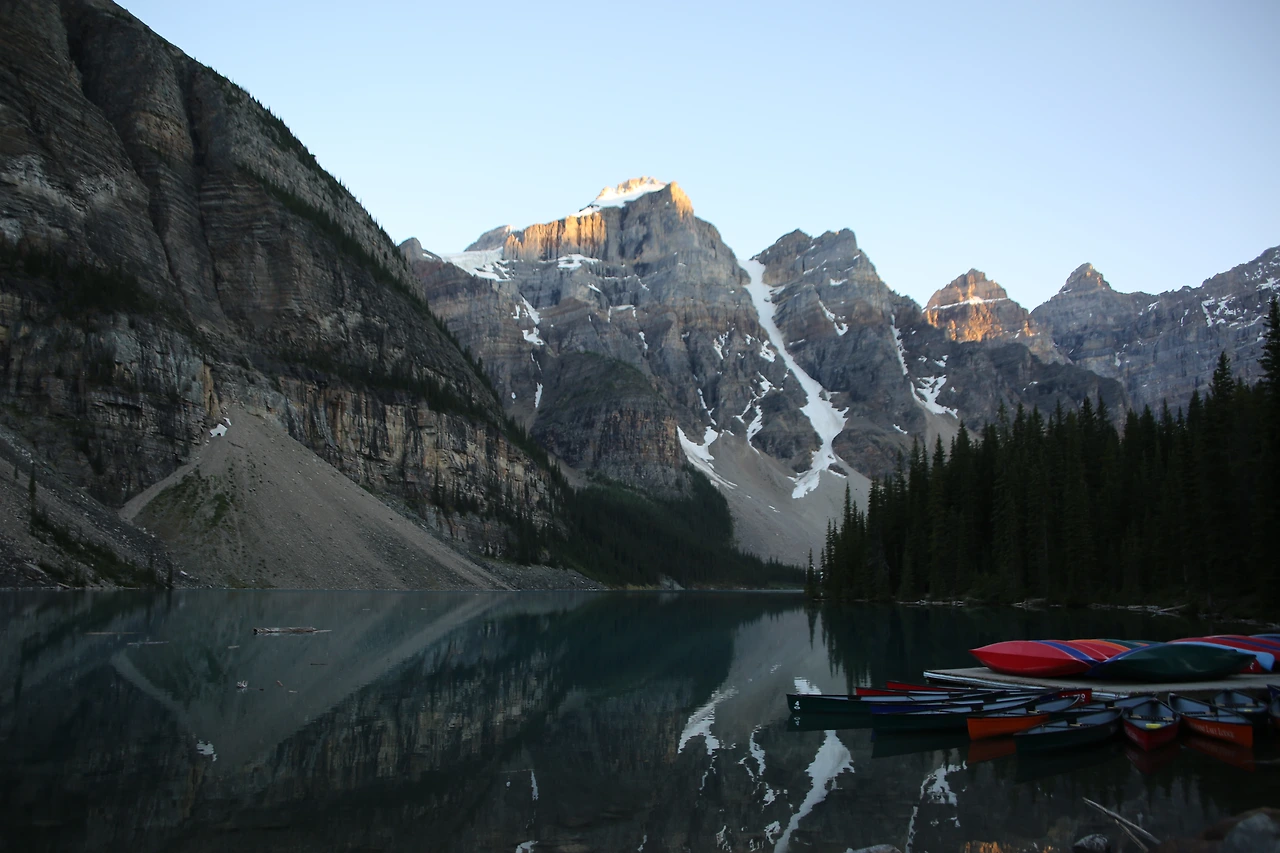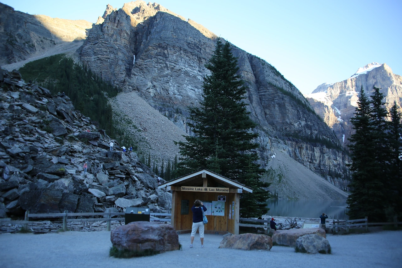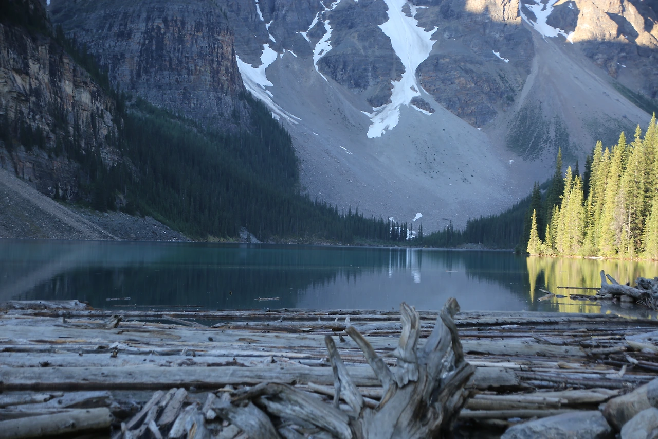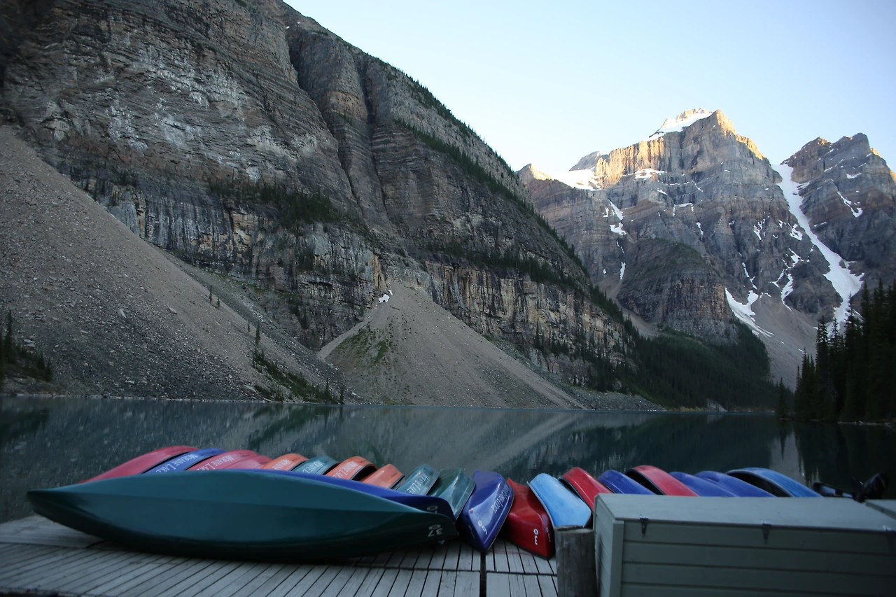 호수를 둘러싸고 있는 봉우리 끝에 금빛 햇살이 아슬아슬 걸려 있습니다. 사진을 찍기엔 조금 아쉬운 빛입니다. 빅토리아 산을 배경으로 얌전하게 엎드린 듯한 루이스 호수가 여성이라면 모레인은 상남자 같은 느낌이 들어요. 병풍처럼 뾰족한 산들에 둘러싸여 있는 것도 그렇지만 방금이라도 흘러내릴 듯한 암석 가루가 피라미드 모양으로 드라마틱하게 펼쳐져 있어요. 호수의 남쪽에는 돌과 바위로 만들어진 돌산인 락 파일 (Rockpile)이 있습니다. 그곳에 올라가야 제대로 된 호수의 사진을 오롯이 찍을 수 있다는 글을 읽었습니다. 떠내려온 고사목들이 둥둥 떠있는데 그걸 밟고 호수를 건너야 그곳에 올라갈 수 있는가 봅니다. 울퉁불퉁한 돌 산 위엔 이미 많은 사람들이 올라가 있었고 물 위에서 힘없이 구르는 통나무를 아슬아슬하게 밟고 돌산에 오르는 사람들도 보였지요. 분명 그곳에 올라가야 하는데 호수에 둥둥 떠 있는 나무를 밟고 건널 자신은 없었습니다. 자세히 보니 아주 어린아이도 그 산 위에 올라가 있는 게 보이더군요. 분명 어딘가 제대로 된 길이 있으리라는 생각이 들었습니다. 색색의 물감처럼 가지런히 놓여있는 카누 옆에 앉아 해의 꼬리를 보았지요. 로키의 하루는 몇 개의 계절이 서로 시비를 가리듯 새벽과 저녁이 달랐습니다. 낮과 다른 얼굴의 저녁이 밤으로 갈 채비를 하느라 쌀쌀해지더군요. 다음 날 새벽, 반영 사진을 기대하며 숙소로 향했습니다.