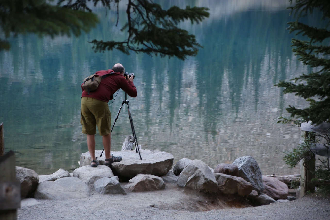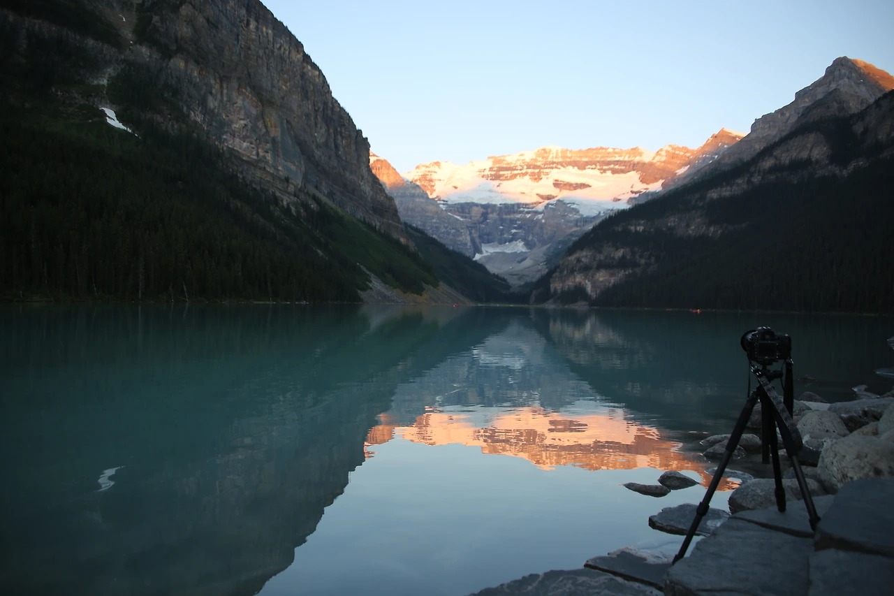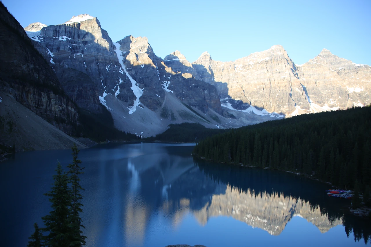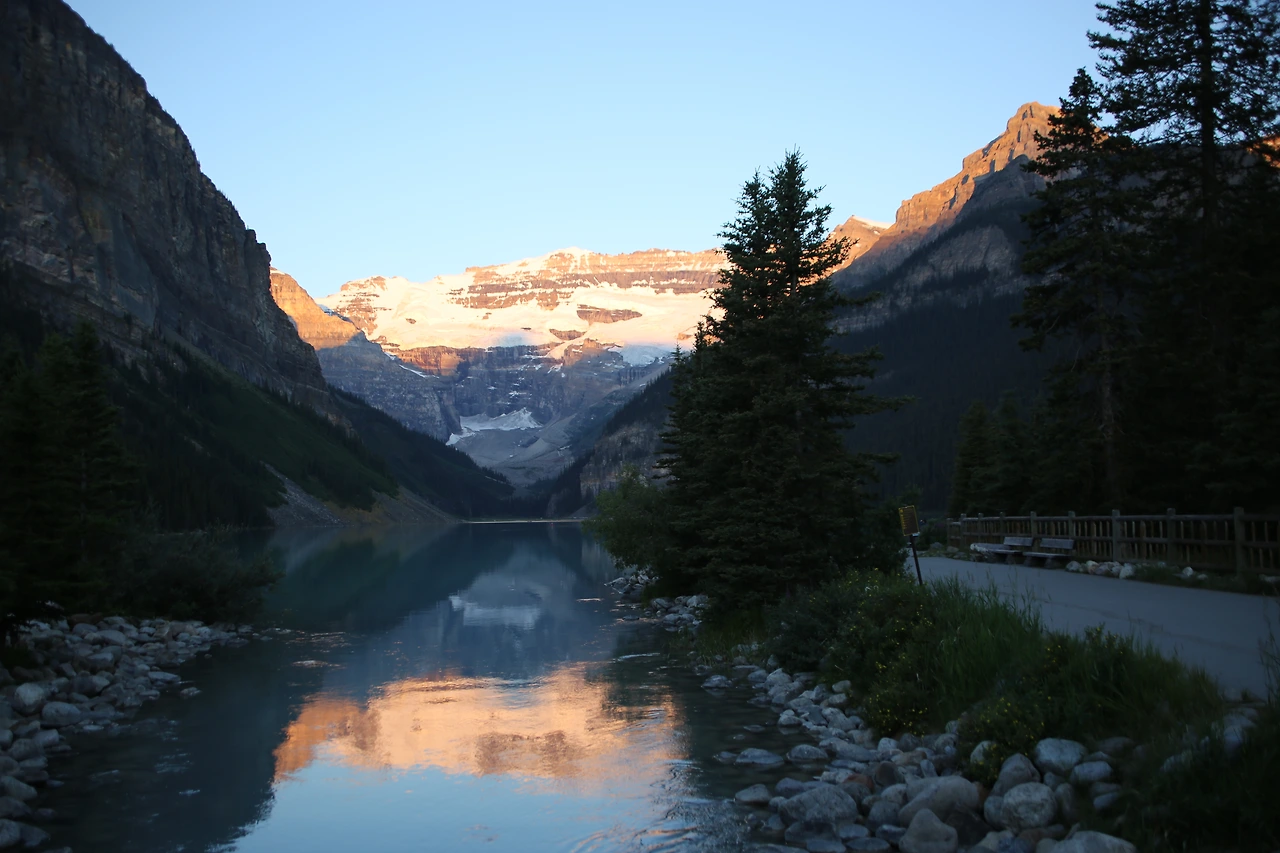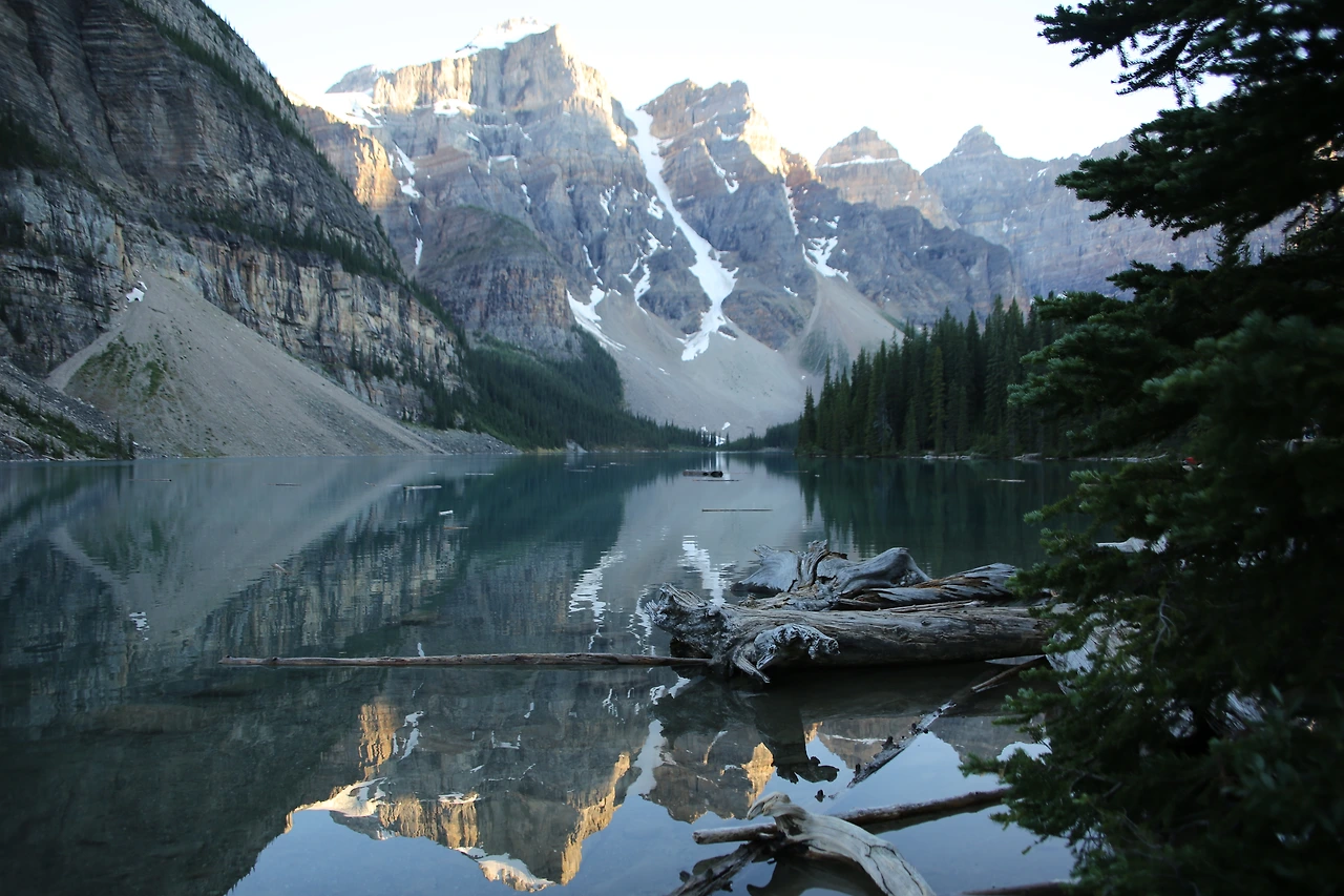 호수를 둘러싸고 있는 봉우리 끝에 금빛 햇살이 아슬아슬 걸려 있습니다. 사진을 찍기엔 조금 아쉬운 빛입니다. 빅토리아 산을 배경으로 얌전하게 엎드린 듯한 루이스 호수가 여성이라면 모레인은 상남자 같은 느낌이 들어요. 병풍처럼 뾰족한 산들에 둘러싸여 있는 것도 그렇지만 방금이라도 흘러내릴 듯한 암석 가루가 피라미드 모양으로 드라마틱하게 펼쳐져 있어요. 호수의 남쪽에는 돌과 바위로 만들어진 돌산인 락 파일 (Rockpile)이 있습니다. 그곳에 올라가야 제대로 된 호수의 사진을 오롯이 찍을 수 있다는 글을 읽었습니다. 떠내려온 고사목들이 둥둥 떠있는데 그걸 밟고 호수를 건너야 그곳에 올라갈 수 있는가 봅니다. 울퉁불퉁한 돌 산 위엔 이미 많은 사람들이 올라가 있었고 물 위에서 힘없이 구르는 통나무를 아슬아슬하게 밟고 돌산에 오르는 사람들도 보였지요. 분명 그곳에 올라가야 하는데 호수에 둥둥 떠 있는 나무를 밟고 건널 자신은 없었습니다. 자세히 보니 아주 어린아이도 그 산 위에 올라가 있는 게 보이더군요. 분명 어딘가 제대로 된 길이 있으리라는 생각이 들었습니다. 색색의 물감처럼 가지런히 놓여있는 카누 옆에 앉아 해의 꼬리를 보았지요. 로키의 하루는 몇 개의 계절이 서로 시비를 가리듯 새벽과 저녁이 달랐습니다. 낮과 다른 얼굴의 저녁이 밤으로 갈 채비를 하느라 쌀쌀해지더군요. 다음 날 새벽, 반영 사진을 기대하며 숙소로 향했습니다.