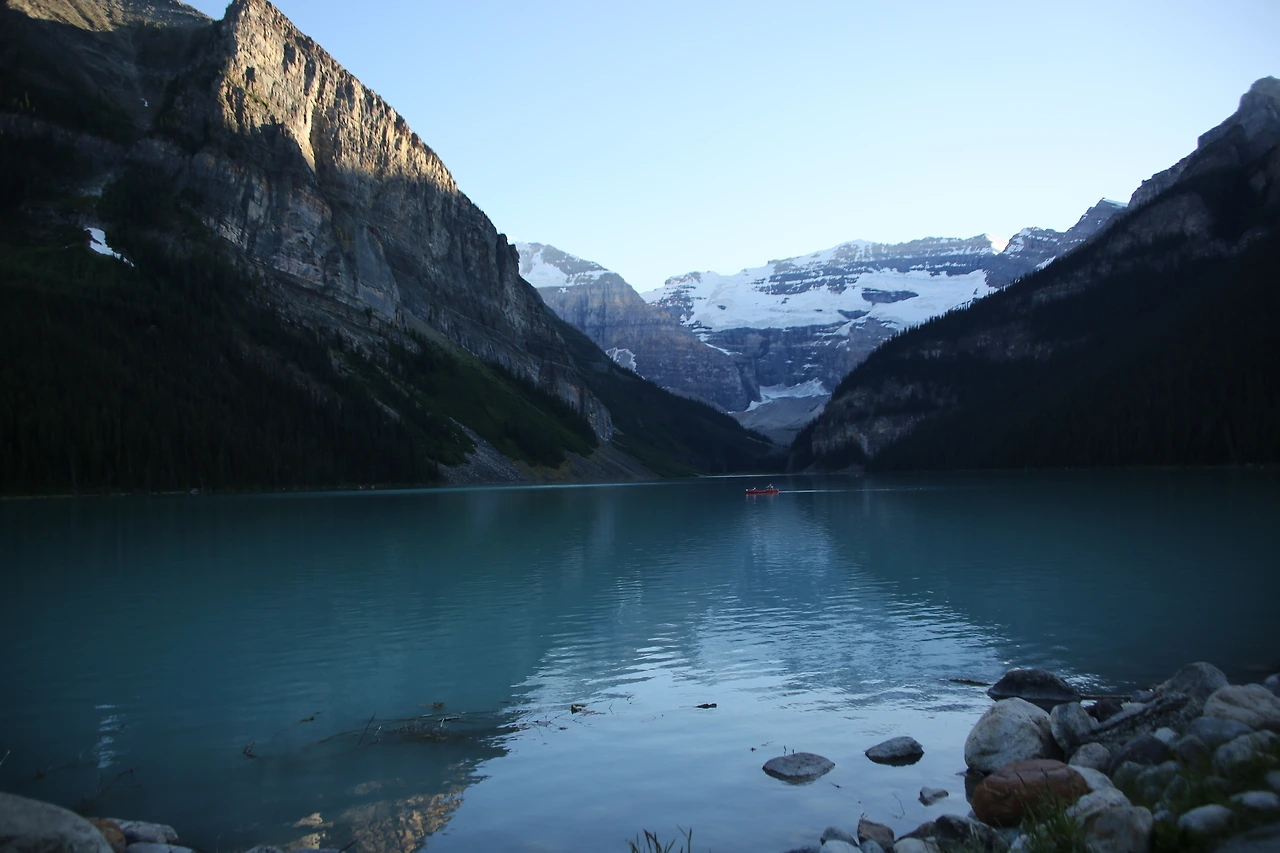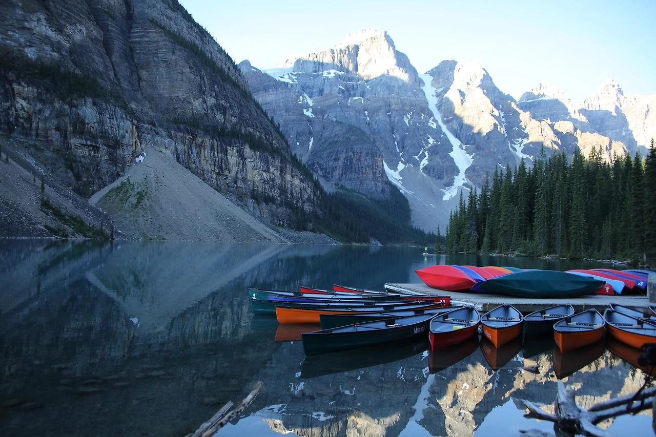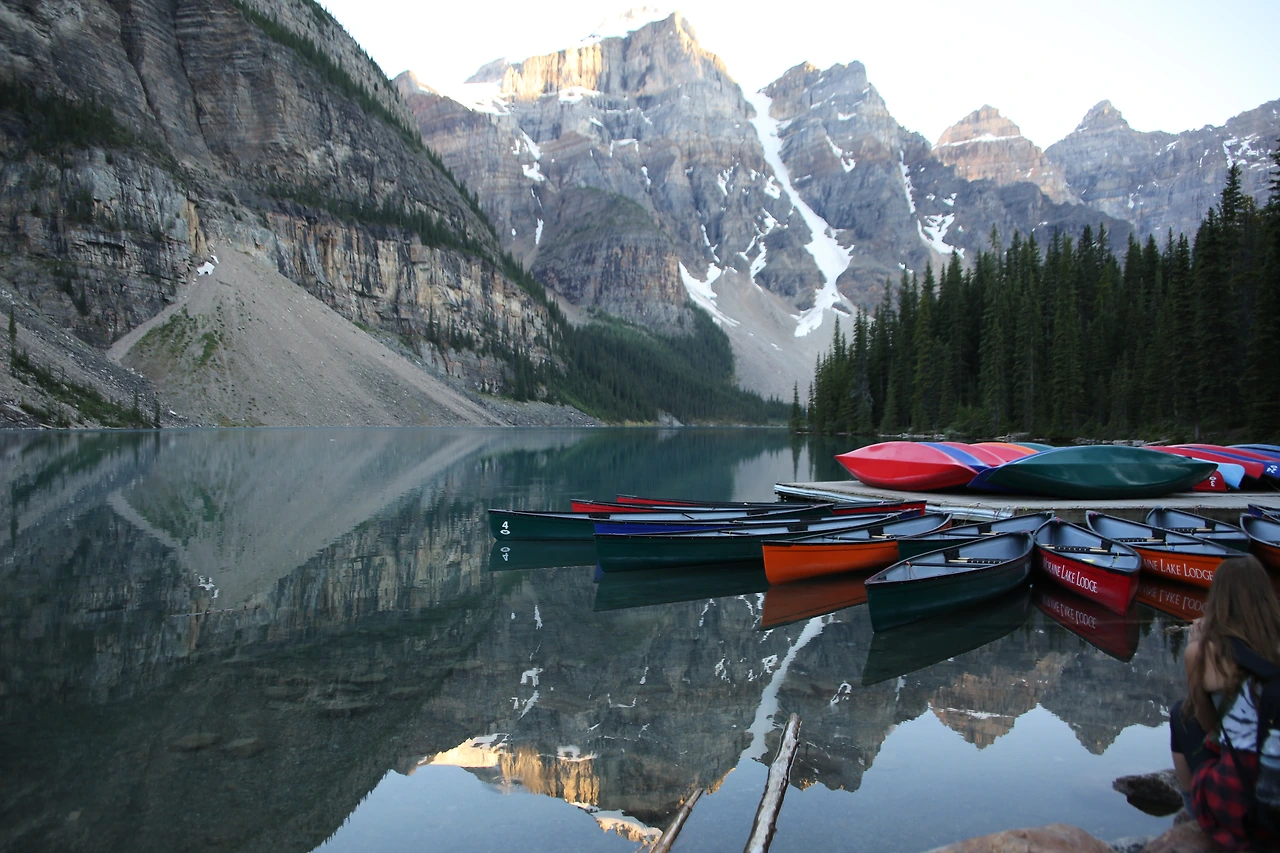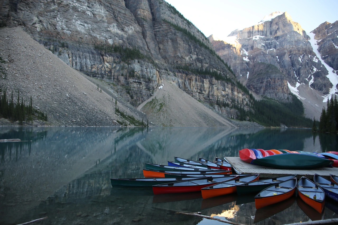 샘슨 몰에서 점심을 먹고 숙소를 찾아오던 중 모레인 호수의 이정표가 보였었지요. 그 옆의 이동식 LED 전광판에는 '모레인 호수 주차장 만차'라고 써진 글씨에 빨간 불이 켜있고 차량을 통제하는 사람들과 바리케이드가 있었지요. 그때가 3시쯤이었어요. 모레인 호수 역시 사람 앓이를 하는구나 싶었지요. 밴프에서 60km의 비교적 가까운 거리이다 보니 한 나절이면 다녀갈 수 있습니다. 밴프에서 재스퍼로, 또는 나처럼 재스퍼에서 밴프로 가던 중 들러야 하는 필수 코스이지요. 지금쯤 한가해졌을까? 하며 다시 찾은 루이스는 여전히 고요를 돌려받지 못하고 있습니다. 보트 운영 마감 시간에 맞춰서 열심히 노를 저어 보트 하우스로 향하는 빨간 카누들이 점점이 보였지요.